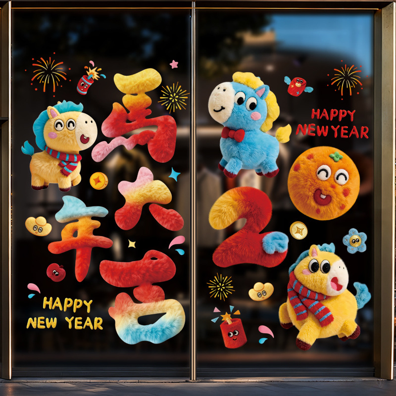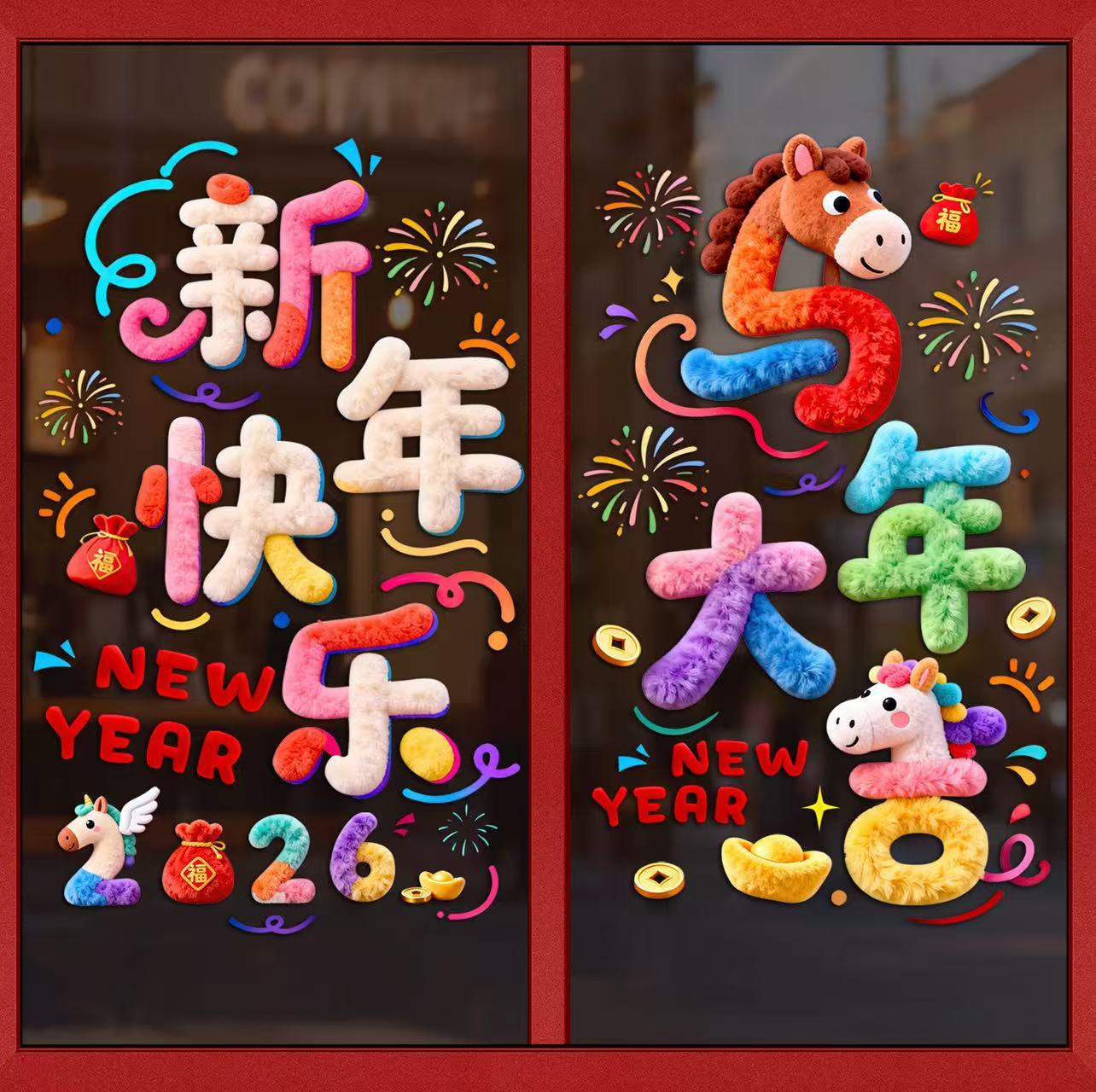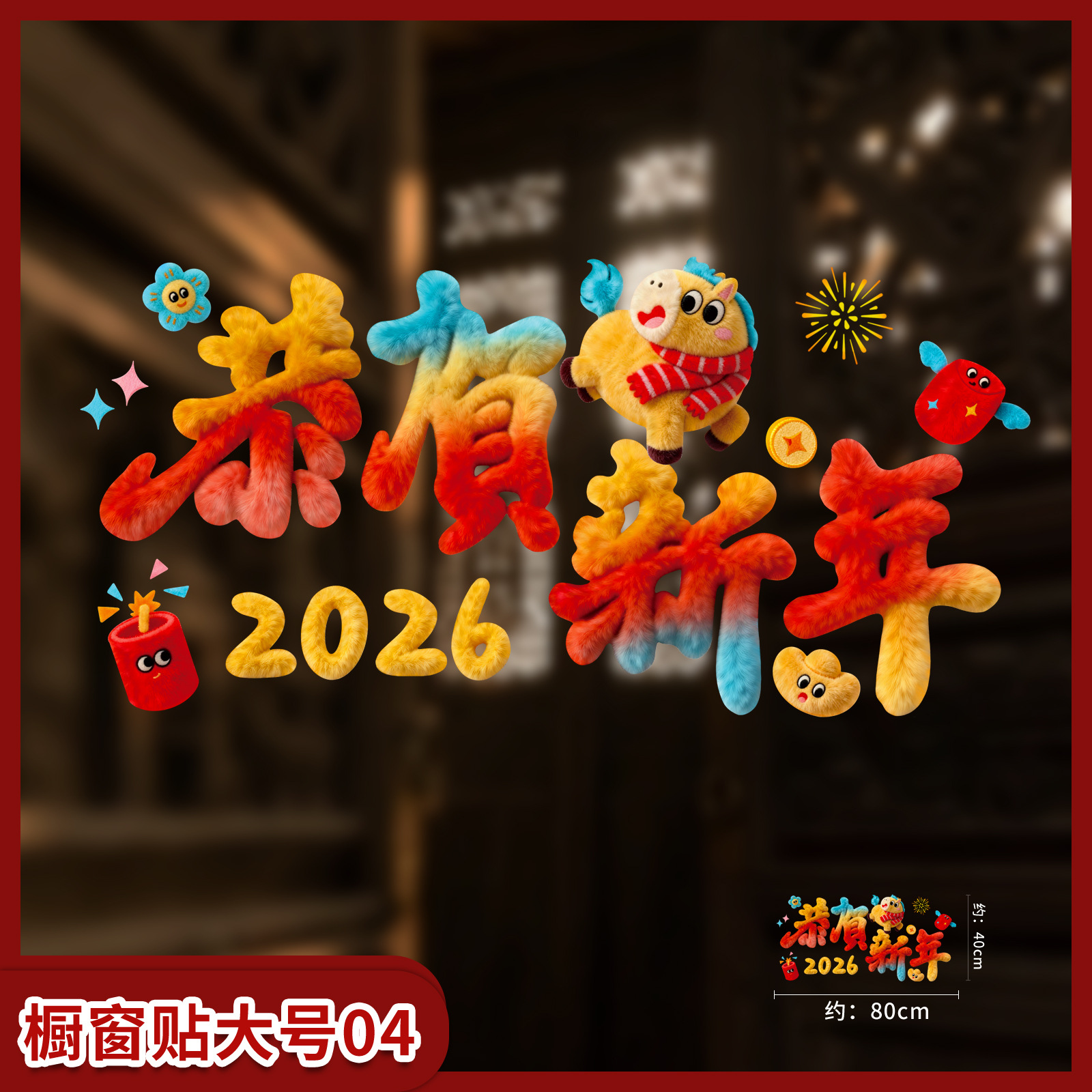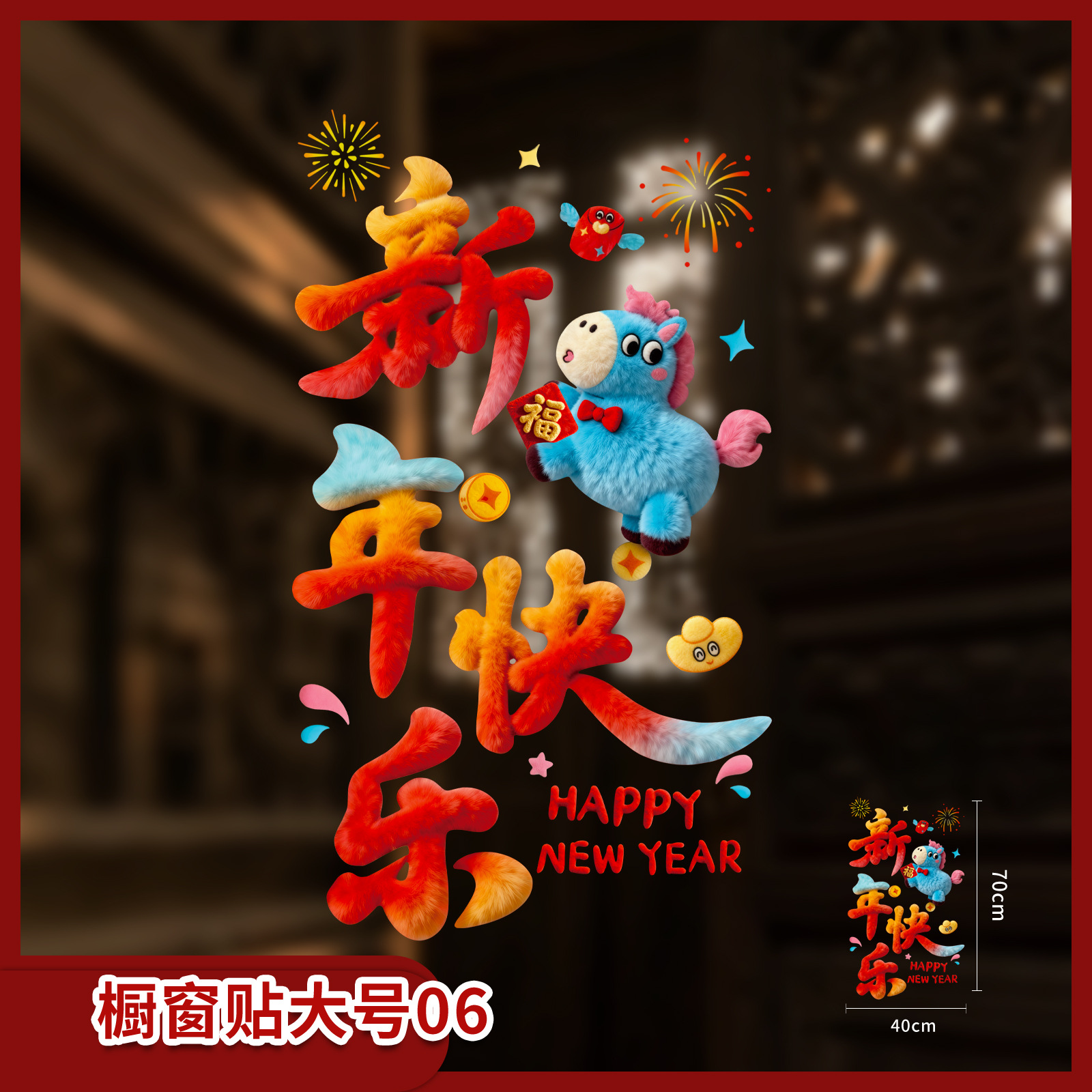2026新年5D毛绒效果静电贴毛绒效果玻璃贴春节橱窗玻璃贴纸窗花