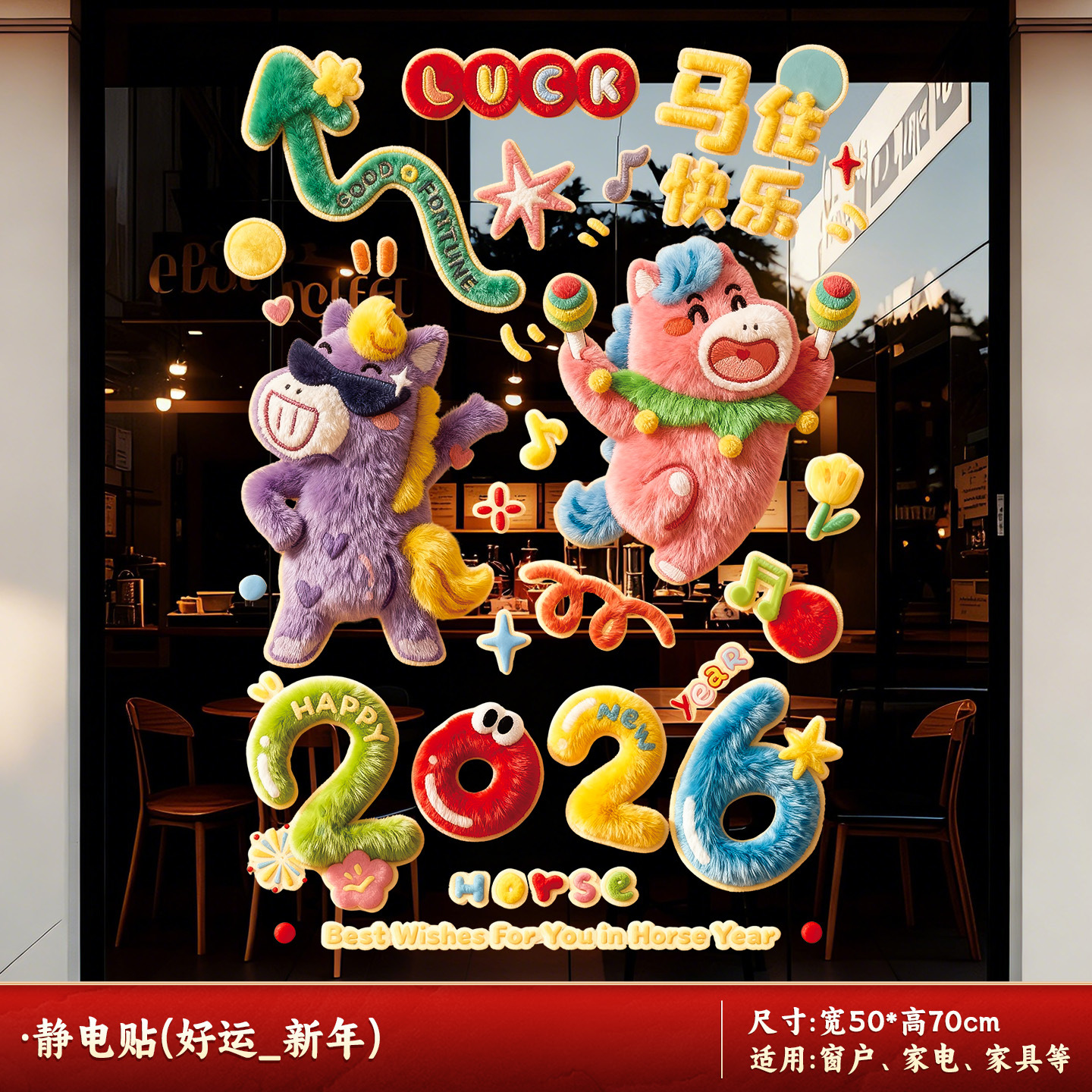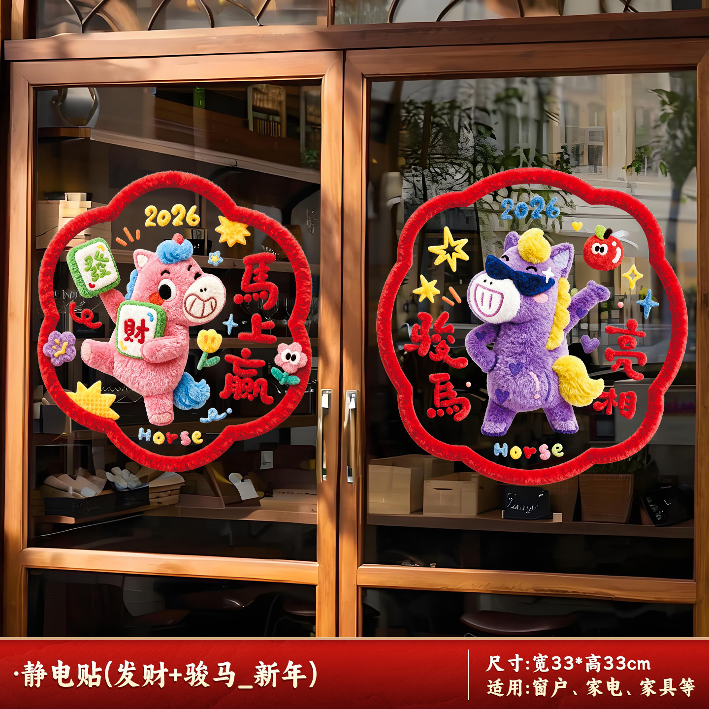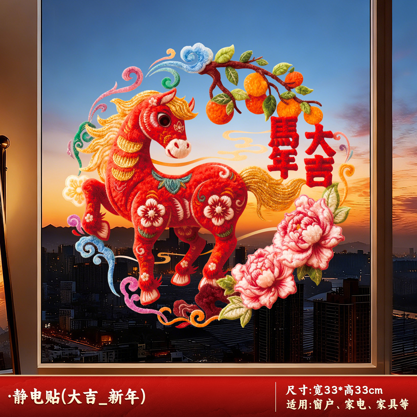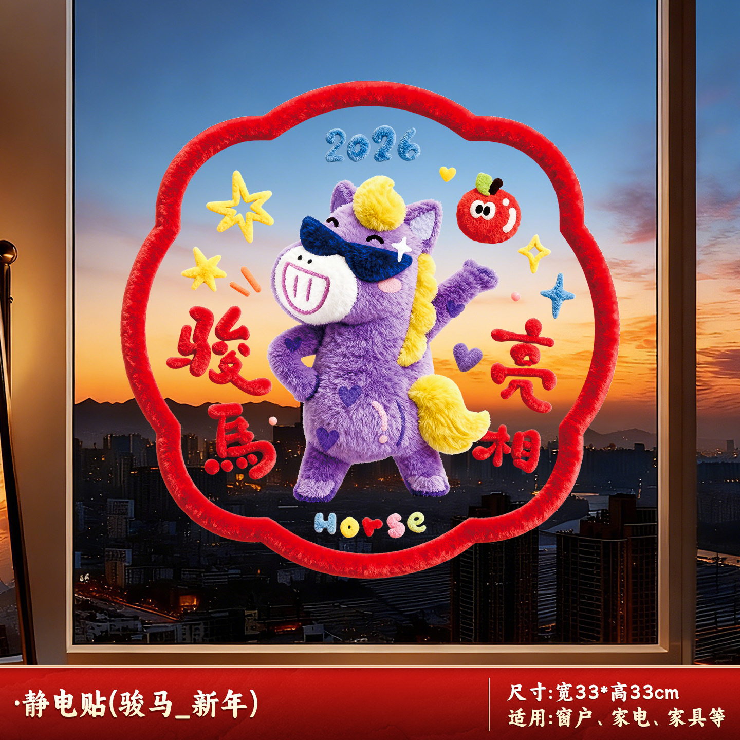 2026新款马年卡通窗花静电贴春节过年创意剪纸玻璃贴纸新年装饰品