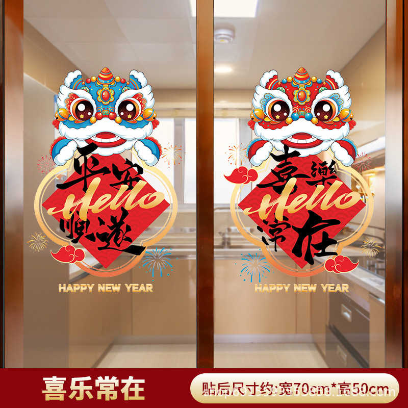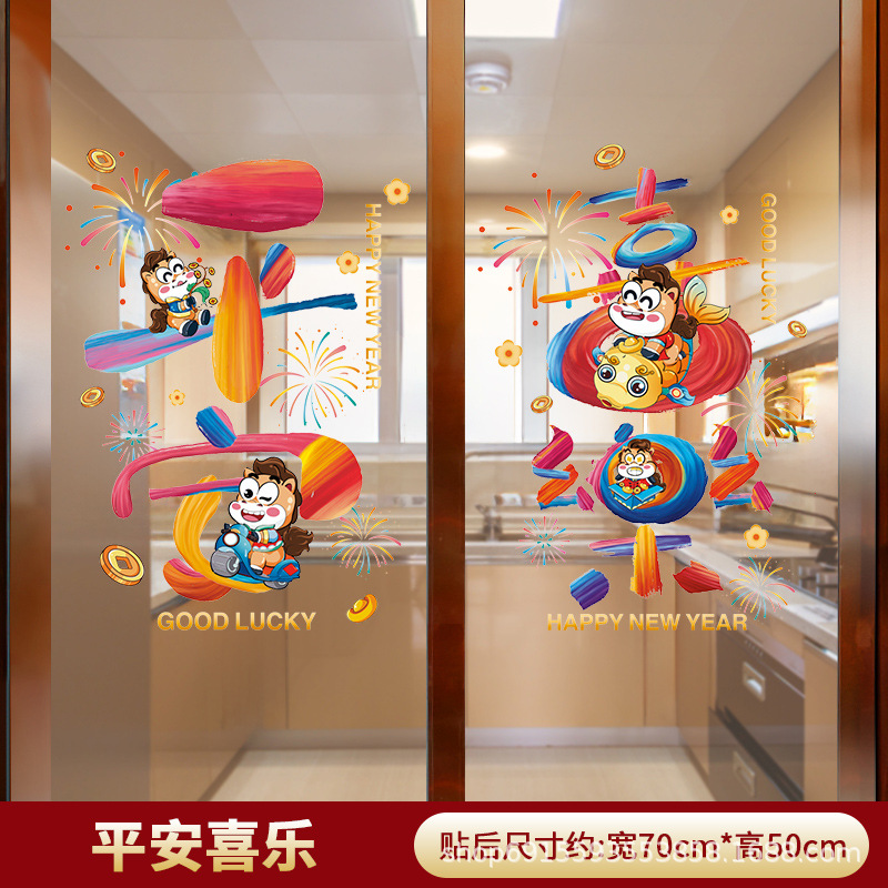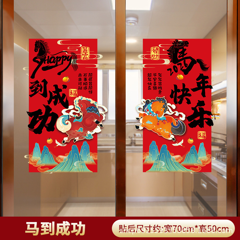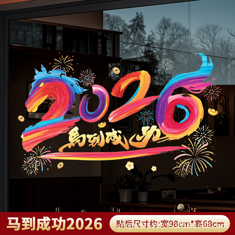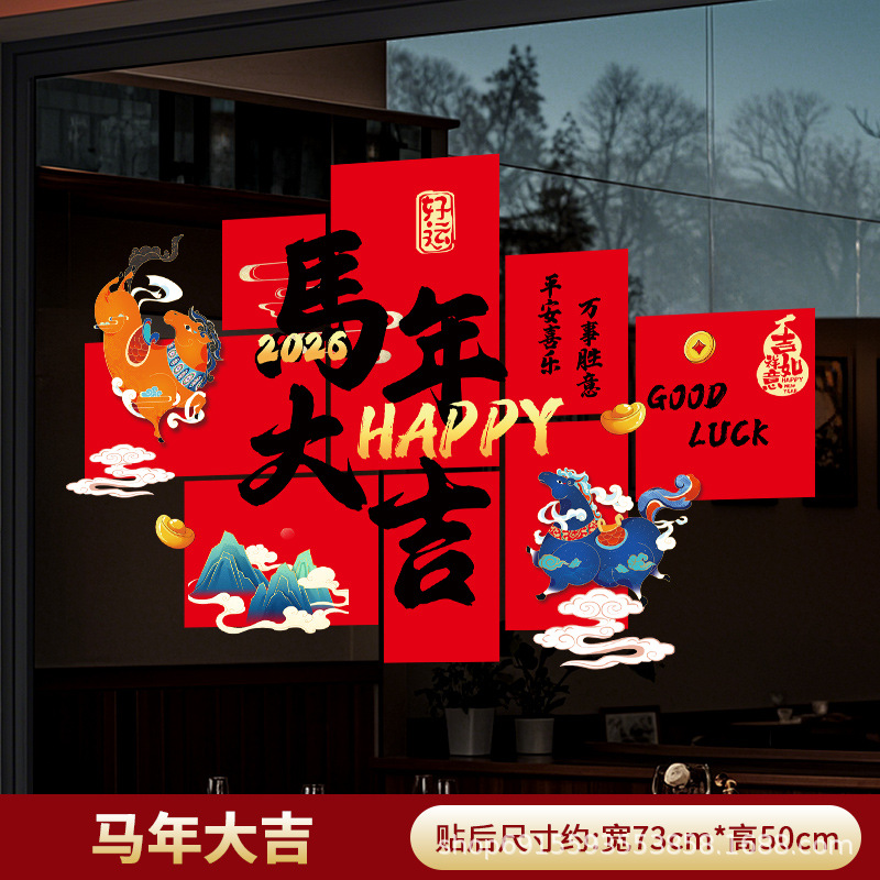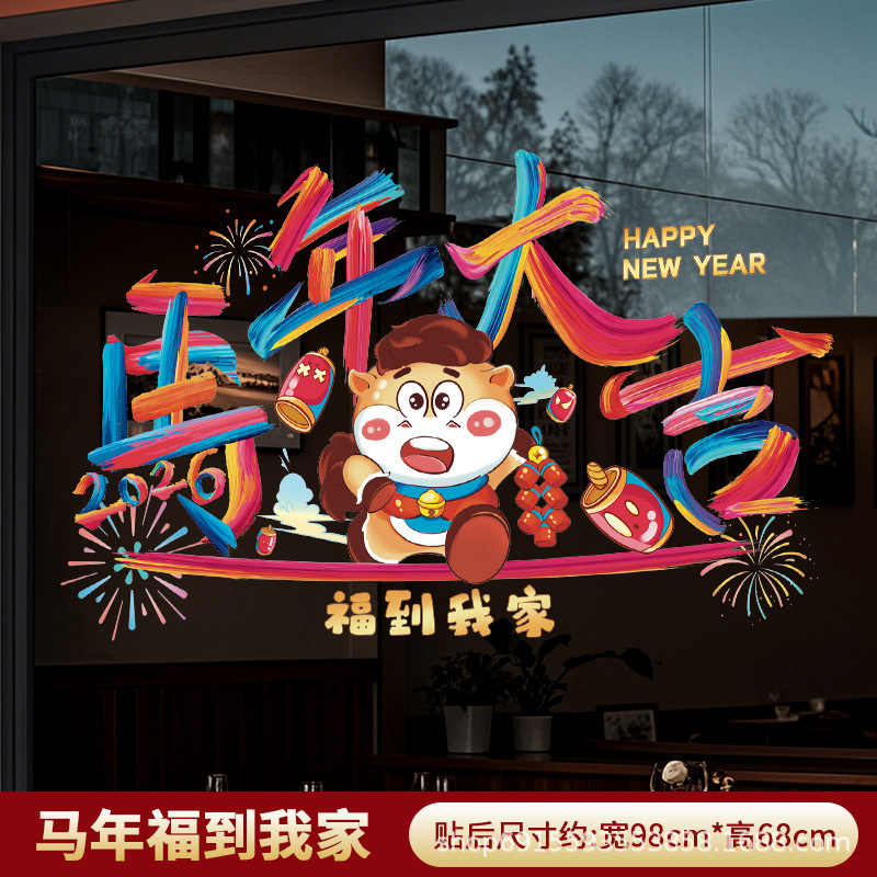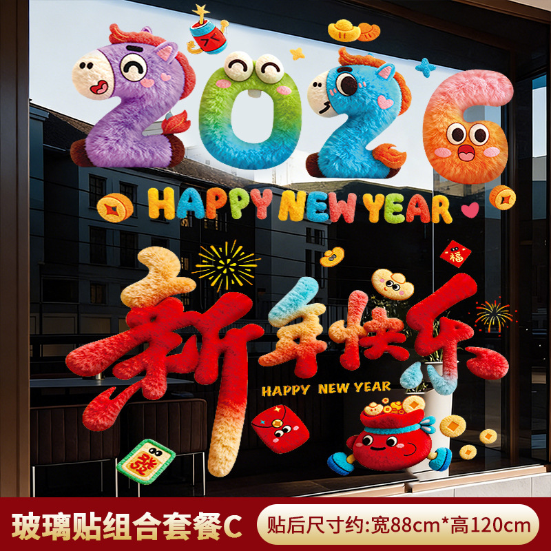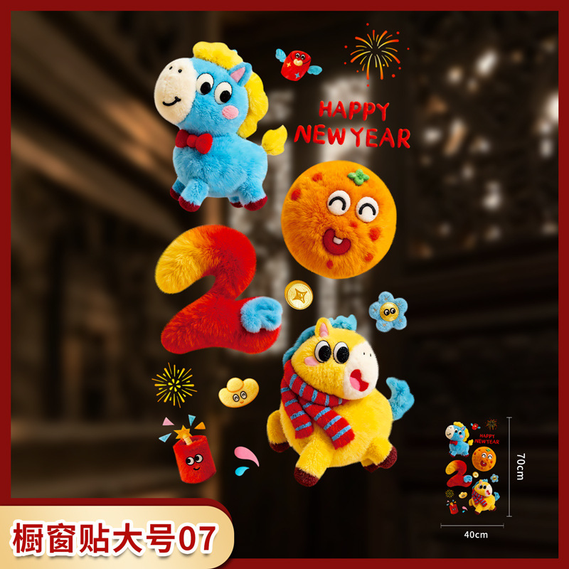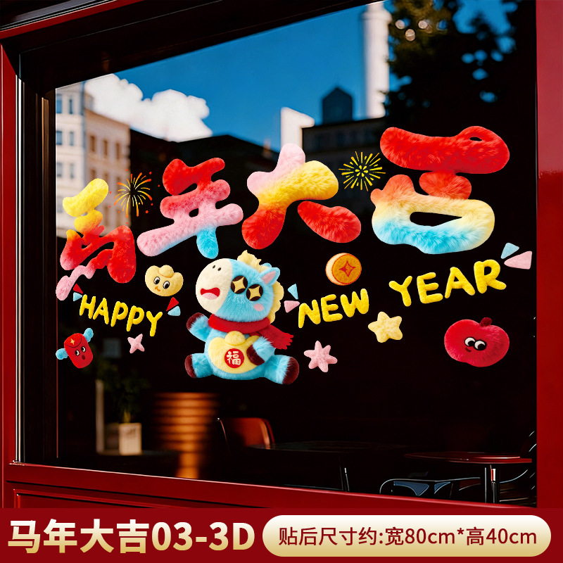 2026新款马年春节过年卡通5D毛绒橱窗玻璃贴新年装饰窗花静电贴