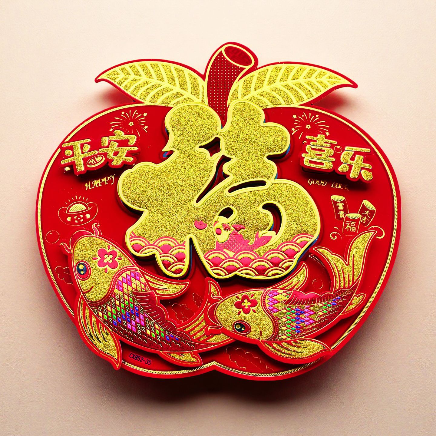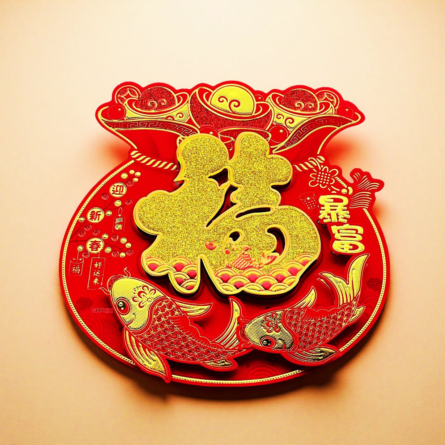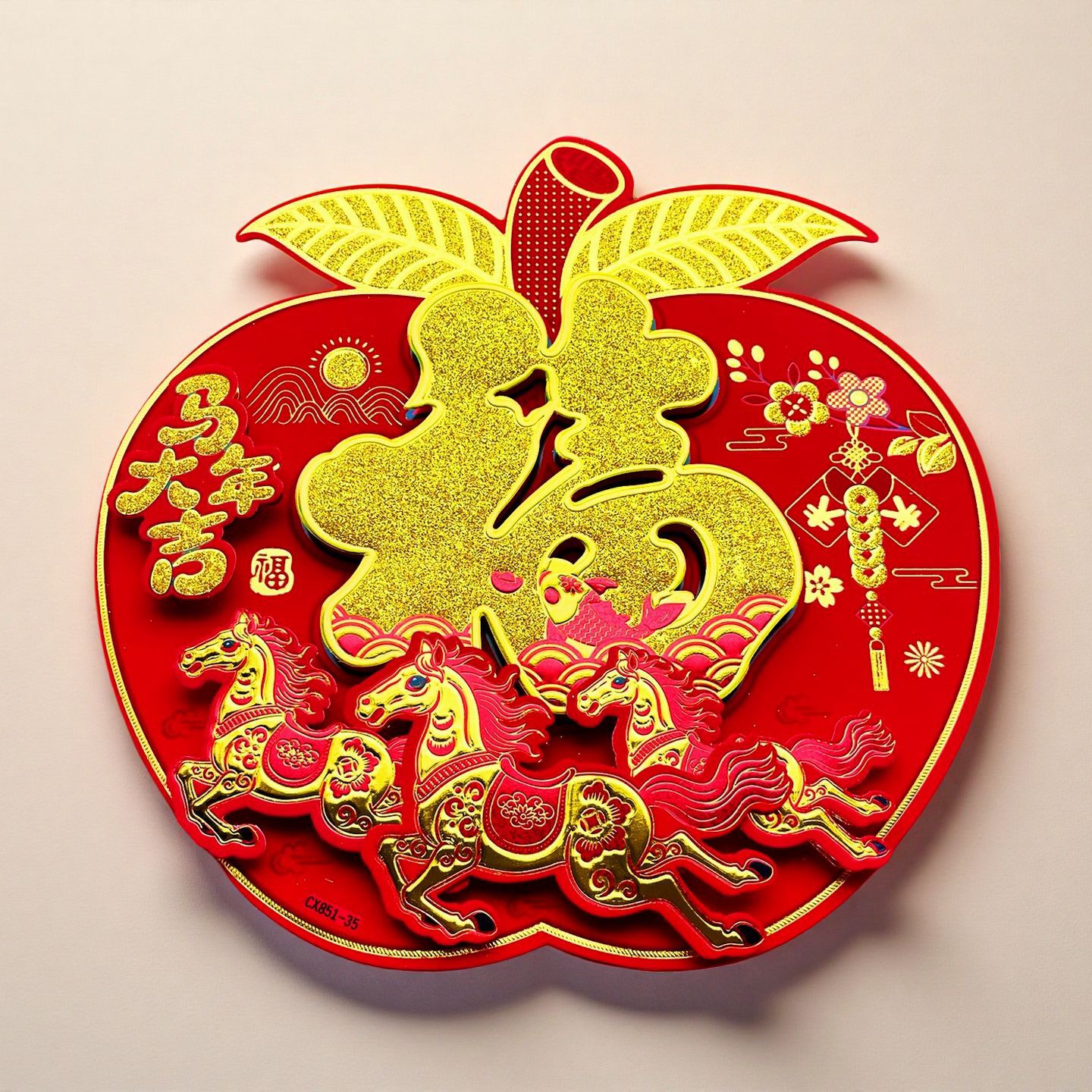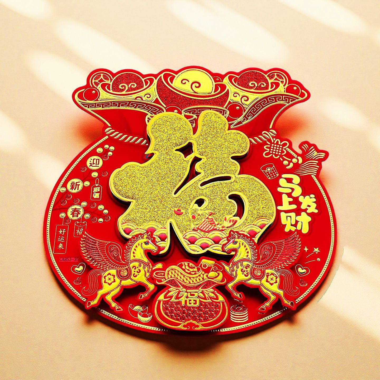 2026马年异形生肖立体植绒撒金福自带背胶福字苹果钱袋福门贴对联