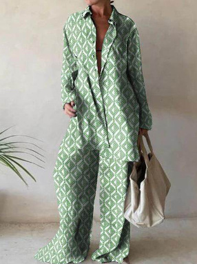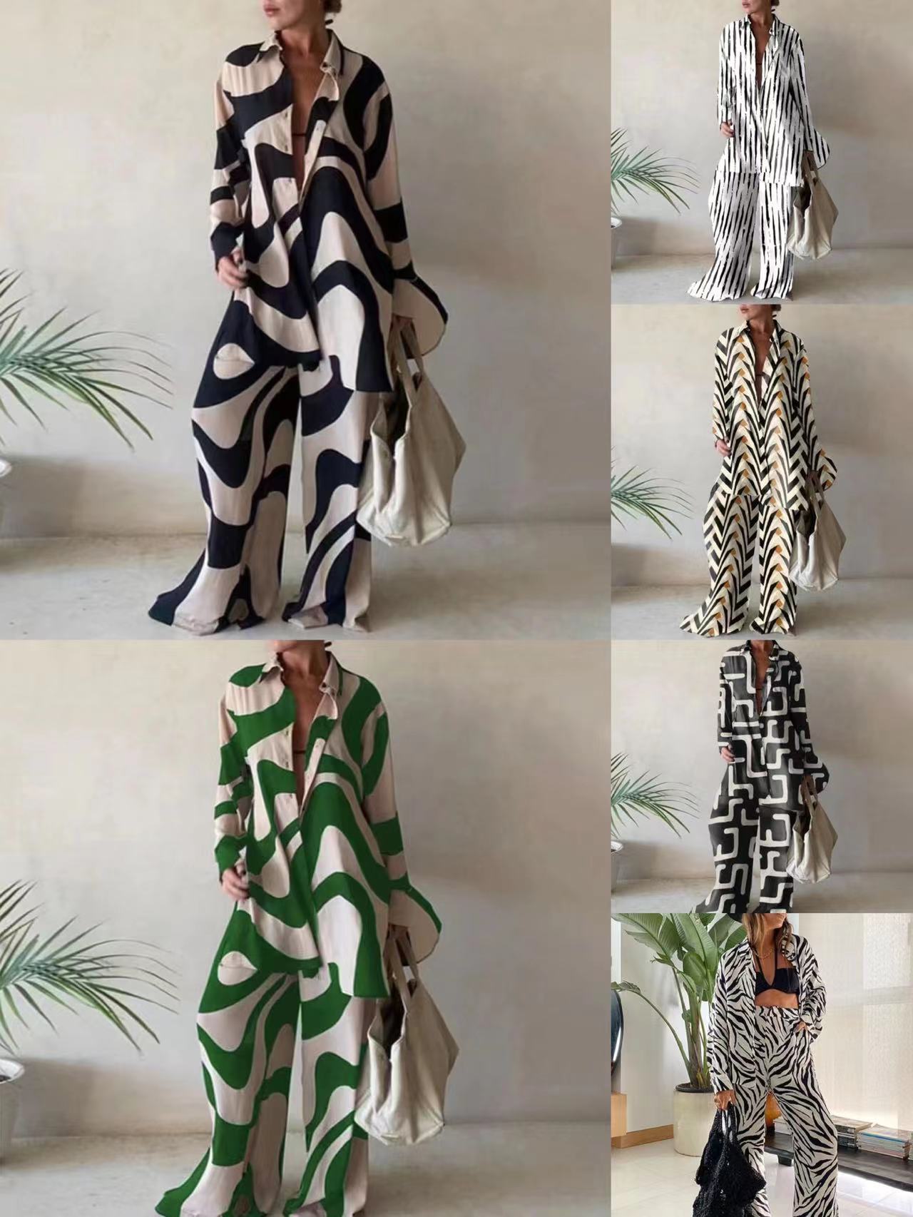 欧美新款印花套装宽松长袖加直筒连体裤连衣裙休闲度假厂家直销