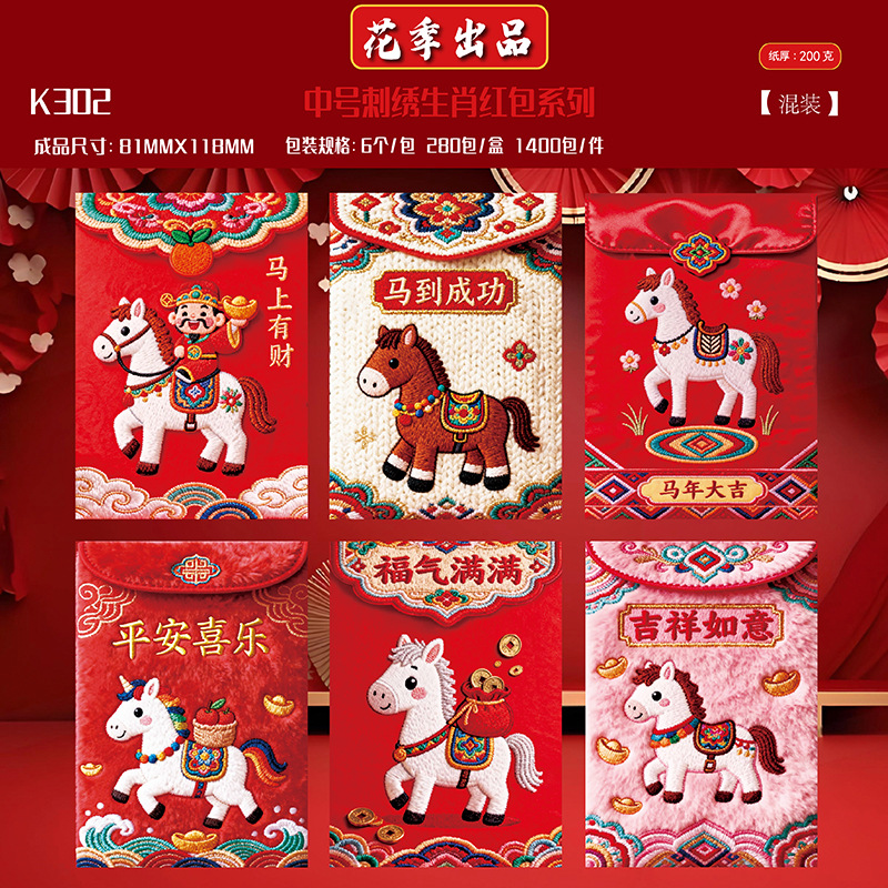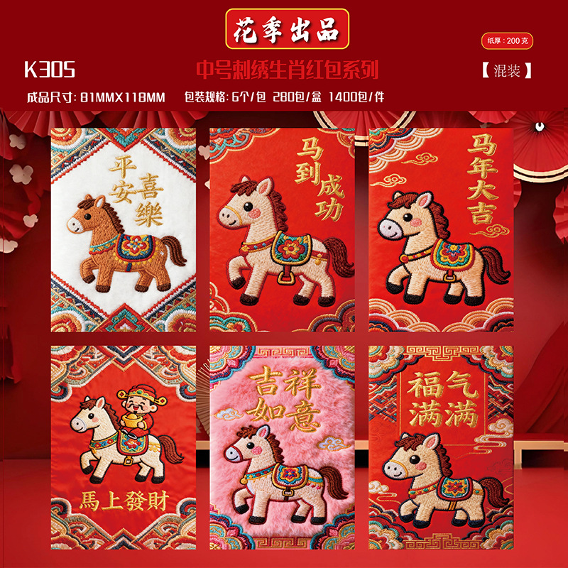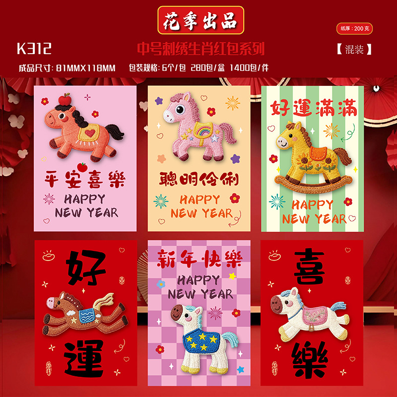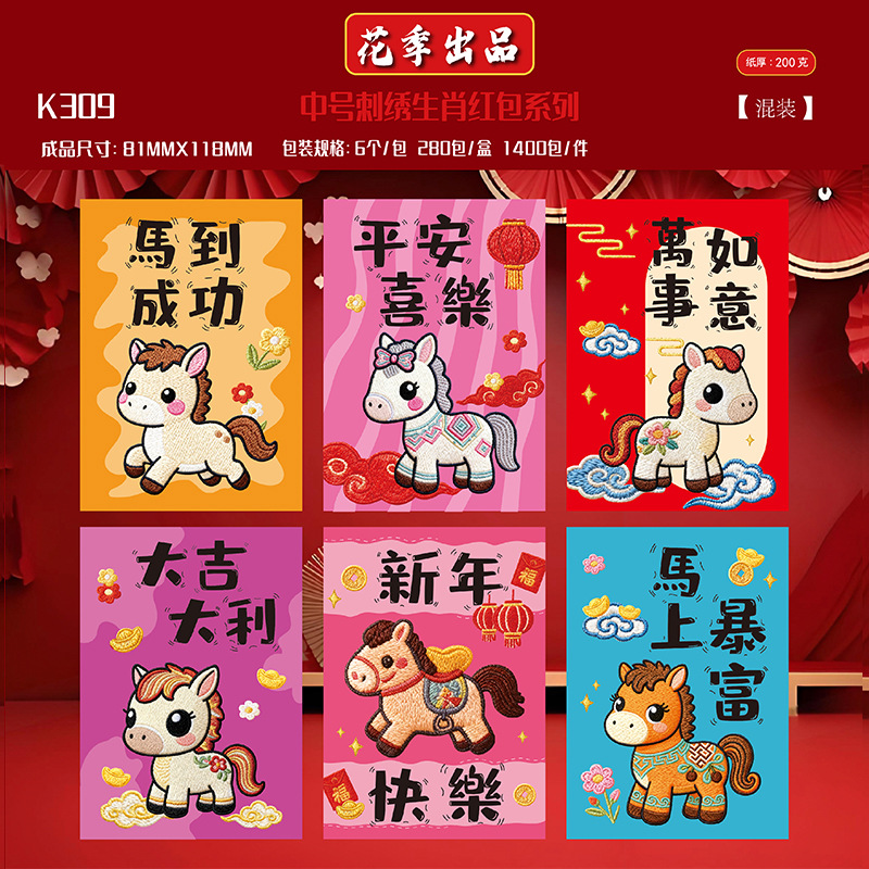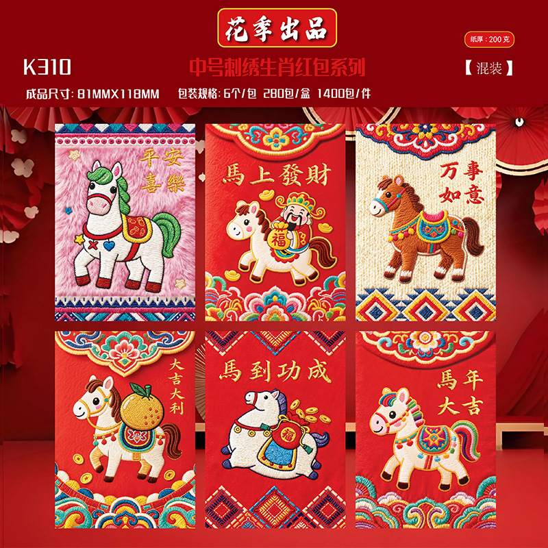 花季抖音同款2026马年仿真平面立体5D刺绣卡通福马红包创意压岁袋