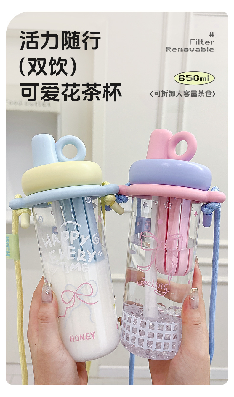 夏季大容量塑料杯小清新茶水分离花茶杯高颜值女生便携吸管杯水杯