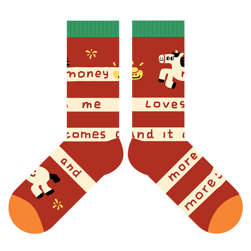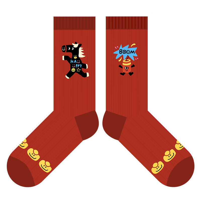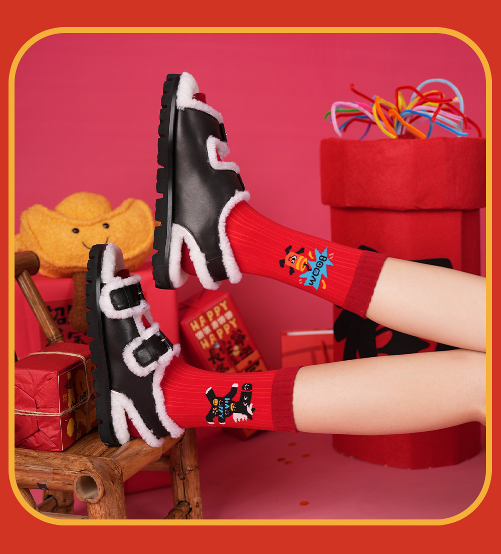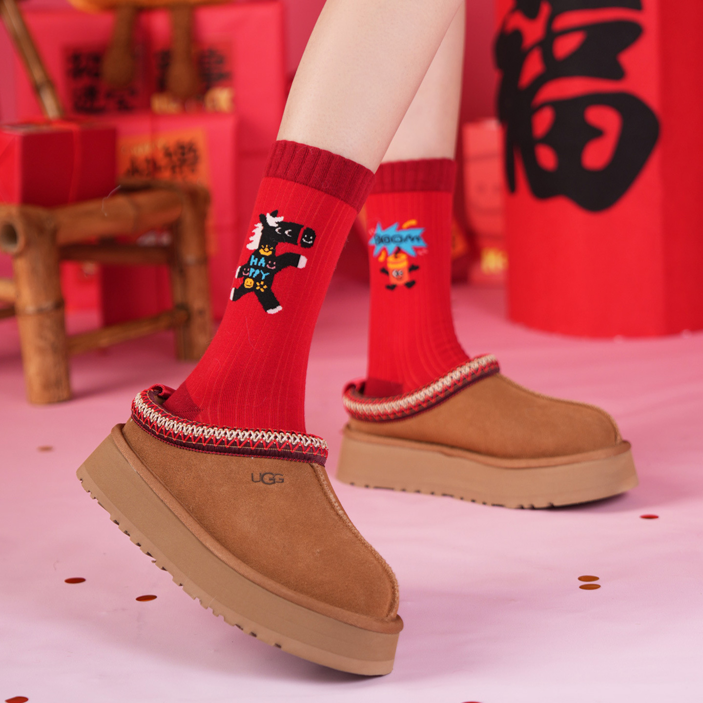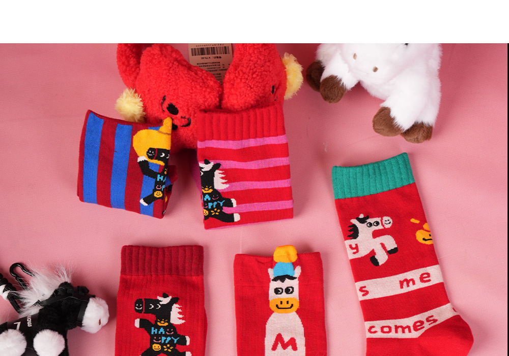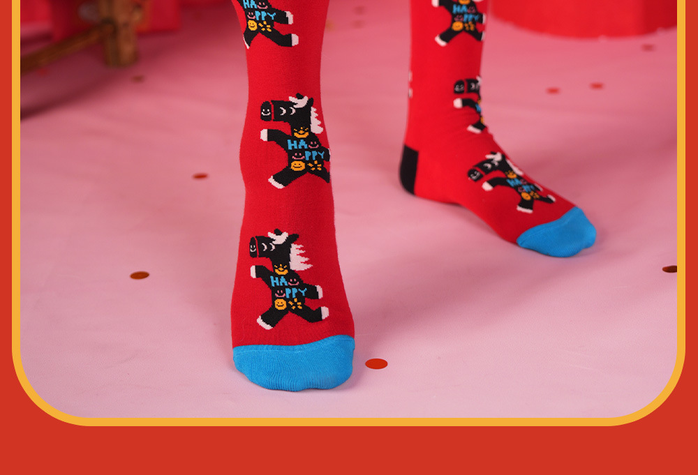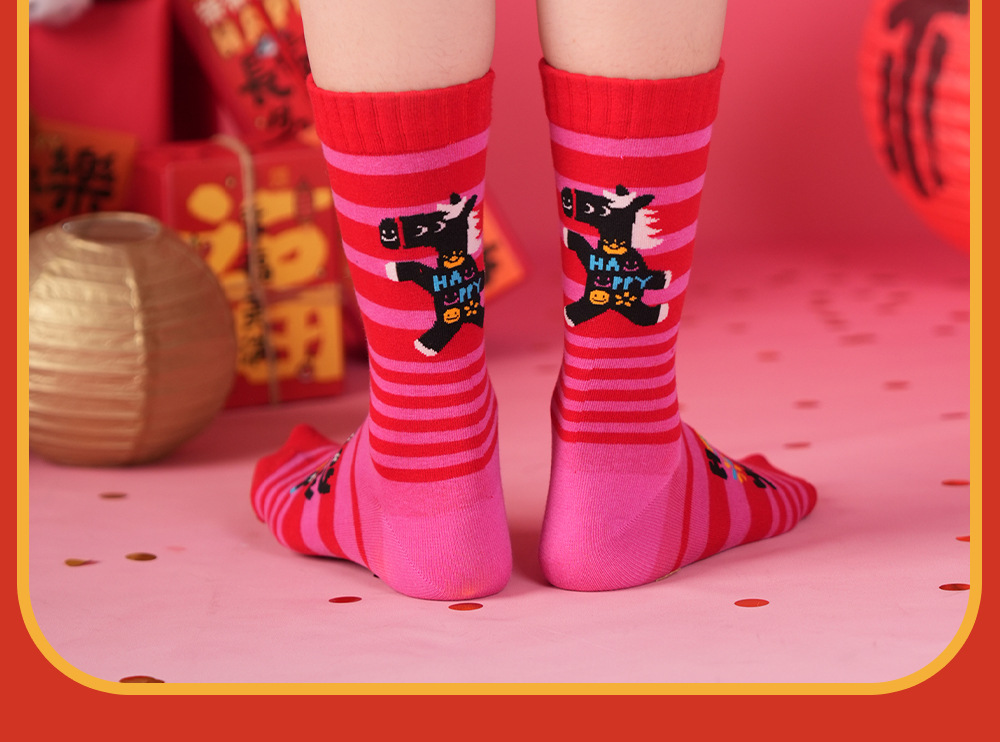 新年小马卡通年袜冬季加厚中筒设计感潮袜女本命年红底棉袜男