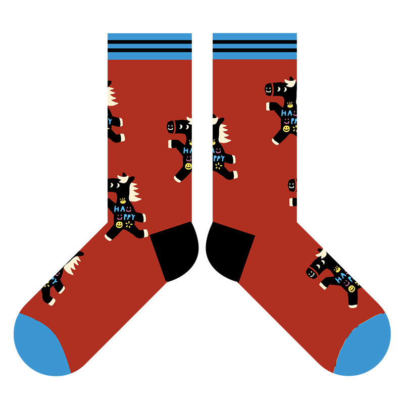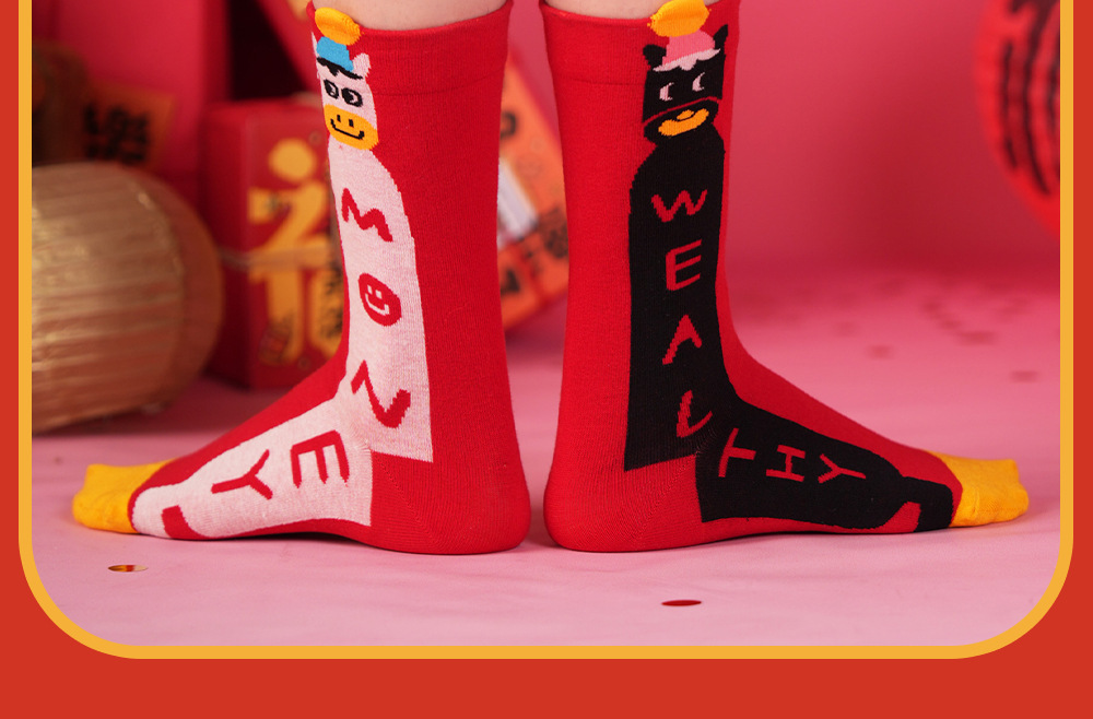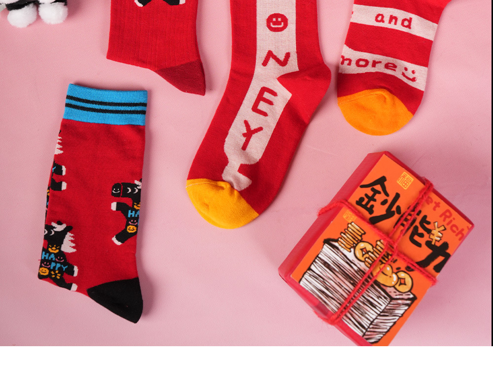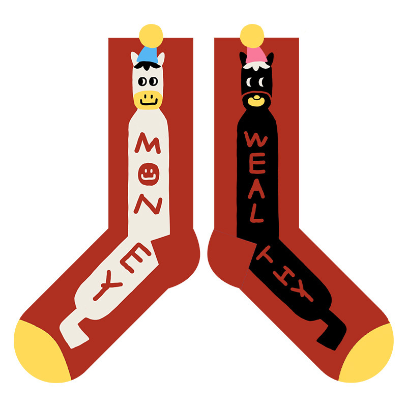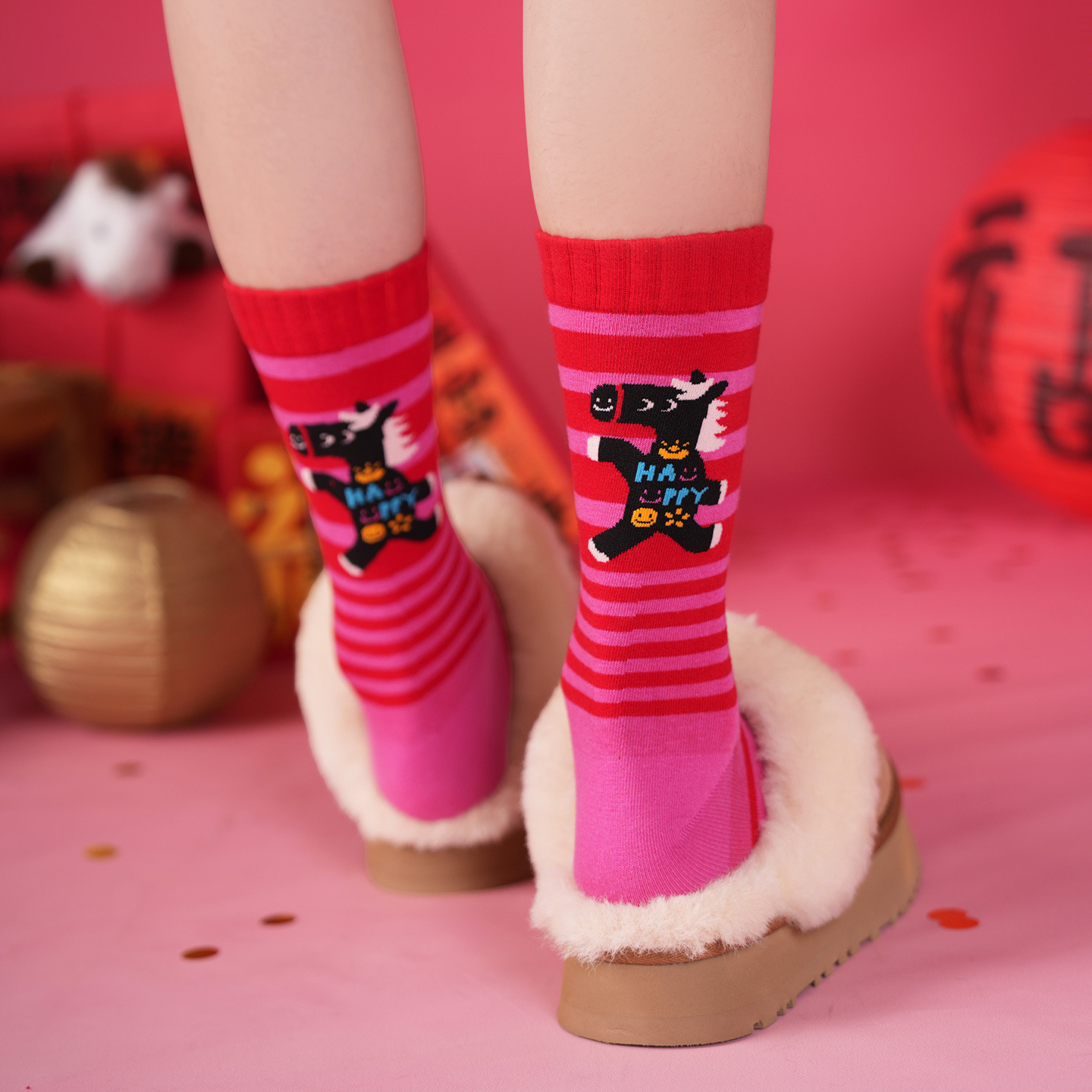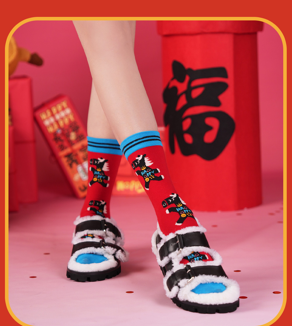 新年小马卡通年袜冬季加厚中筒设计感潮袜女本命年红底棉袜男