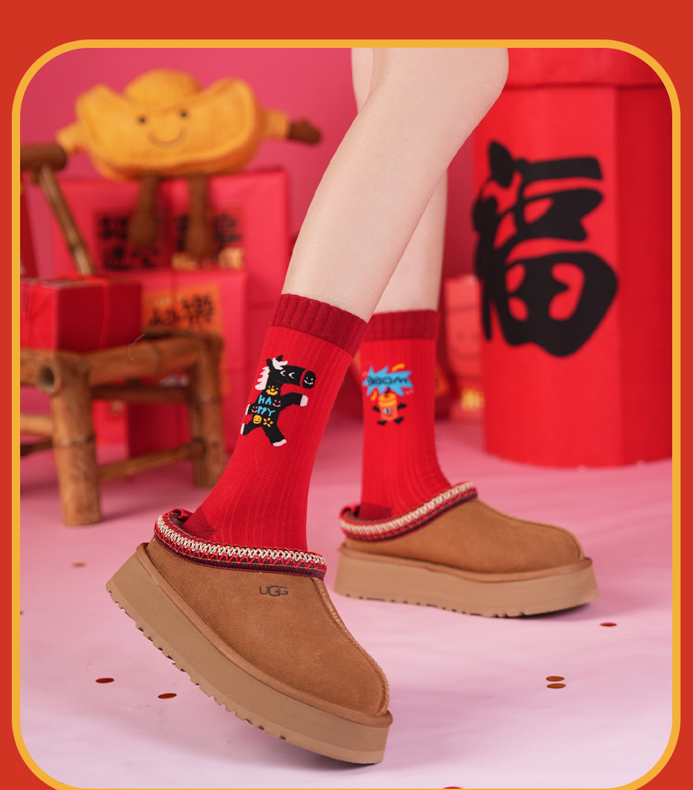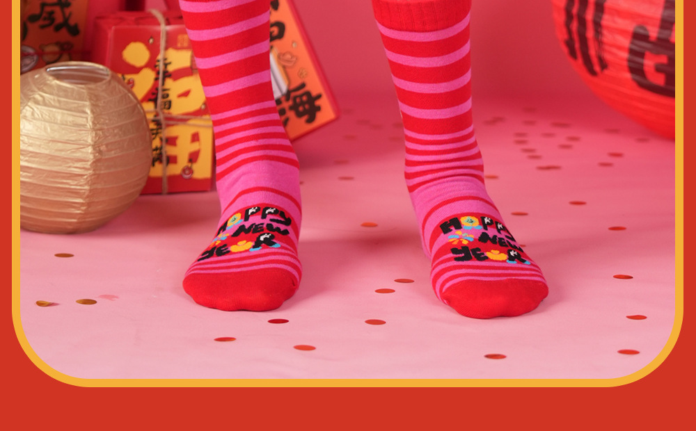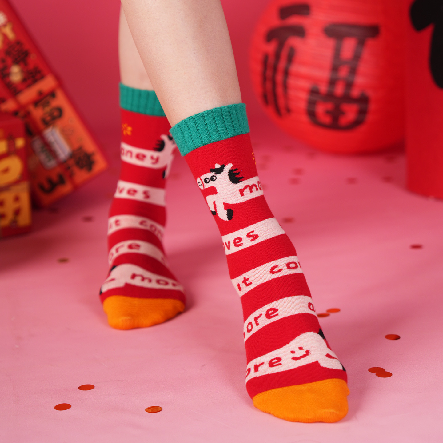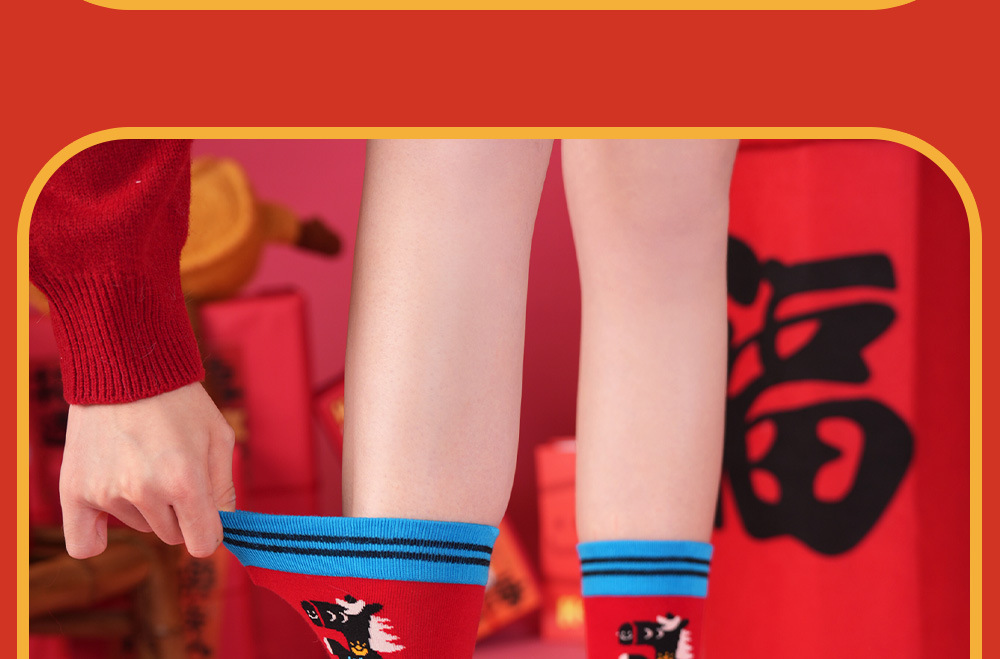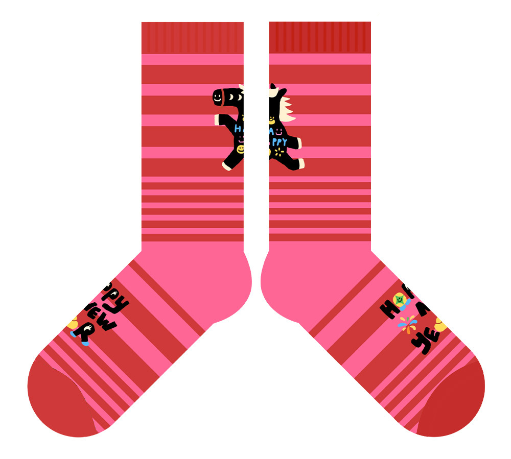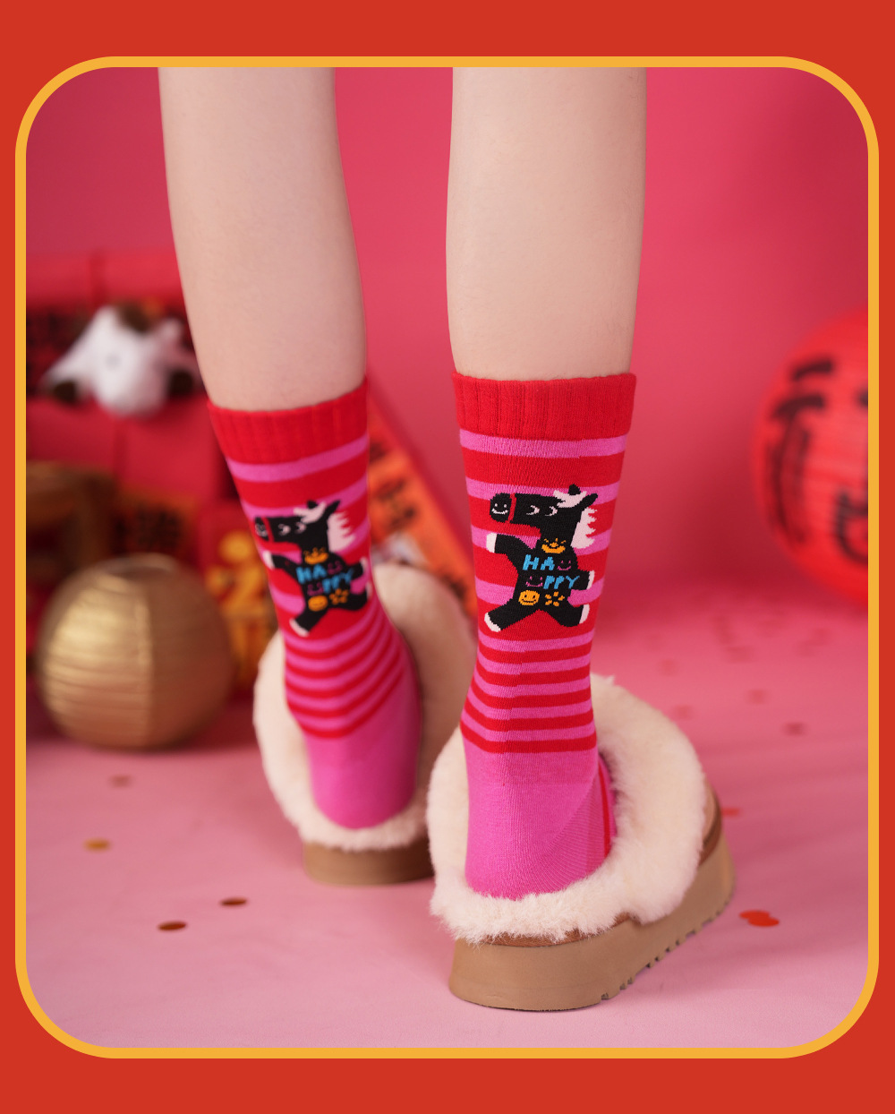 新年小马卡通年袜冬季加厚中筒设计感潮袜女本命年红底棉袜男