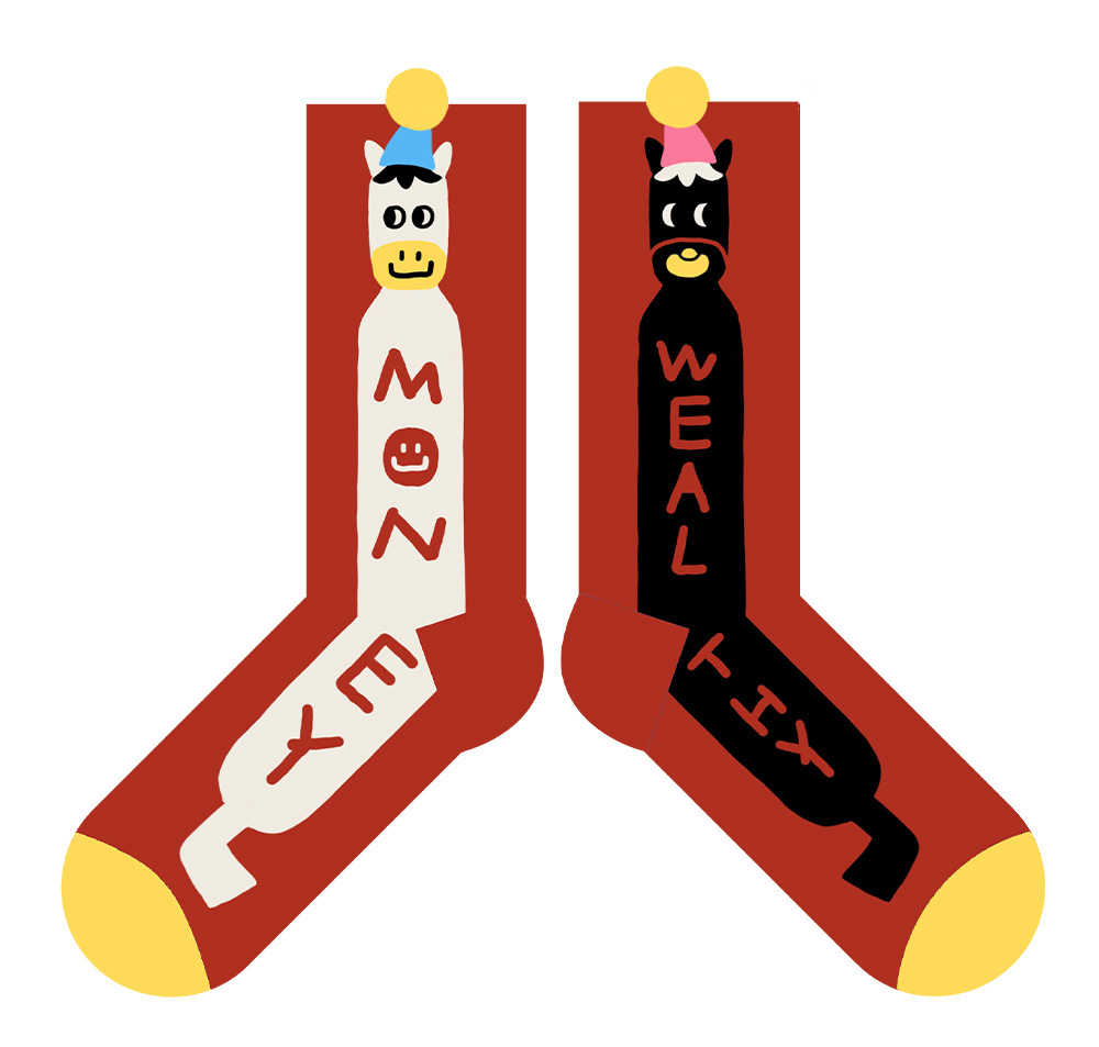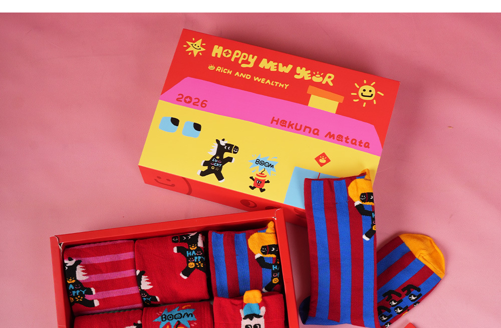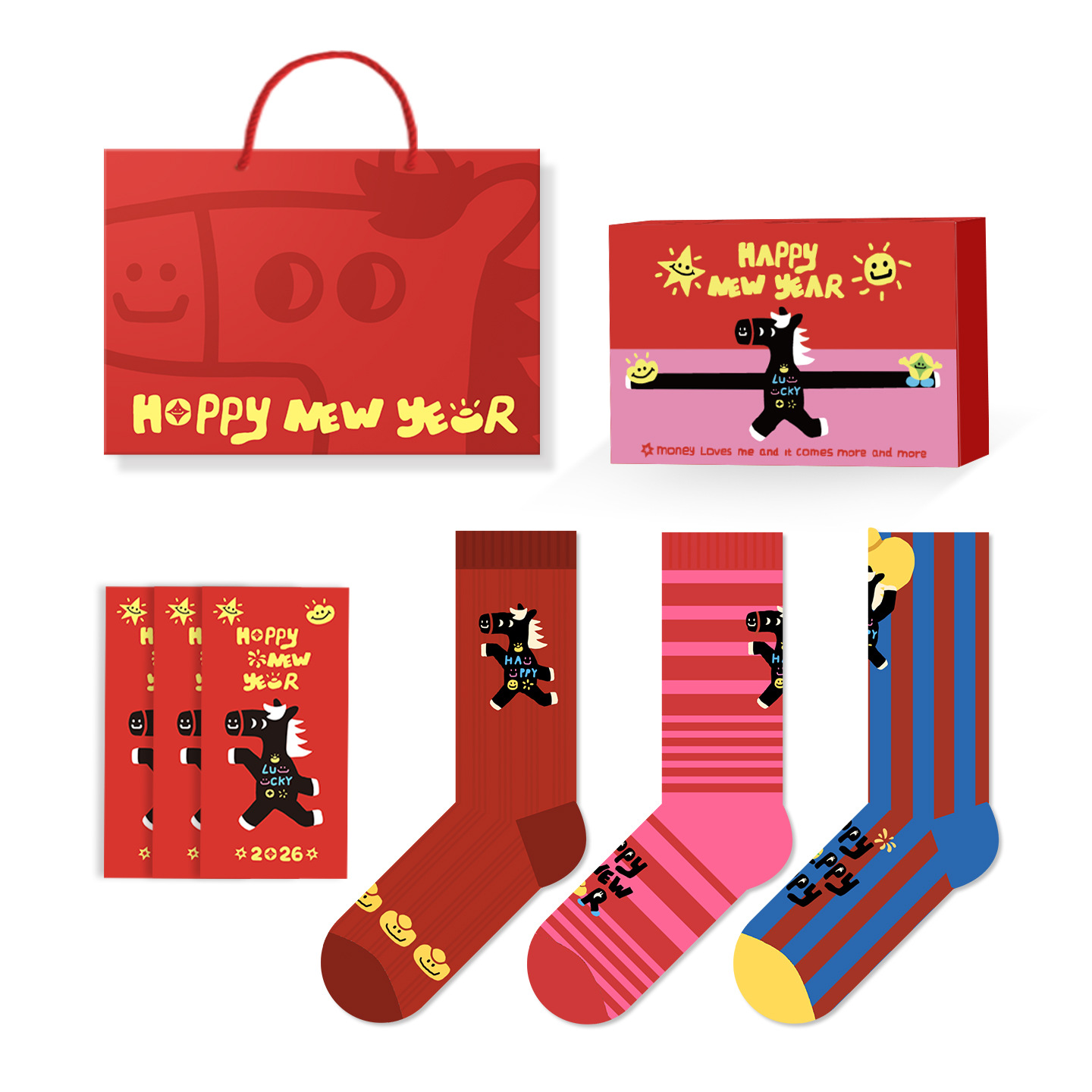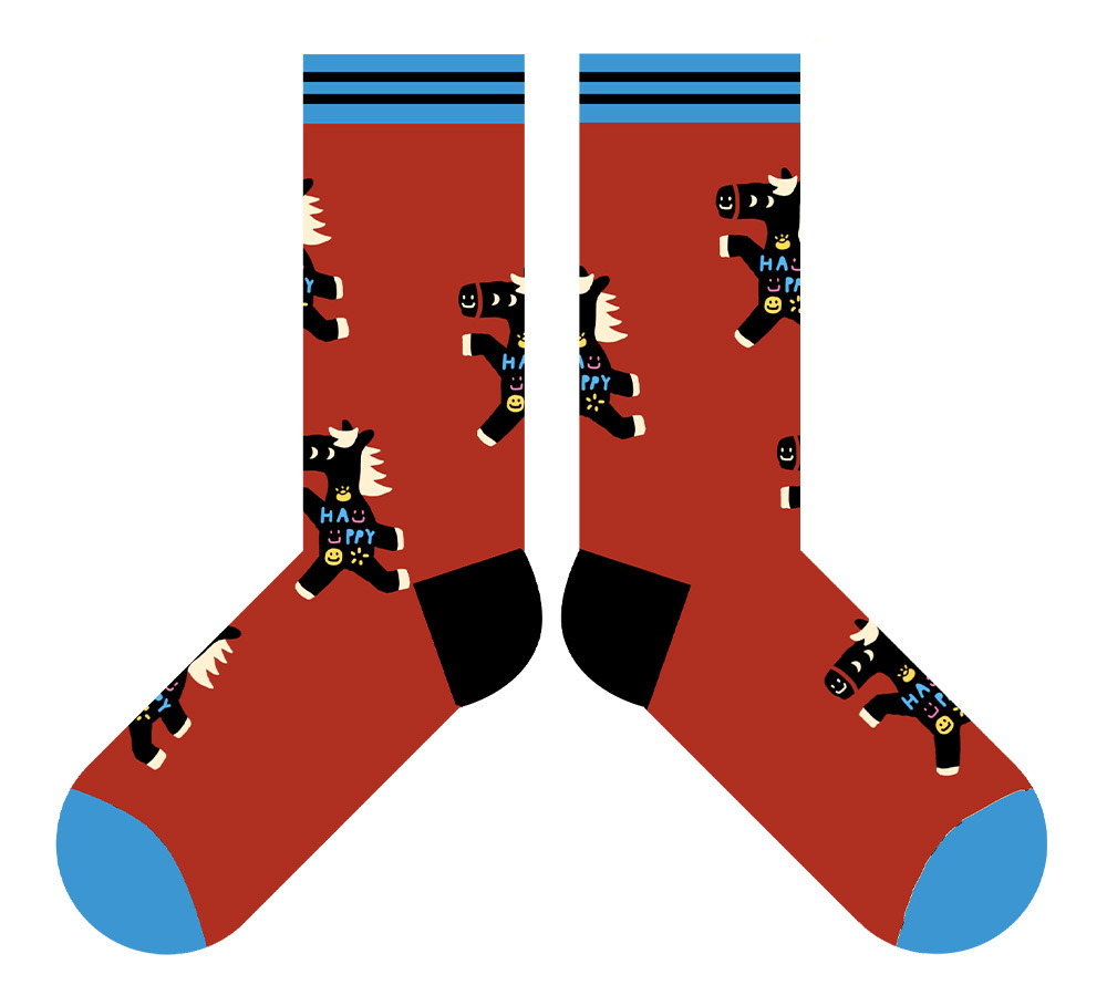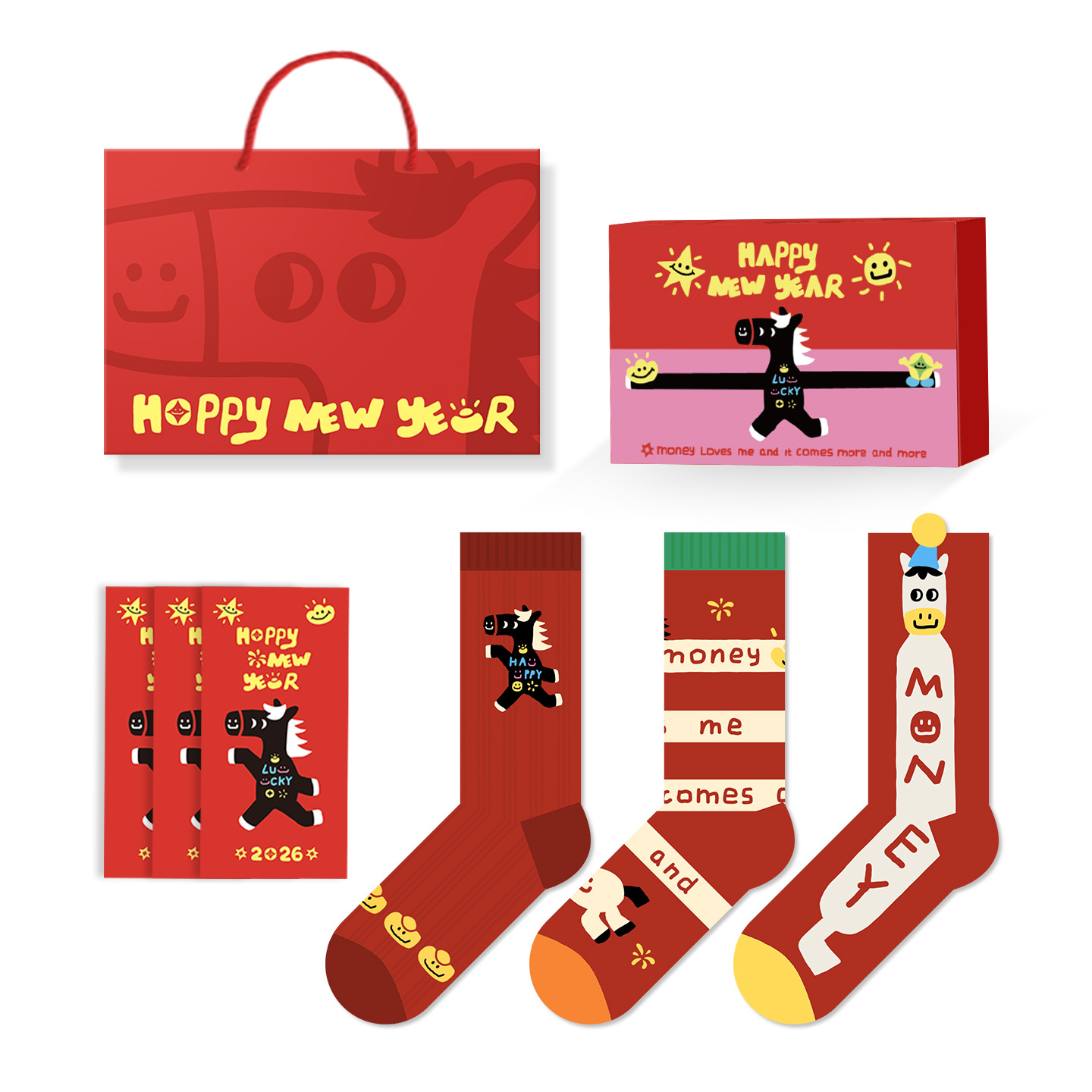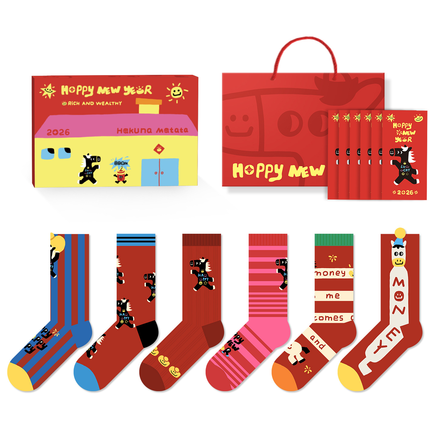 新年小马卡通年袜冬季加厚中筒设计感潮袜女本命年红底棉袜男