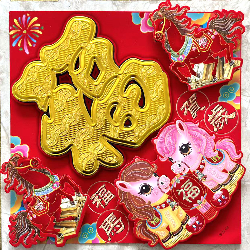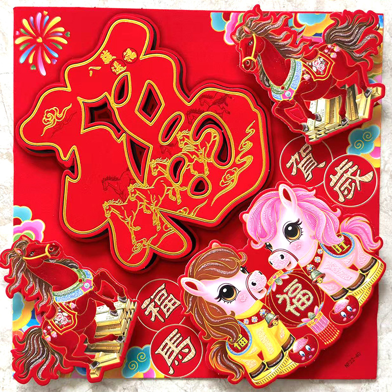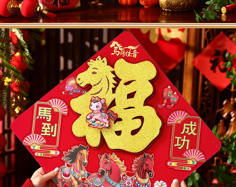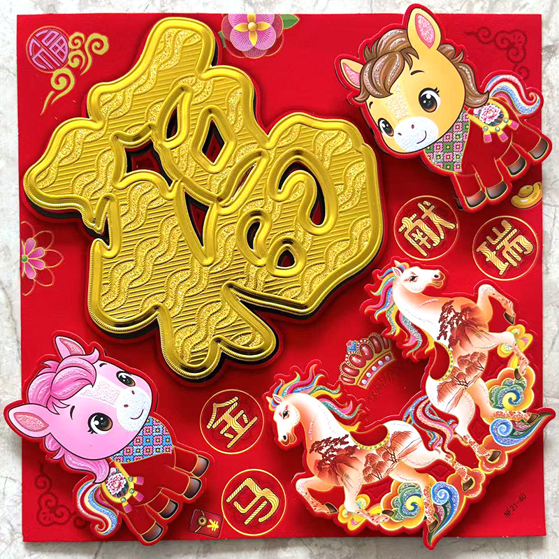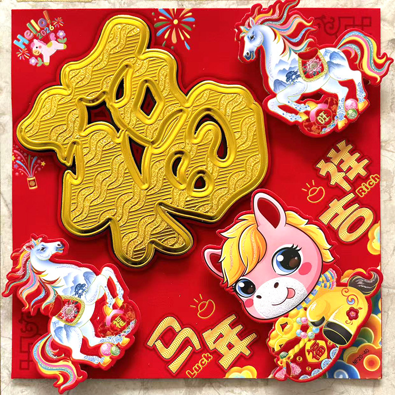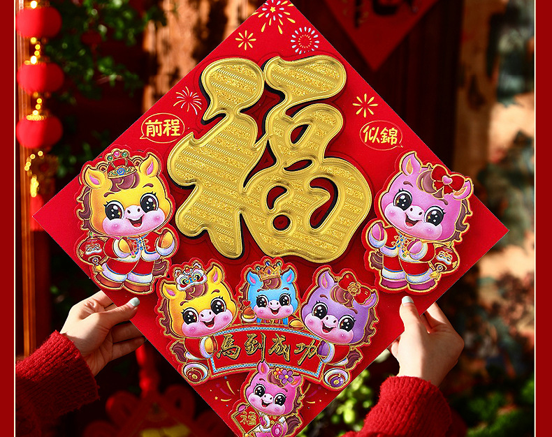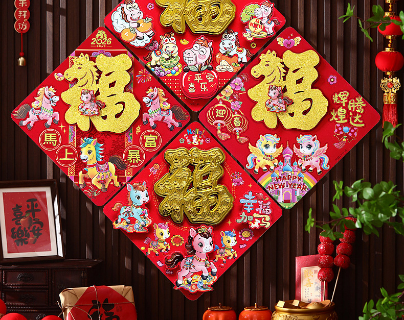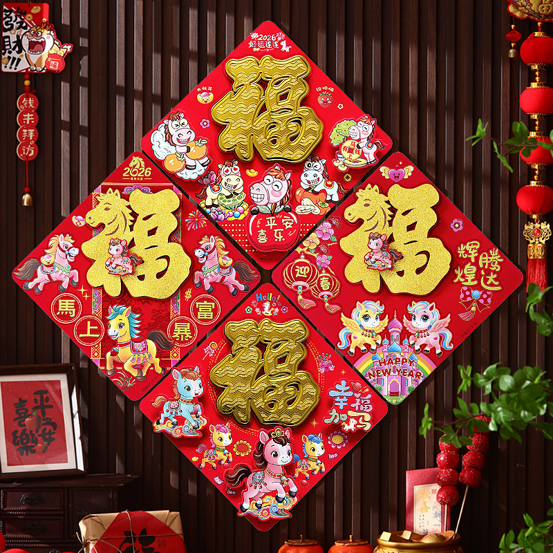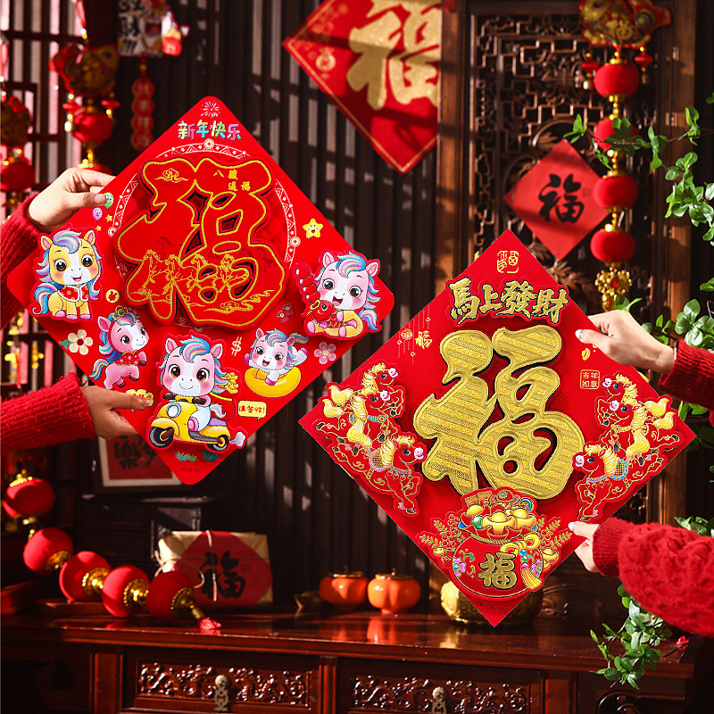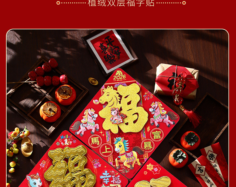 2026福字门贴自粘式马年生肖植绒立体福字贴纸烫金大门春节福字贴