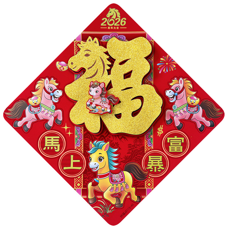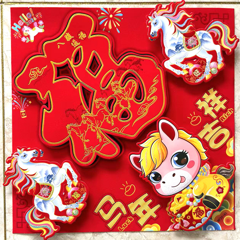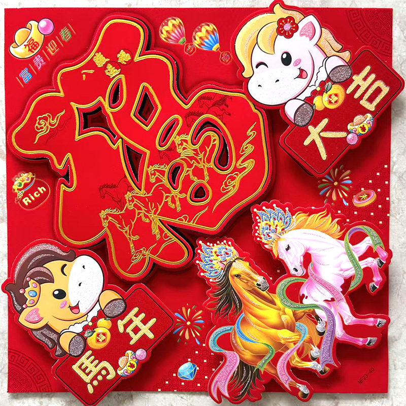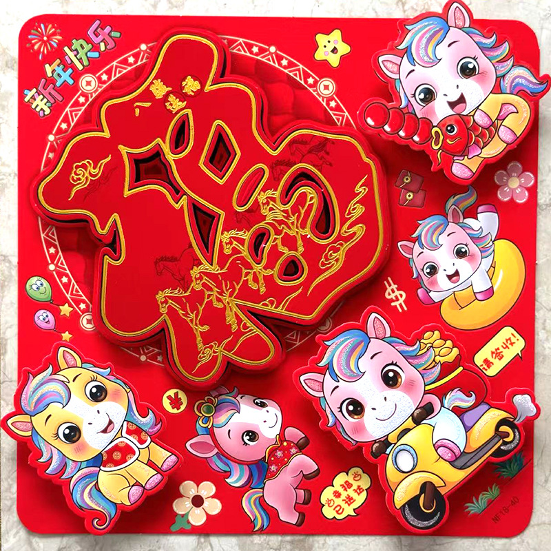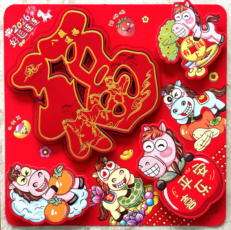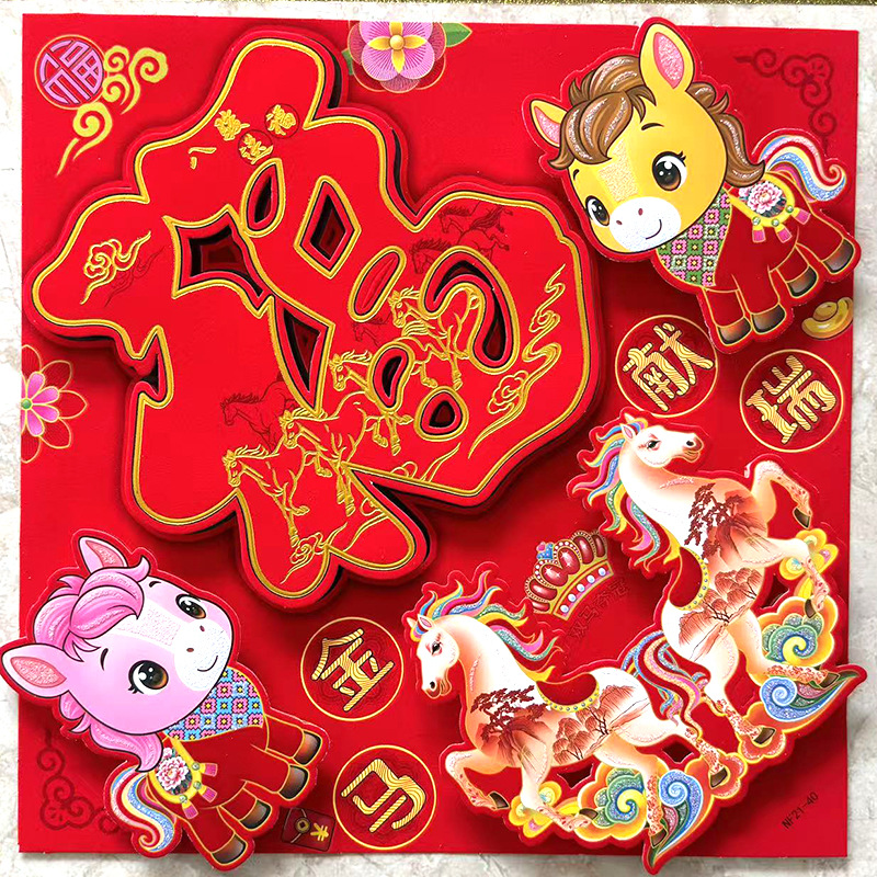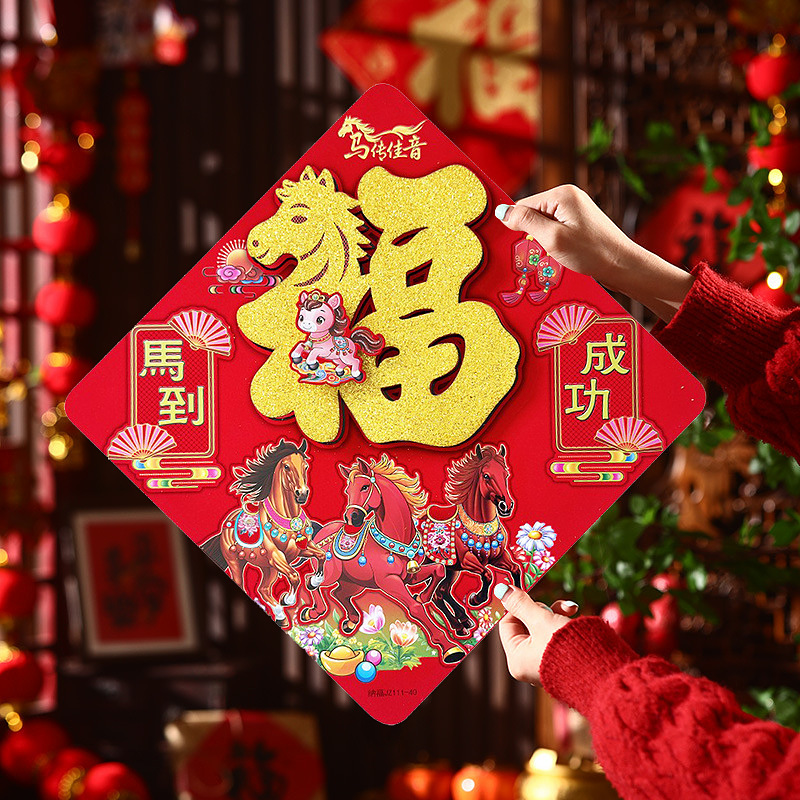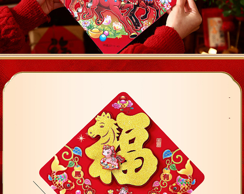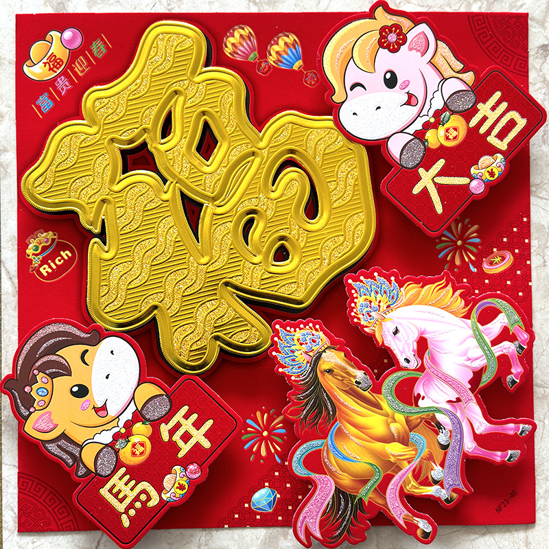 2026福字门贴自粘式马年生肖植绒立体福字贴纸烫金大门春节福字贴