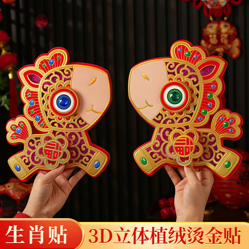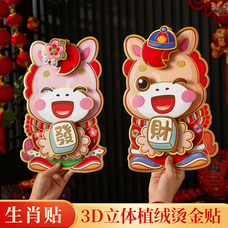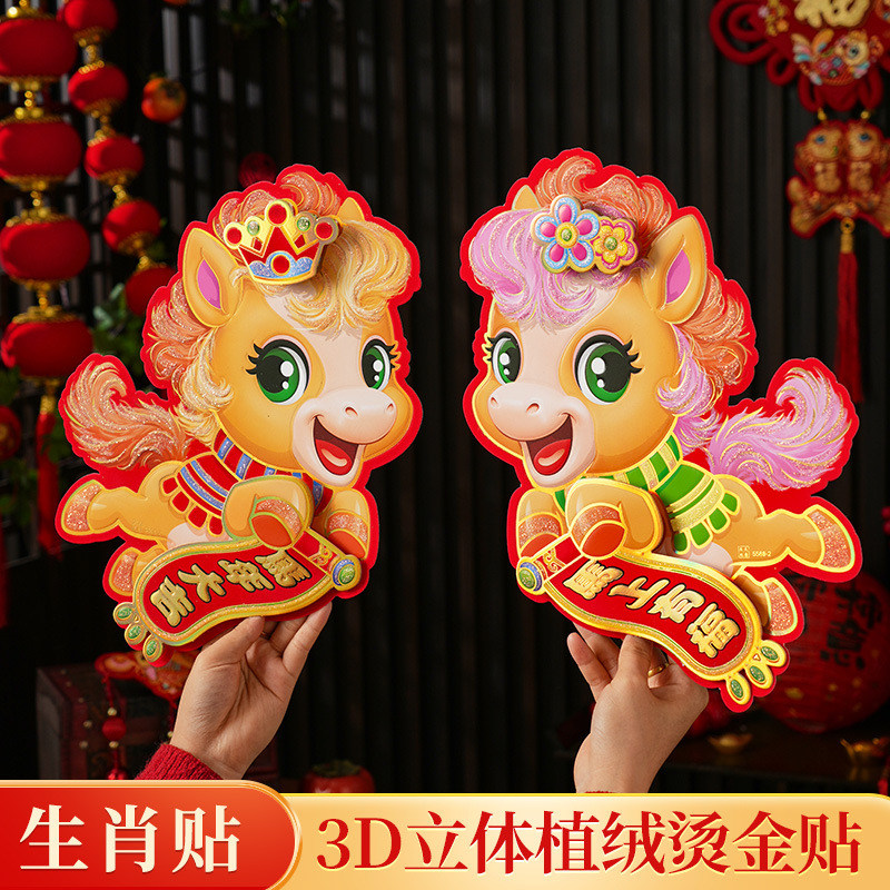 2026马年生肖门贴撒金粉福字窗贴年画春节年货卡通植绒立体马对贴
