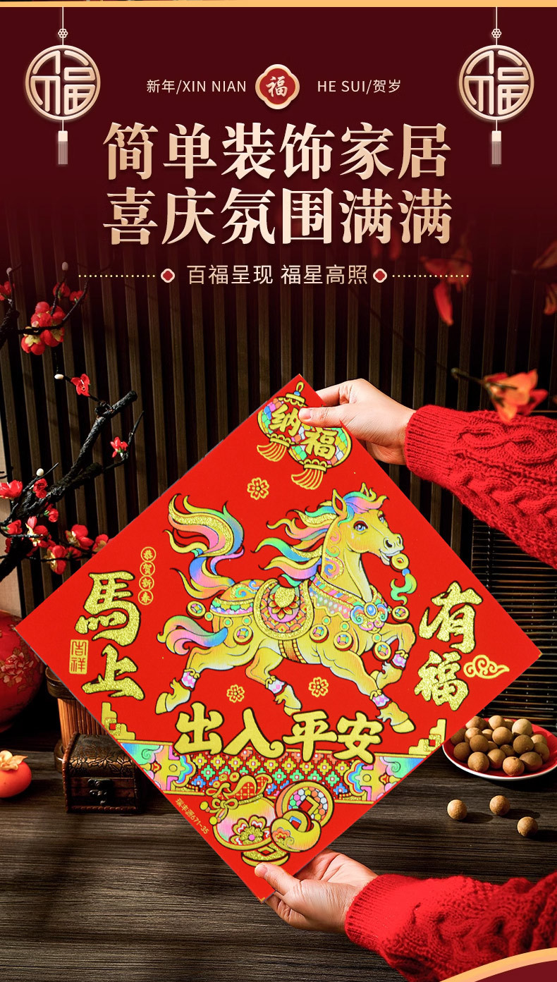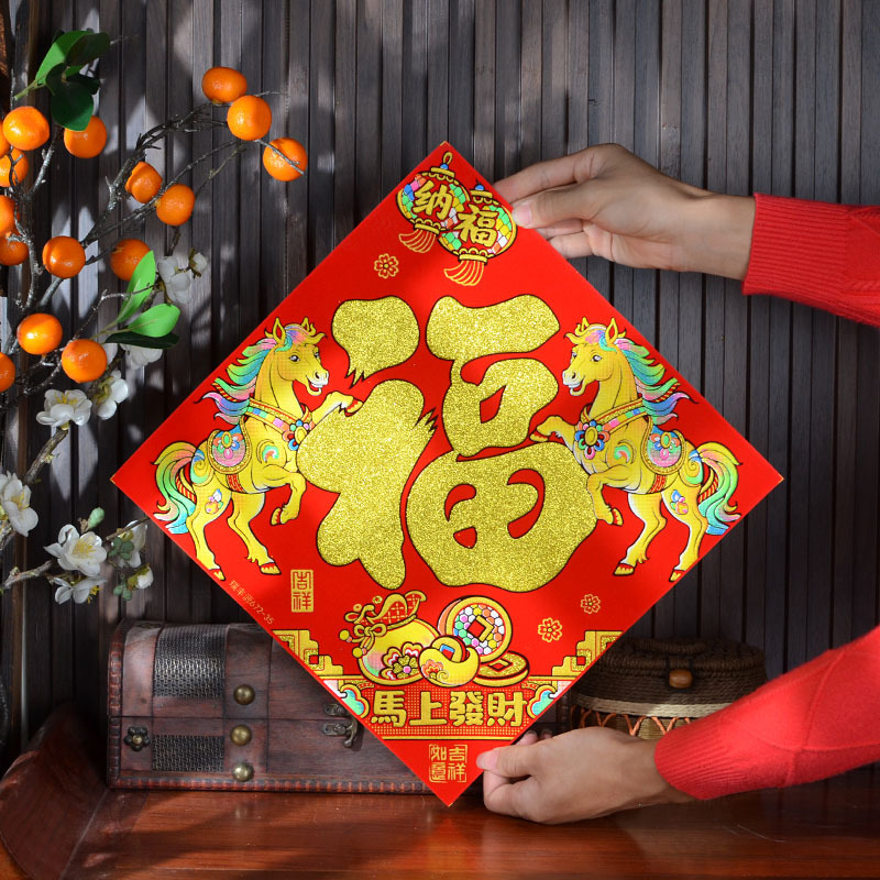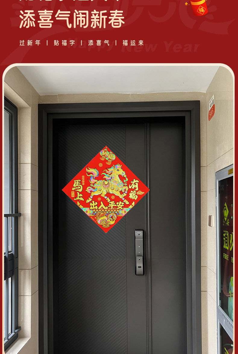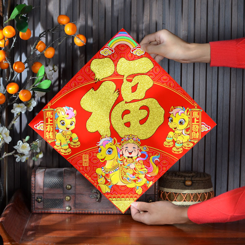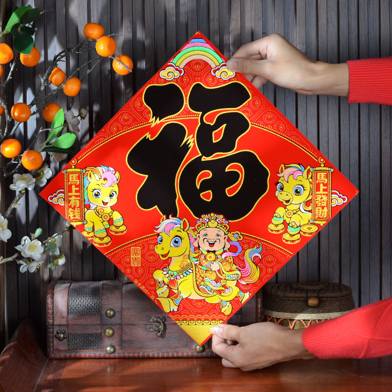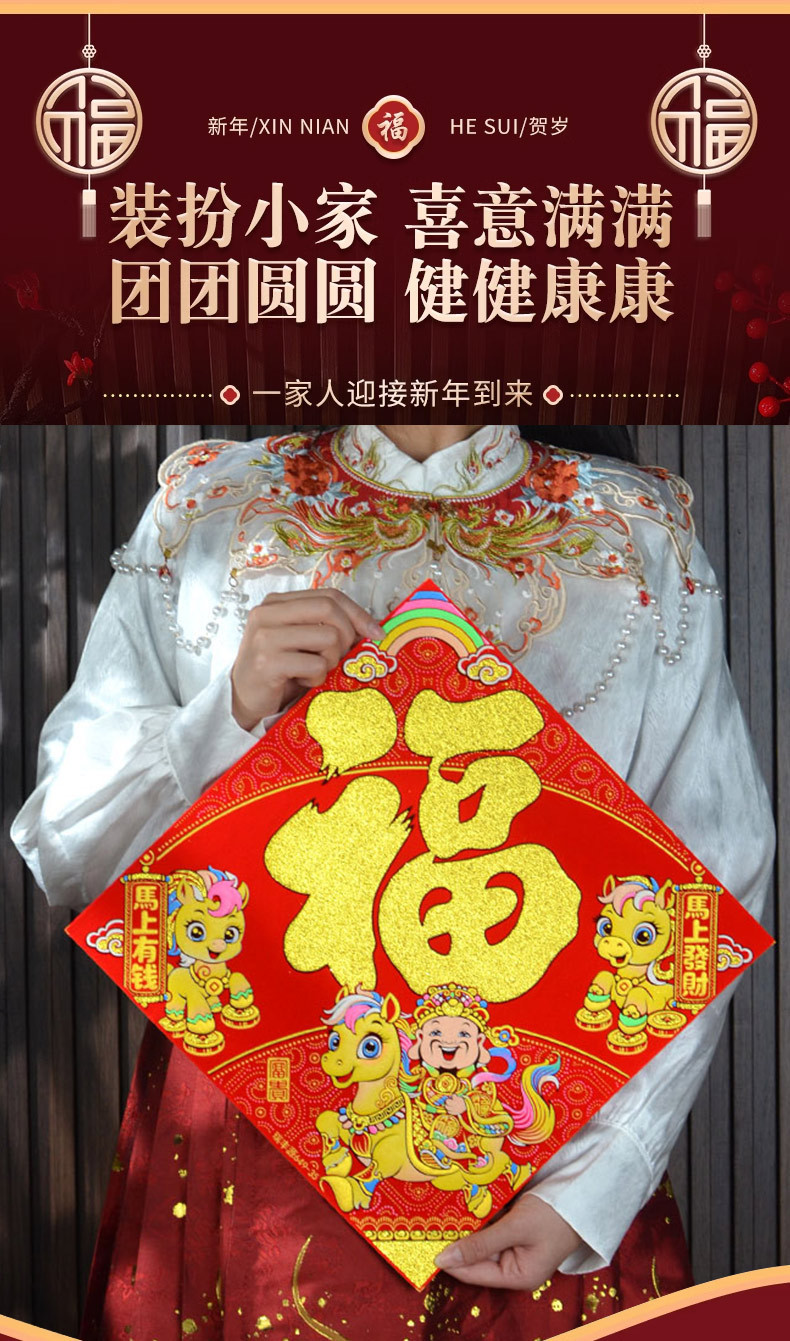 2026年马年新款生肖福字贴装饰自带背胶烫金绒布过年门贴装饰福