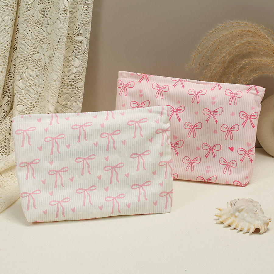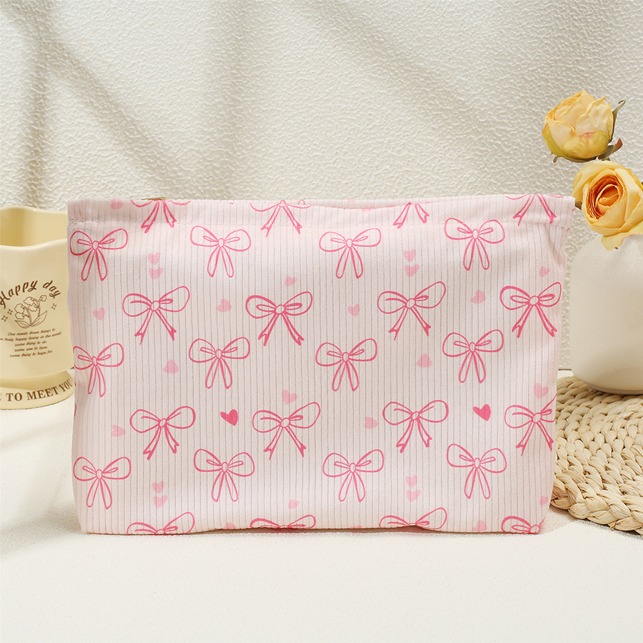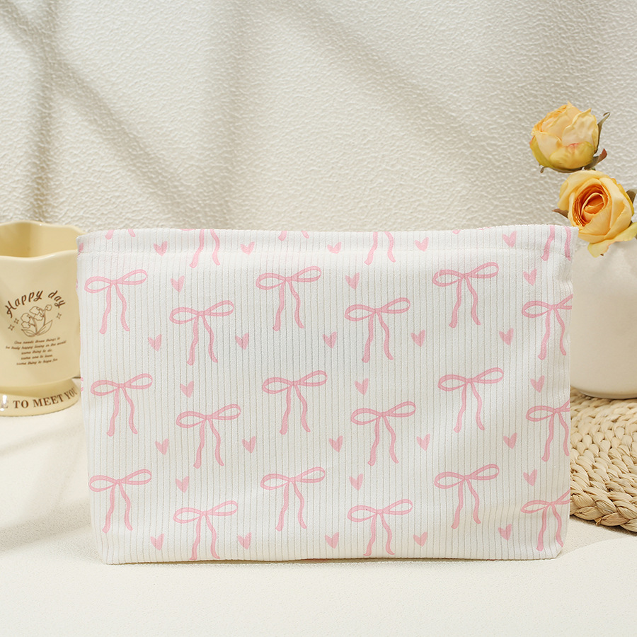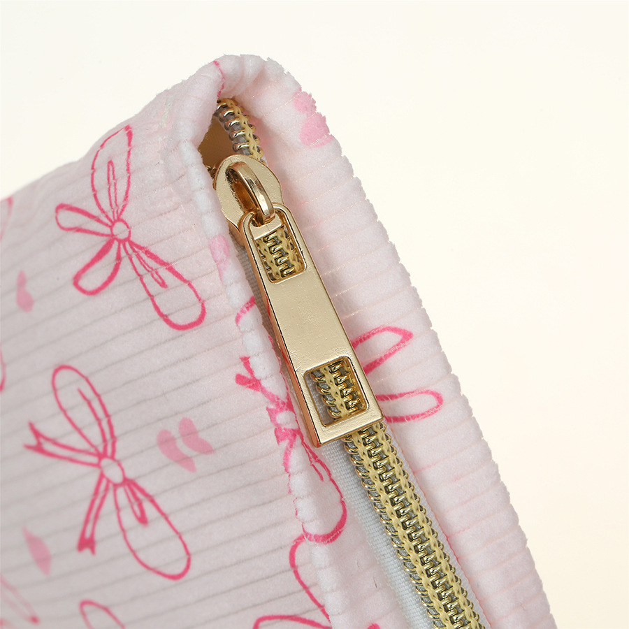 彩色大蝴蝶结印花图灯芯绒拉链收纳袋轻便化妆包文艺日系透气