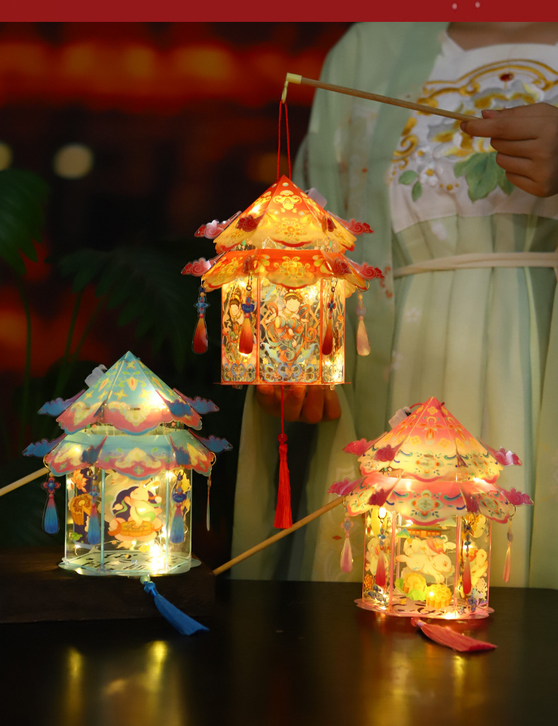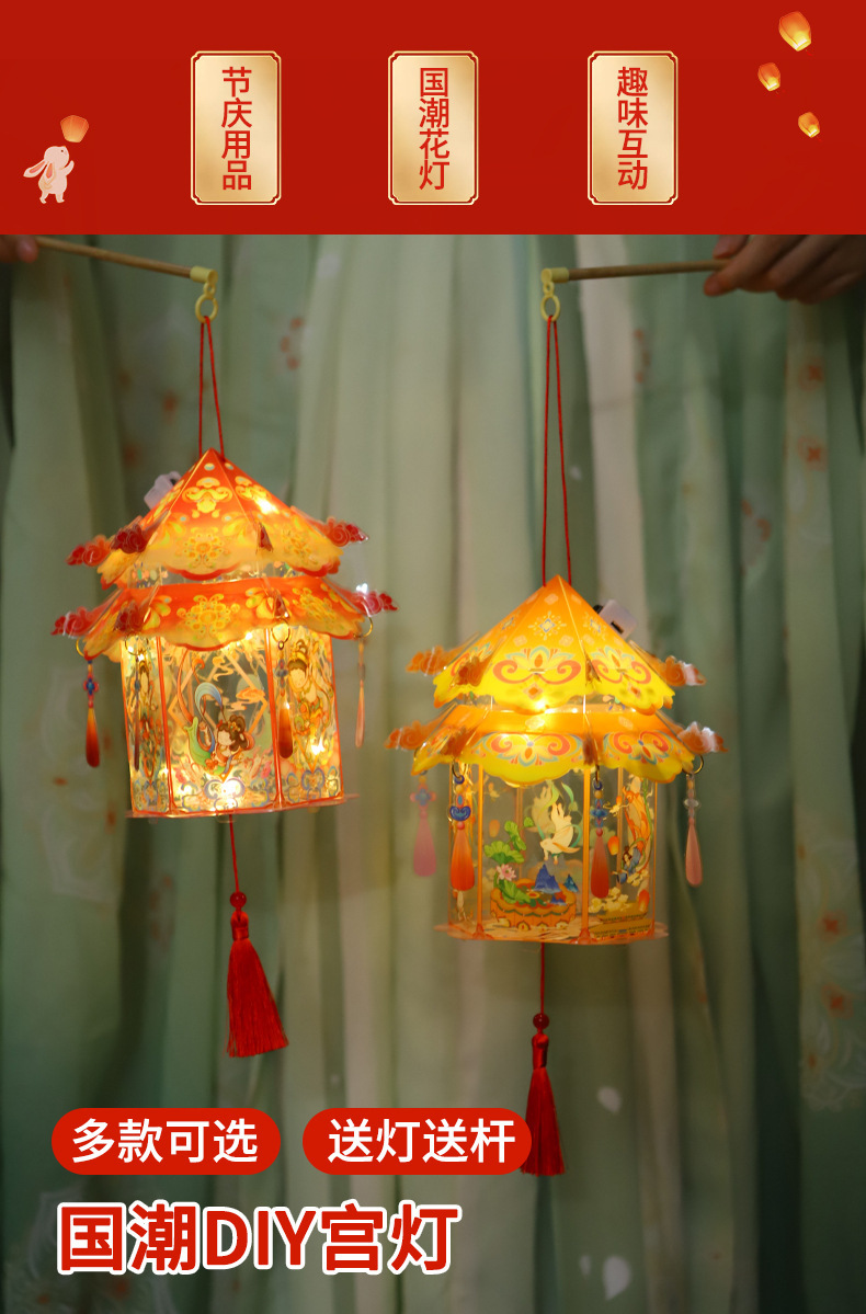 中秋新款古风兔子灯笼儿童手工diy材料包手提宫灯发光投影灯笼花