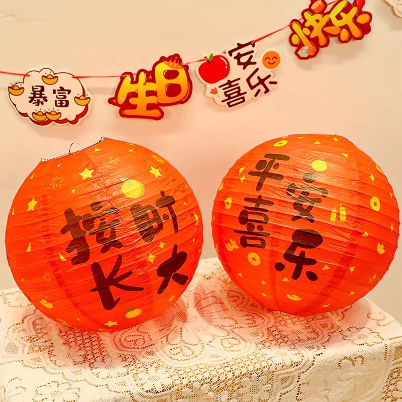 周岁生日布置家庭版纸灯笼挂饰蜂窝球纸球立柱中式抓周背景墙纸扇