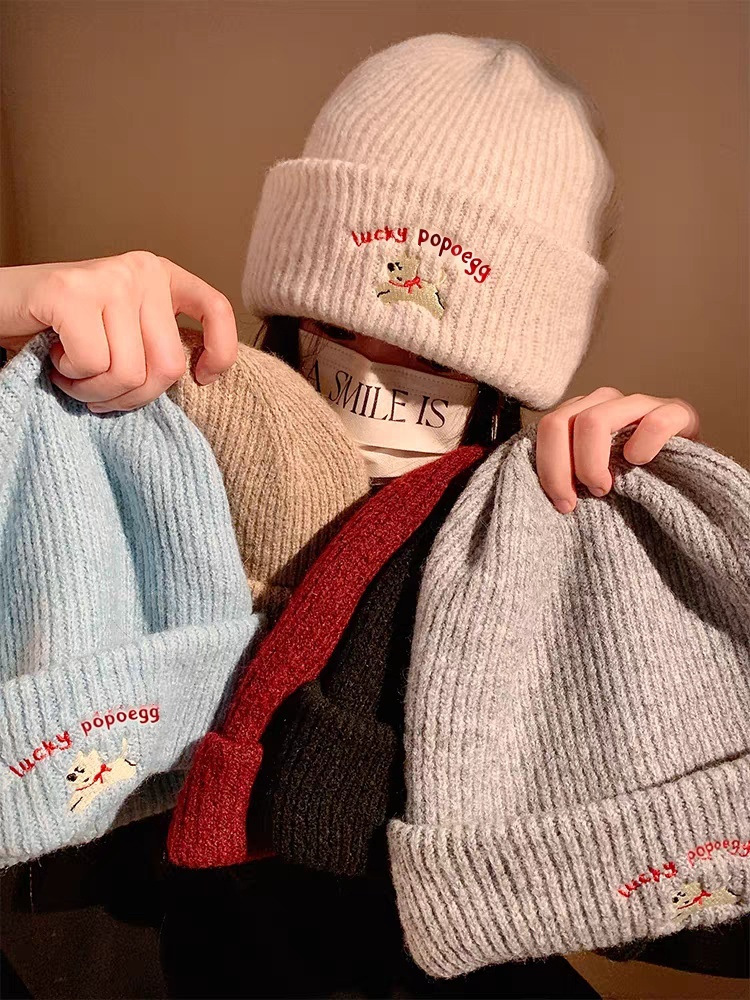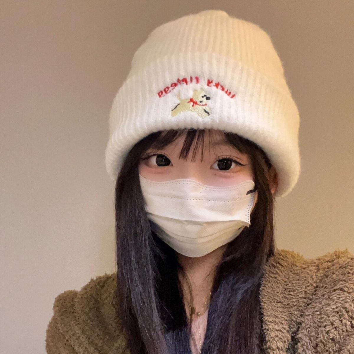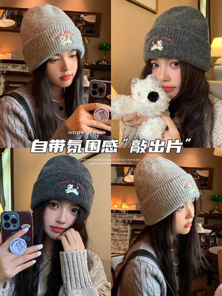 可爱小狗刺绣针织毛线帽女2025年新款秋冬季显脸小百搭大头围帽子
