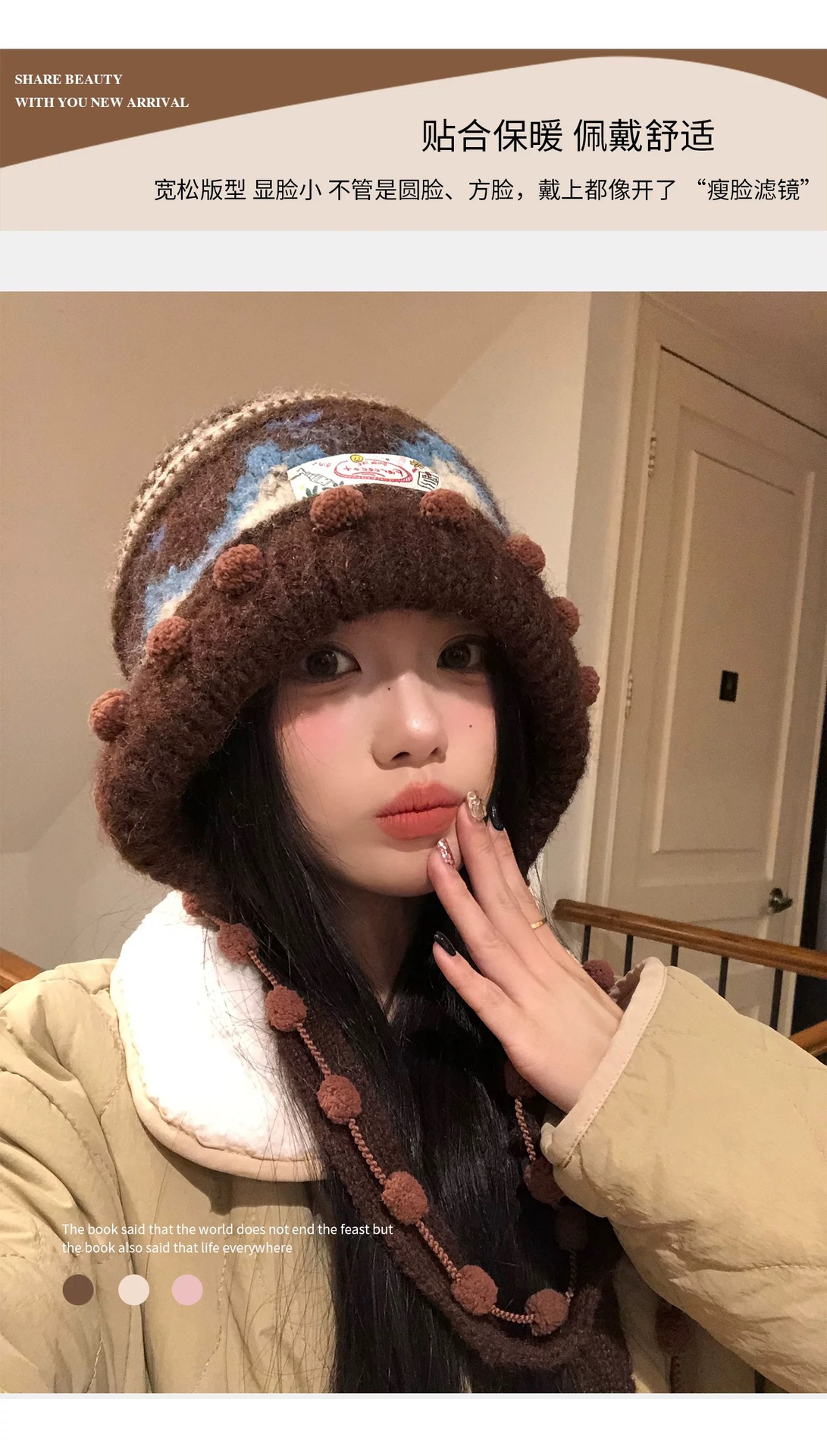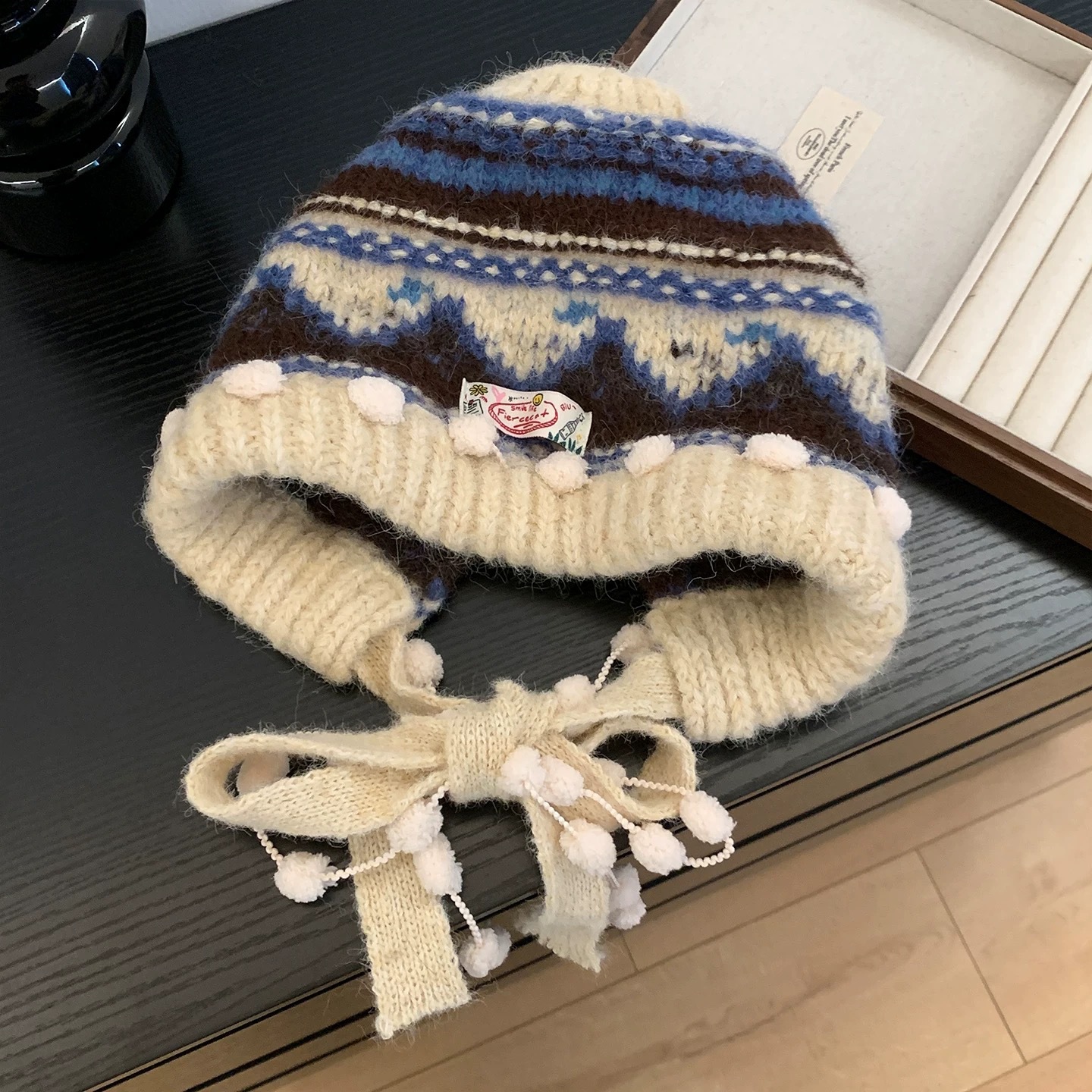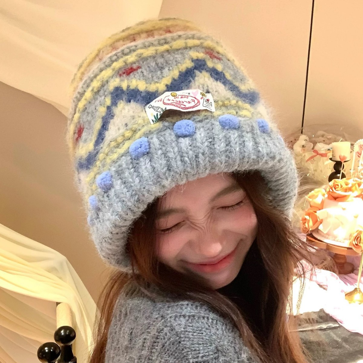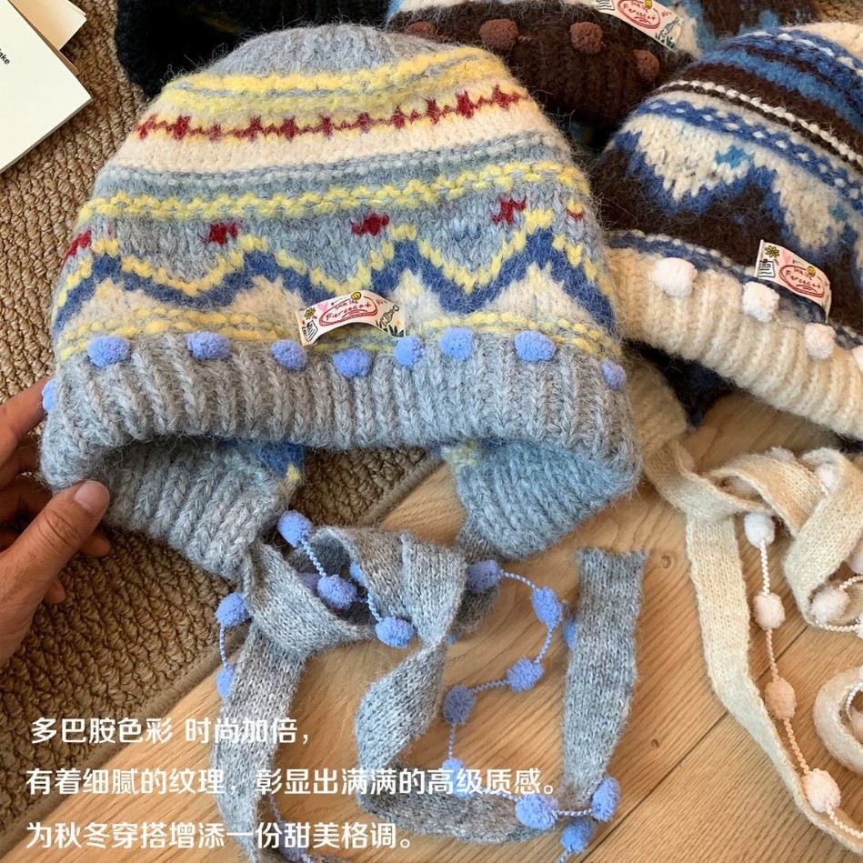 费尔岛撞色针织毛线帽女秋冬季百搭大头围显脸小护耳保暖套头帽子
