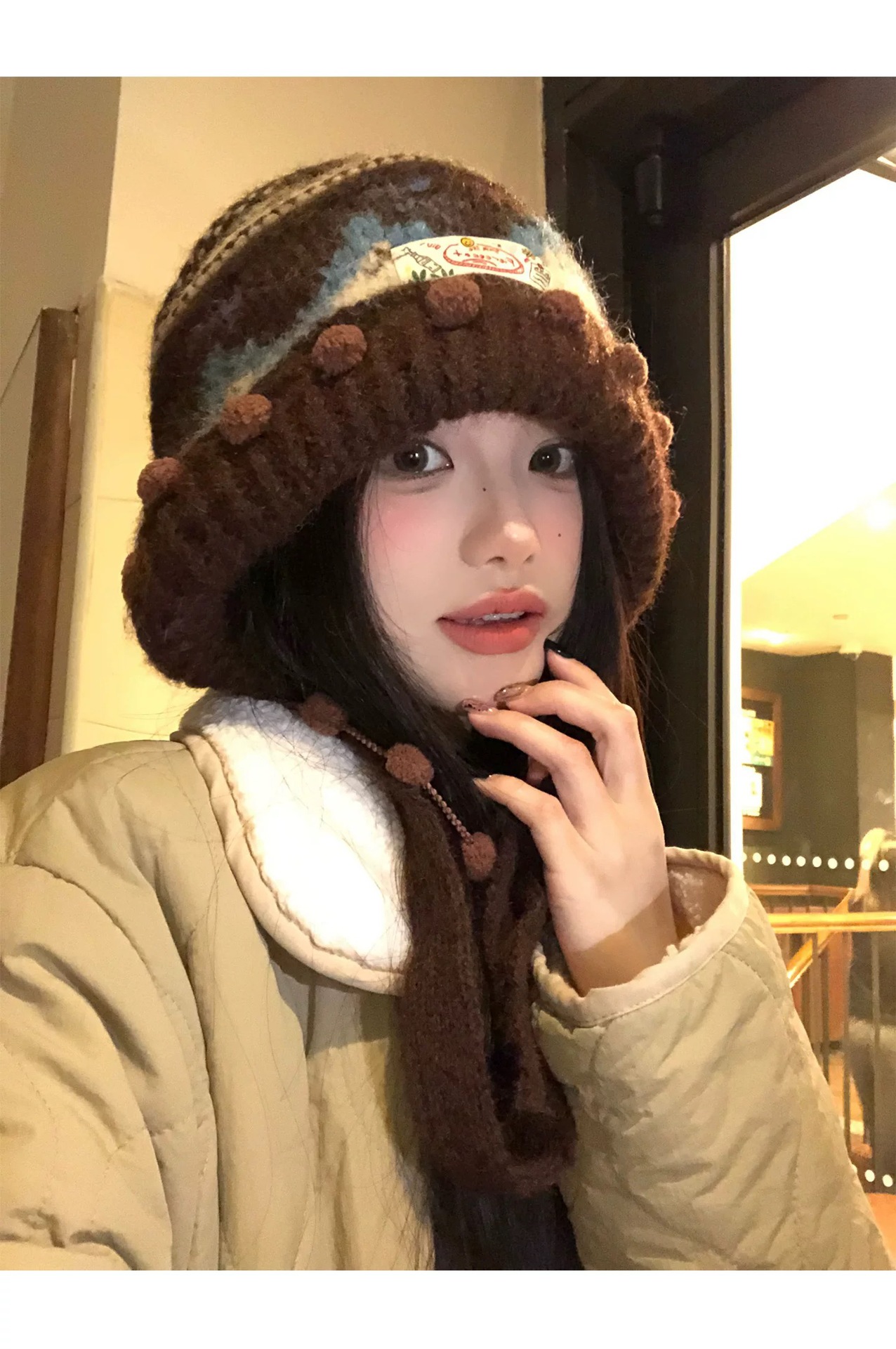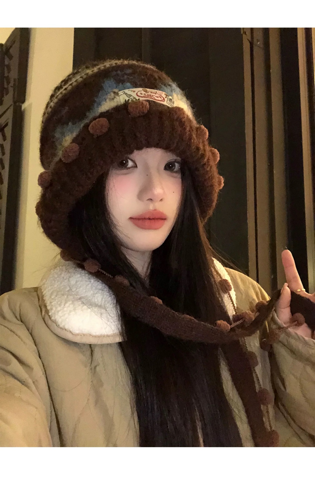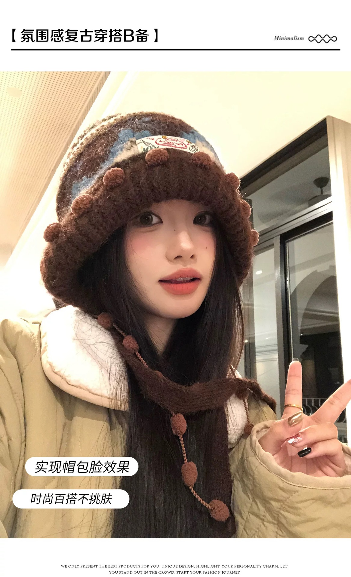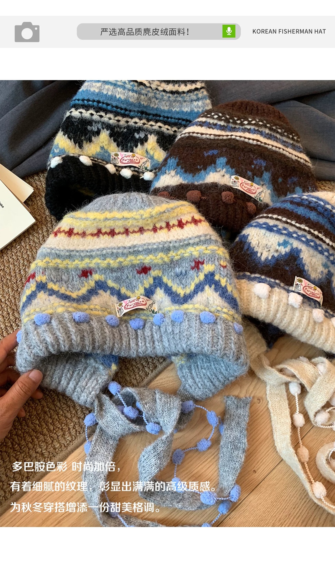 费尔岛撞色针织毛线帽女秋冬季百搭大头围显脸小护耳保暖套头帽子