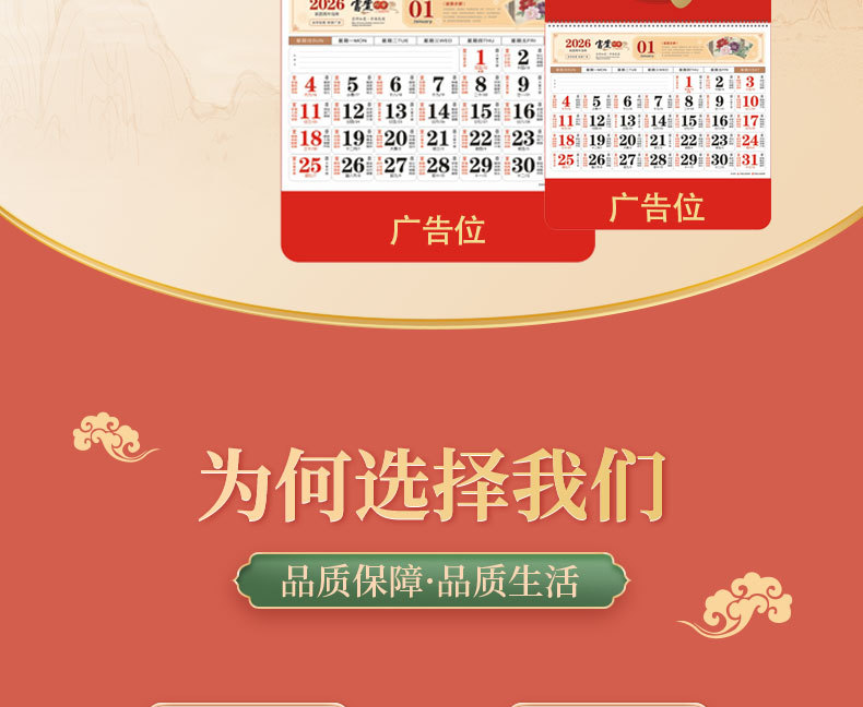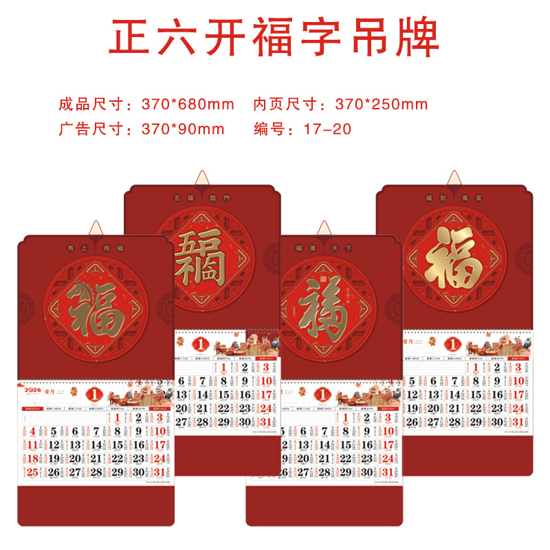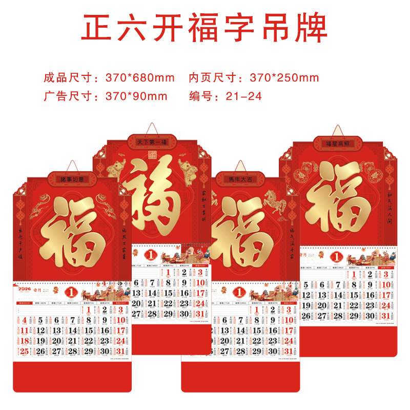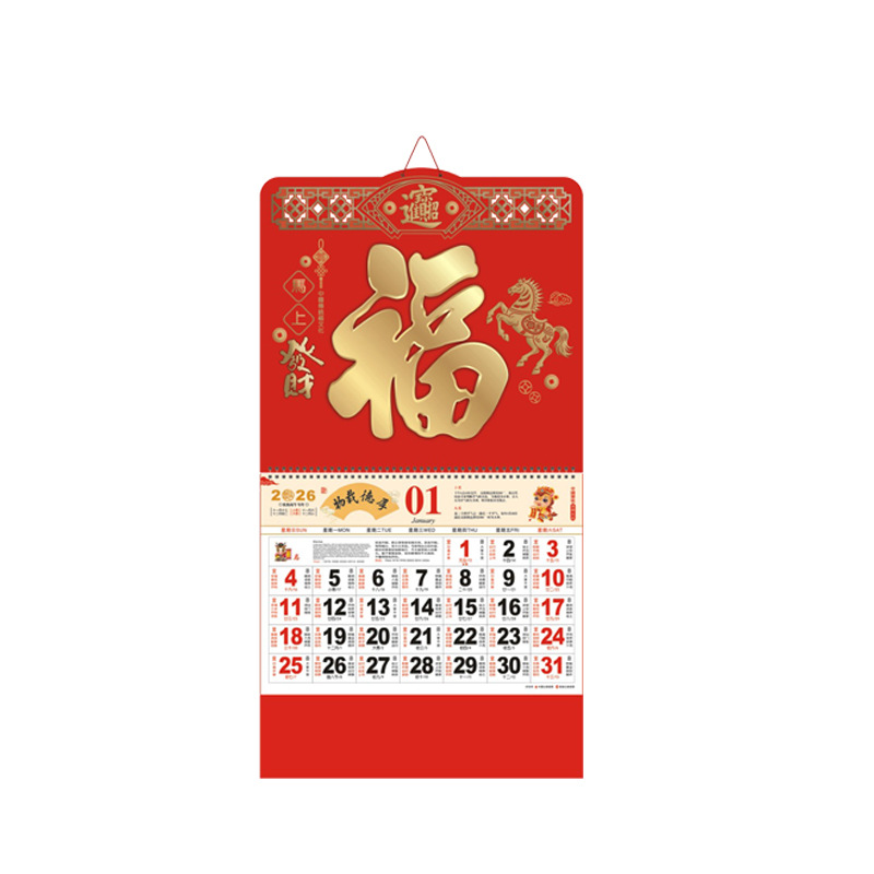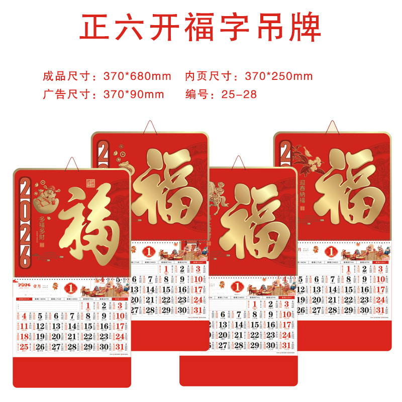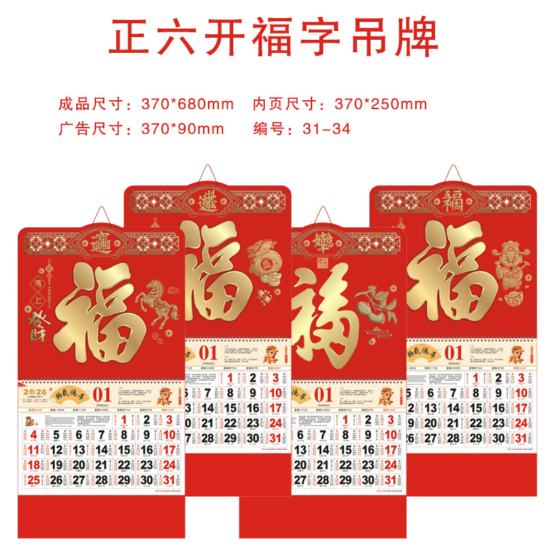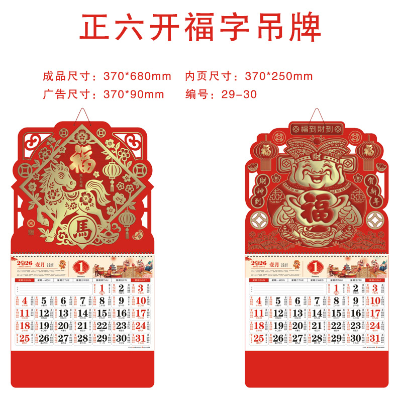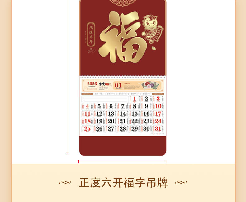 2026马年高档正六福字吊牌家用传统挂历手撕月历logo烫金宣传日历