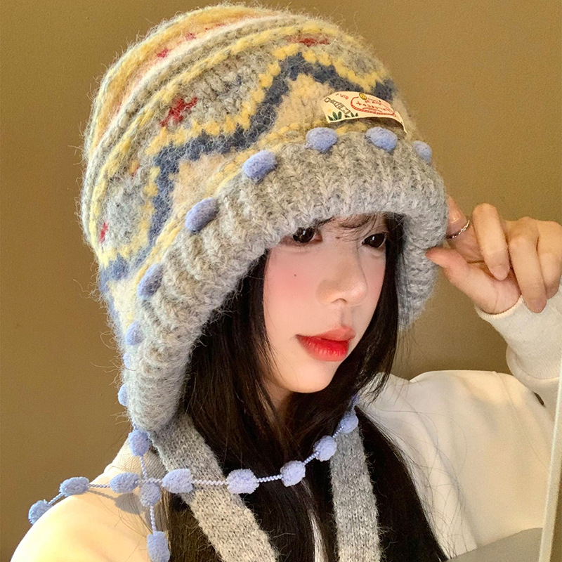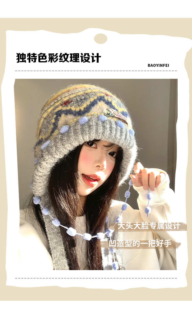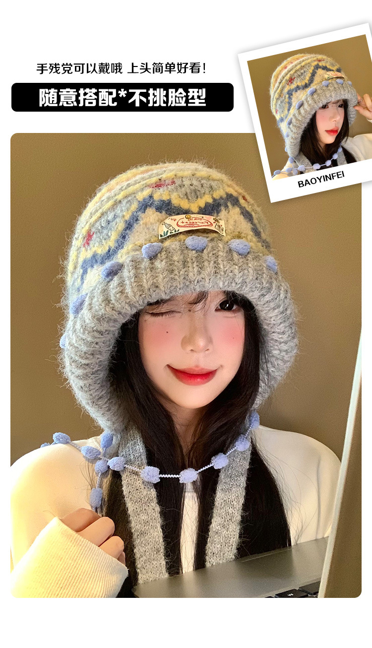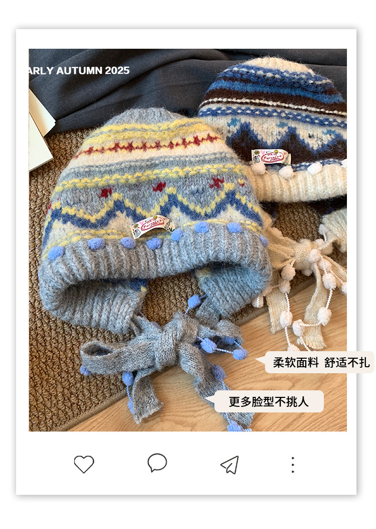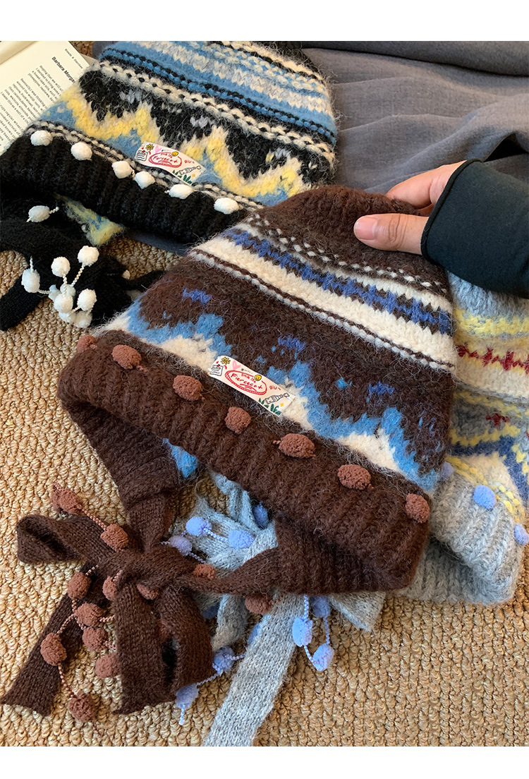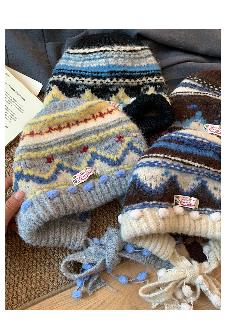 费尔岛复古针织巴拉克拉法帽女秋冬显脸小包头加厚保暖护耳毛线帽