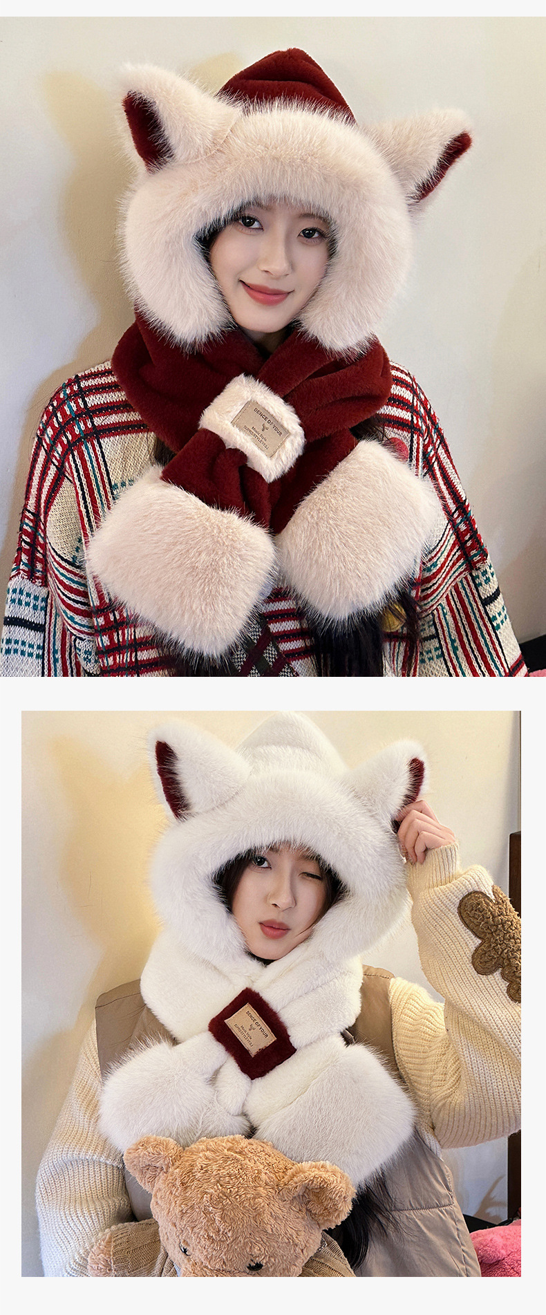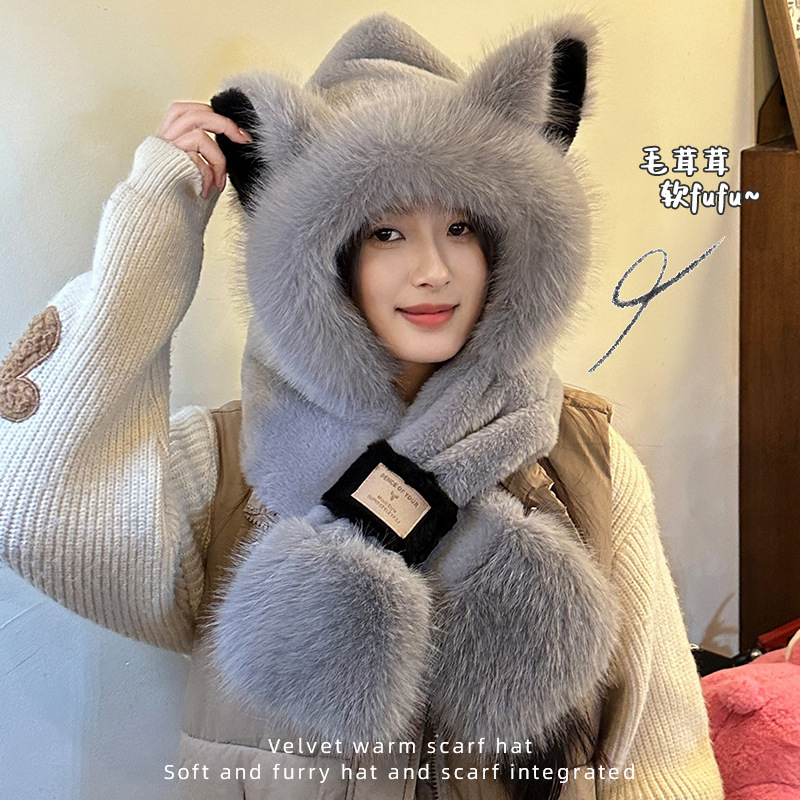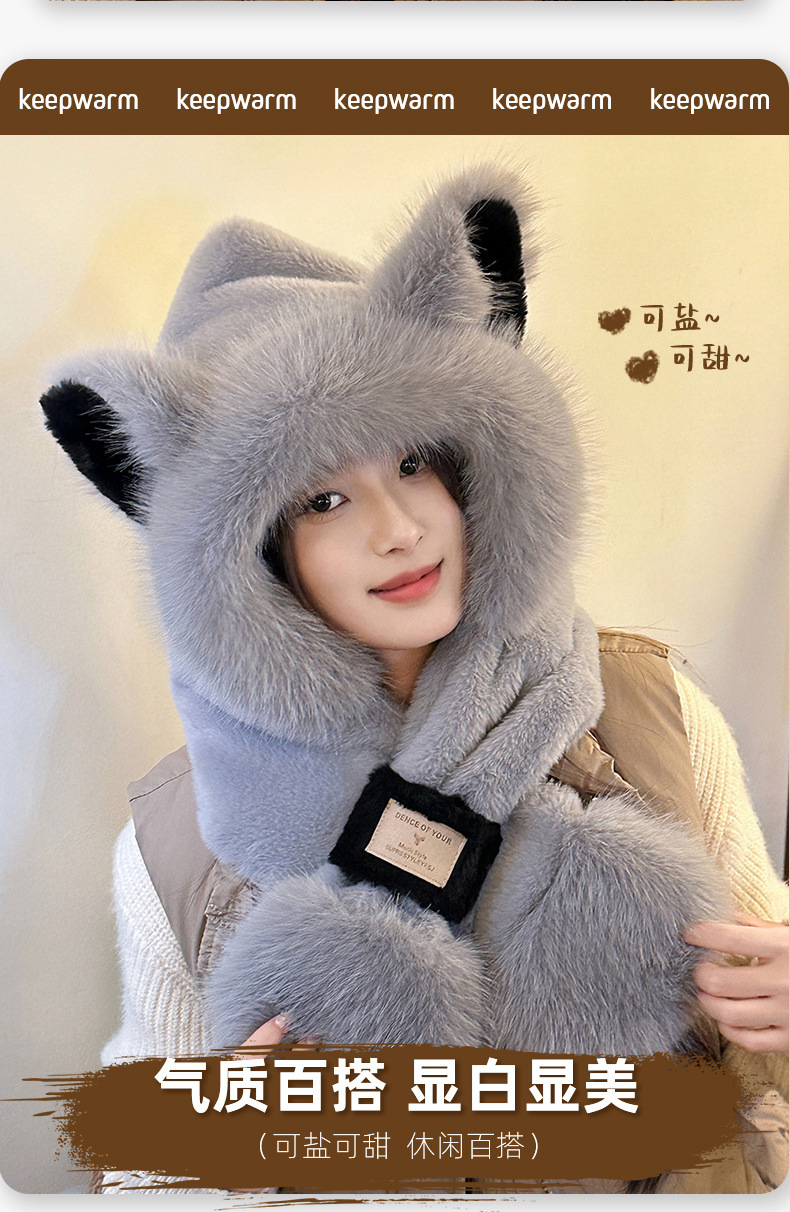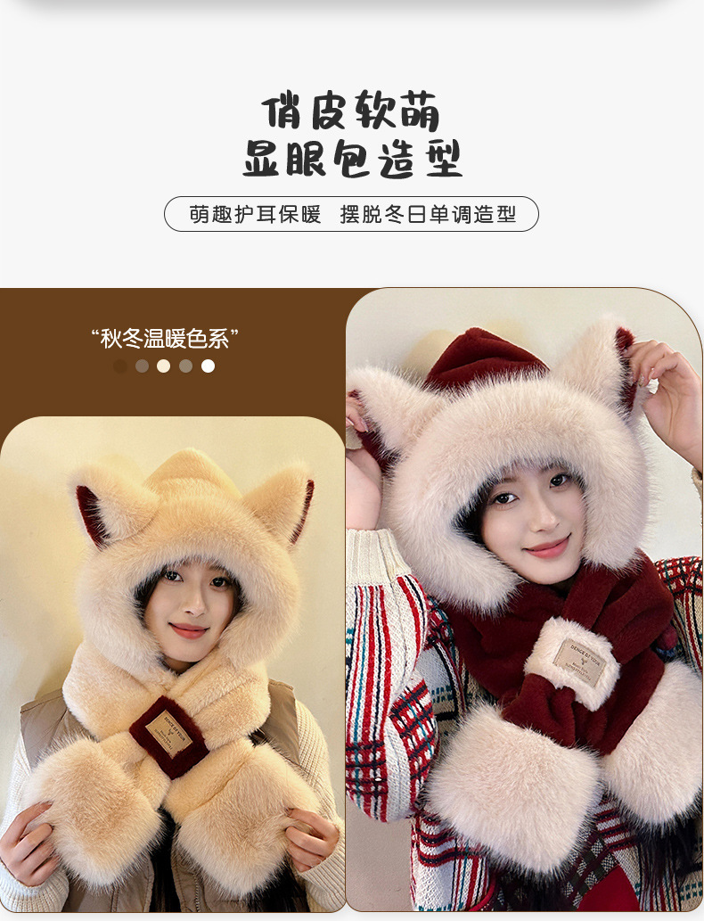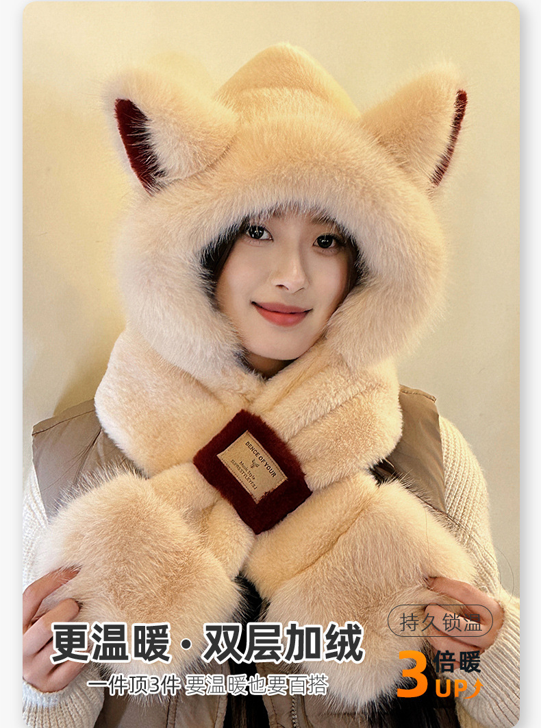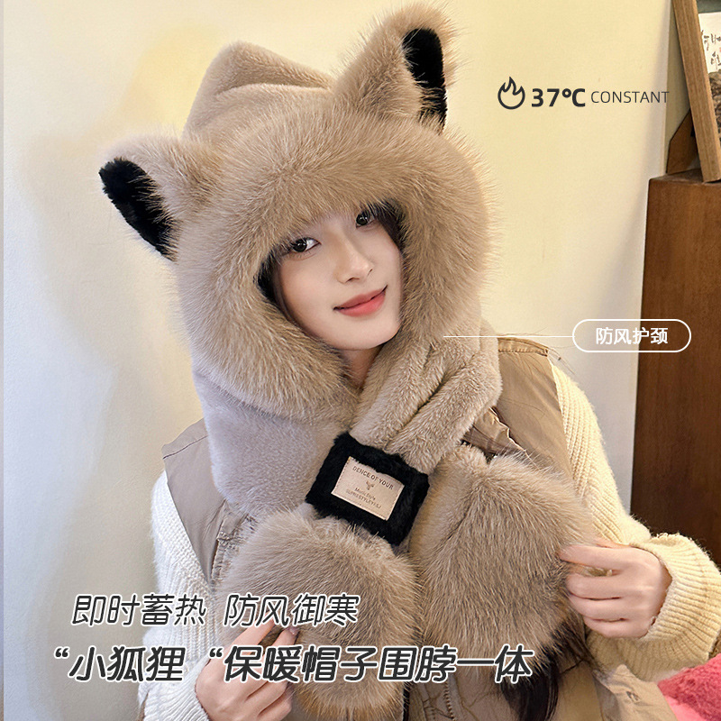 韩版毛绒可爱狐狸耳帽子围巾一体女秋冬季两件套连帽围脖骑车保暖