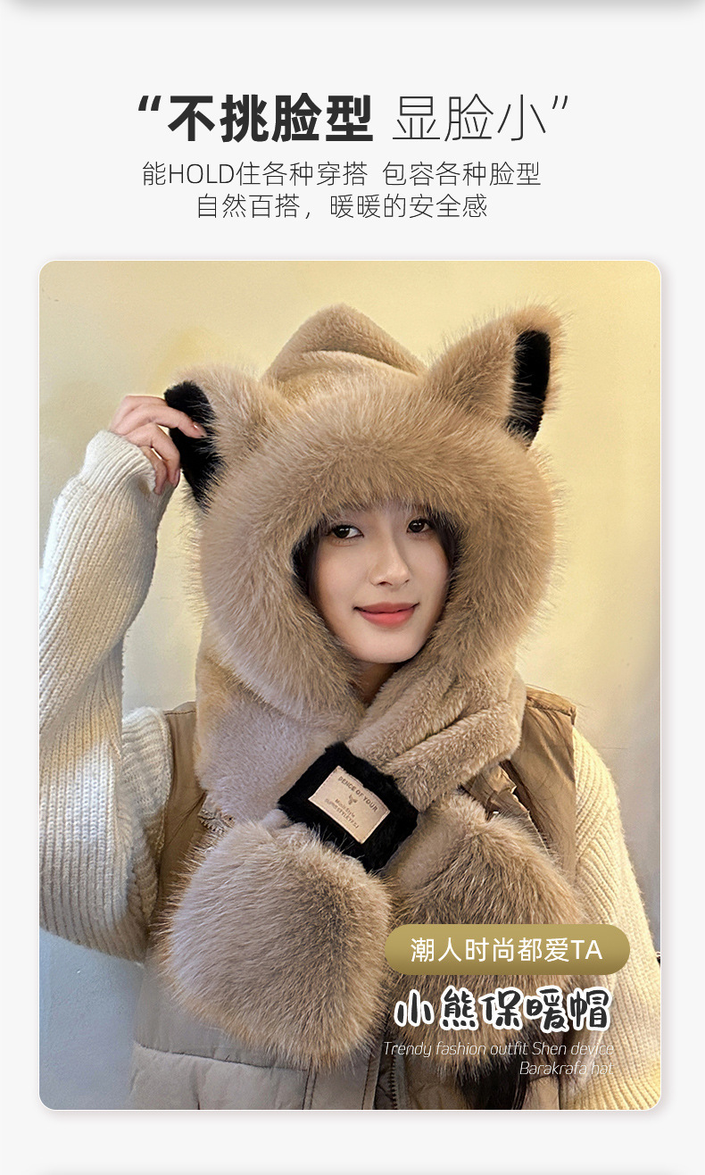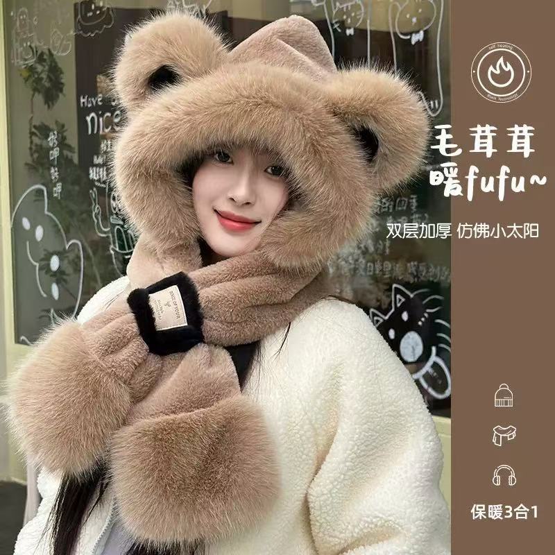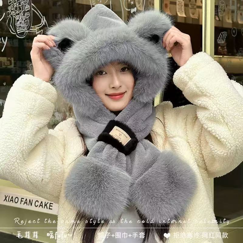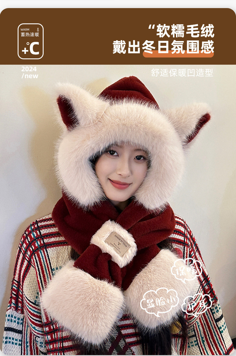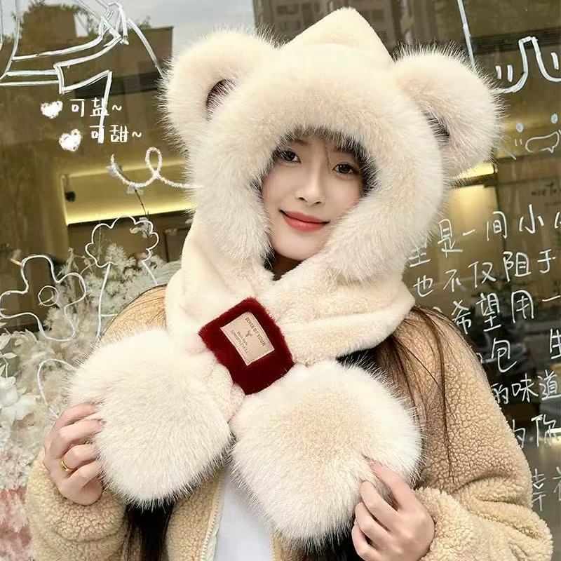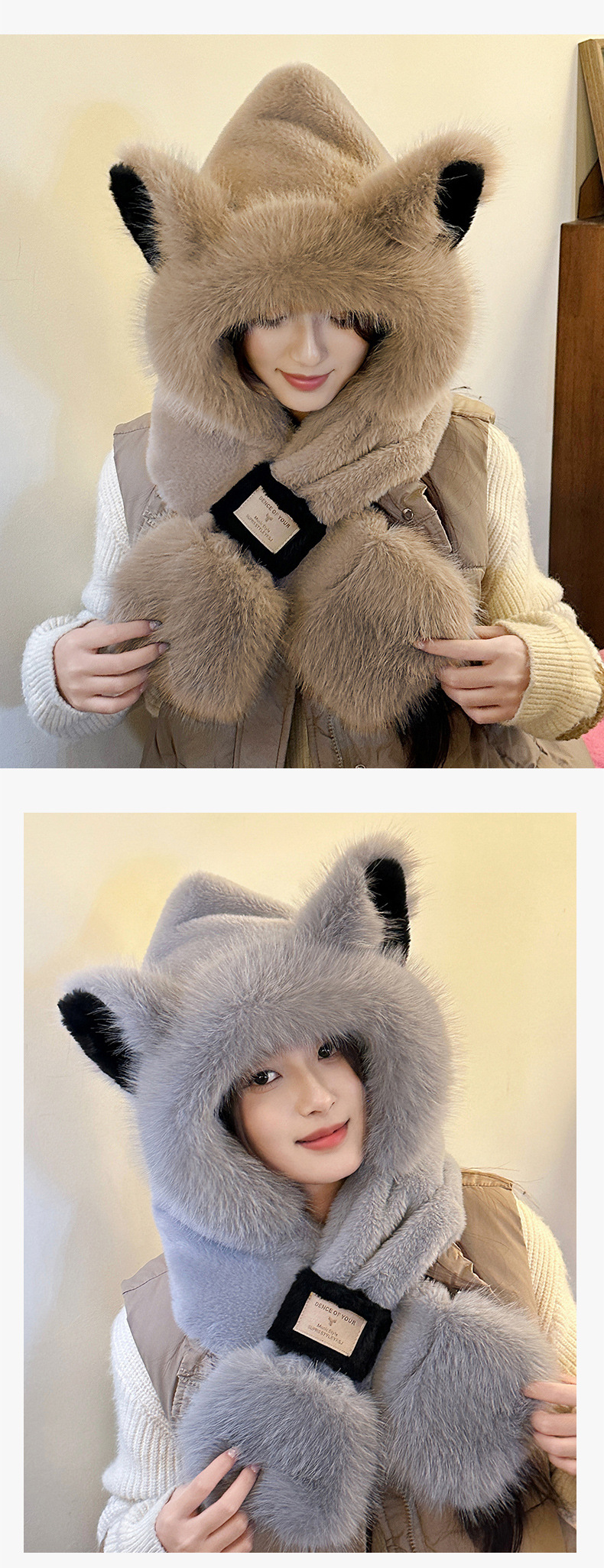 韩版毛绒可爱狐狸耳帽子围巾一体女秋冬季两件套连帽围脖骑车保暖