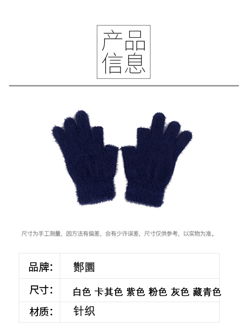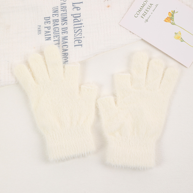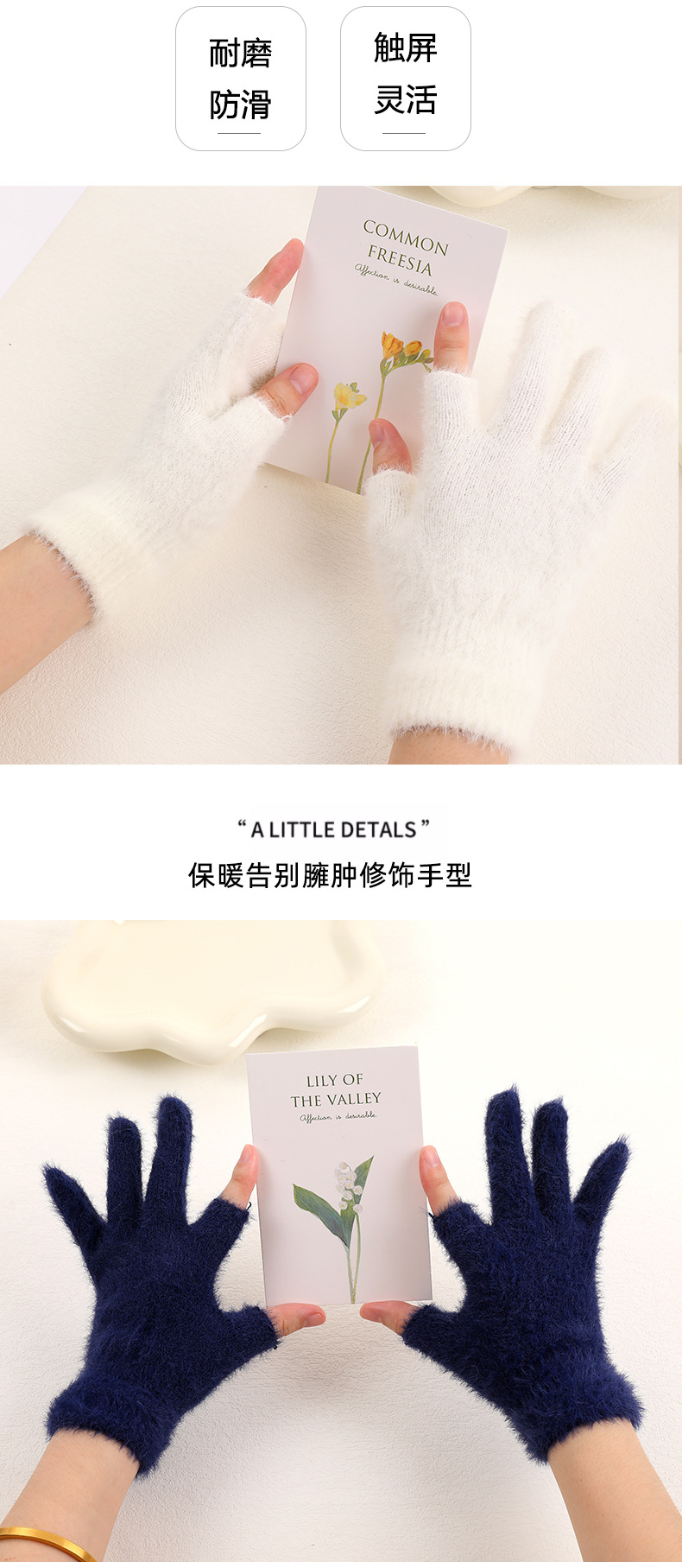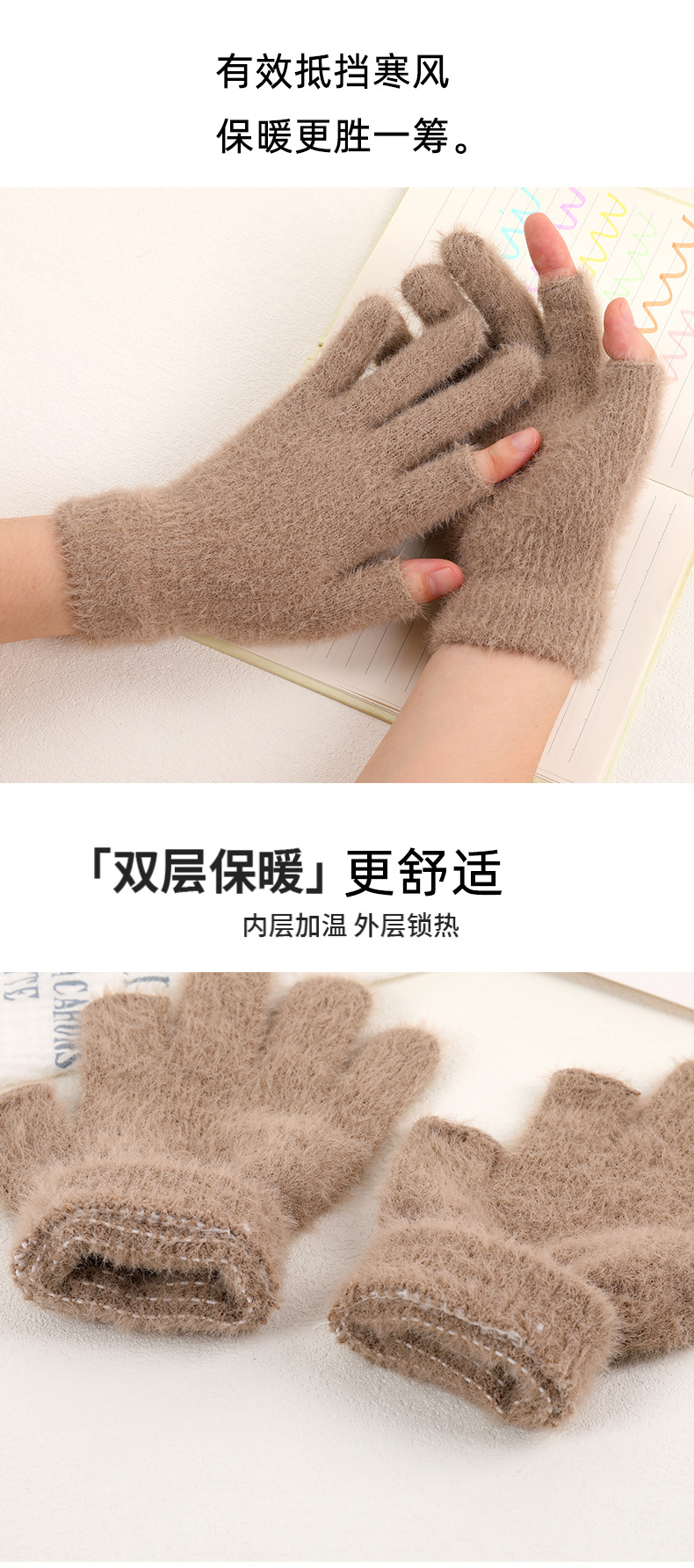 可触屏毛绒手套女冬季保暖学生露指头手套户外俩半指加厚写字手套