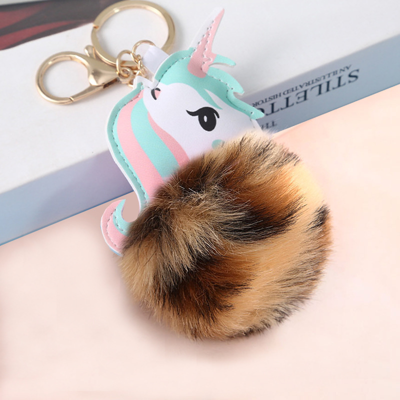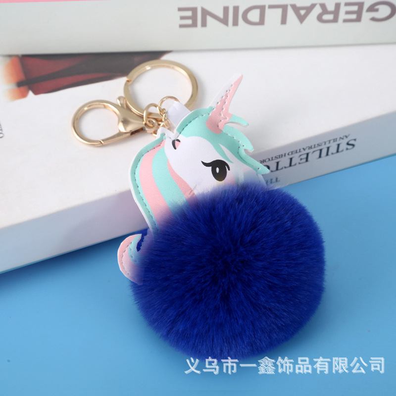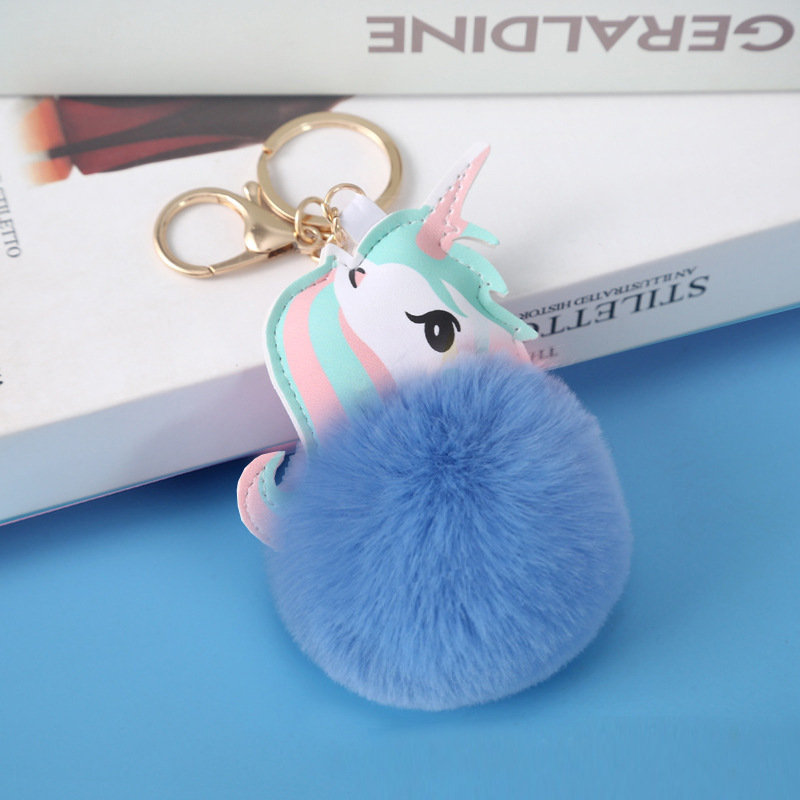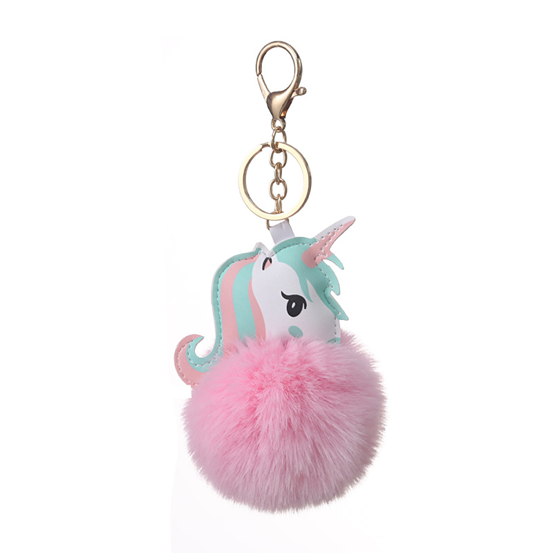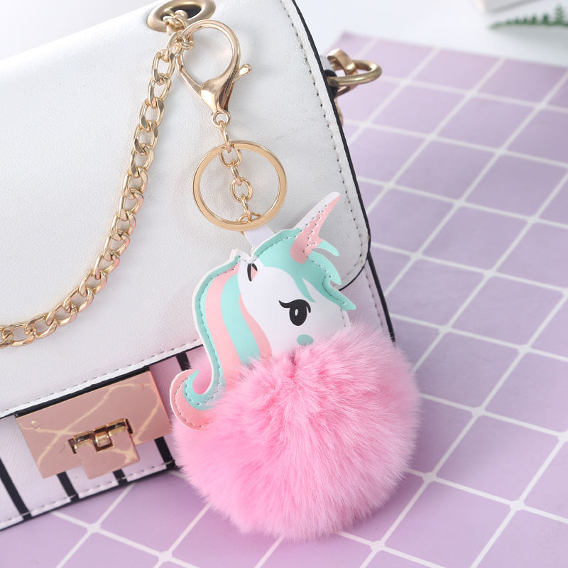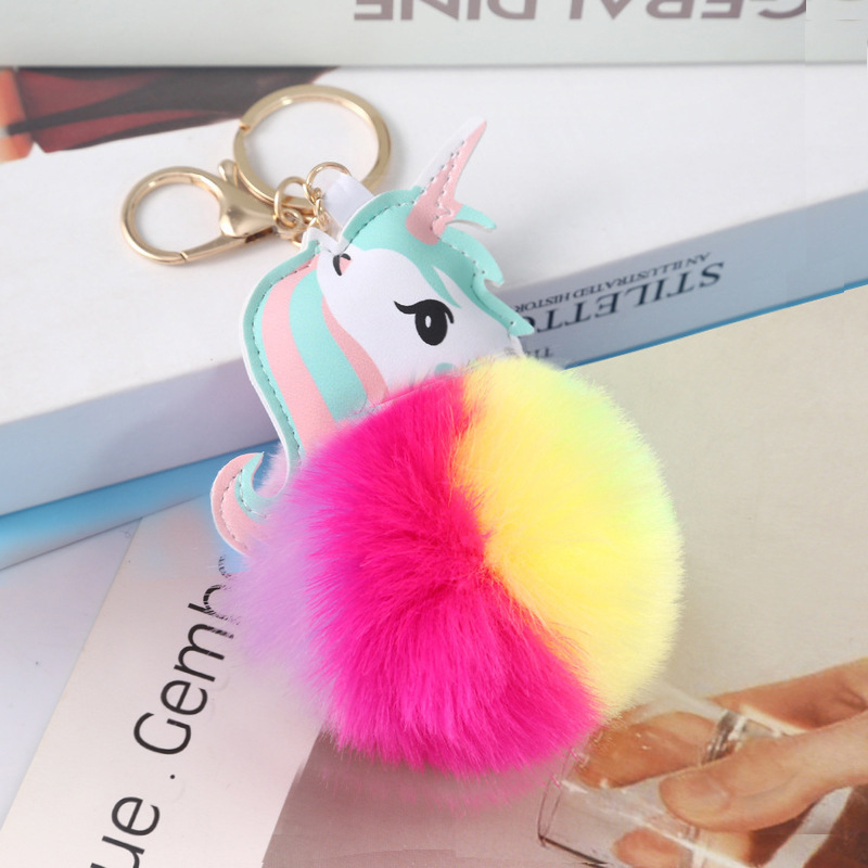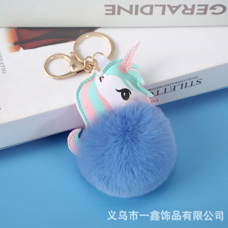 地摊货源PU彩色独角兽毛球钥匙扣 可爱包包吊饰仿獭兔毛书包挂件