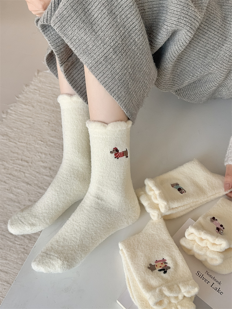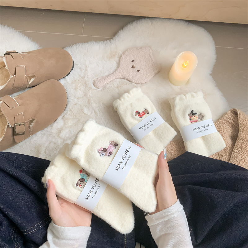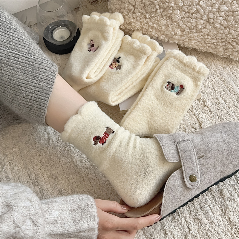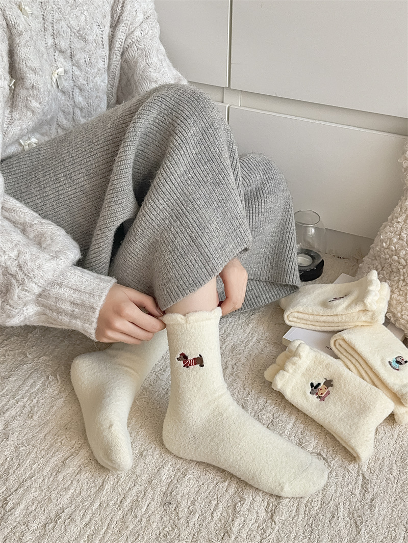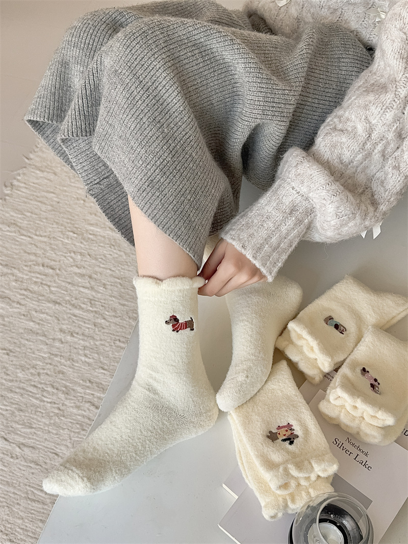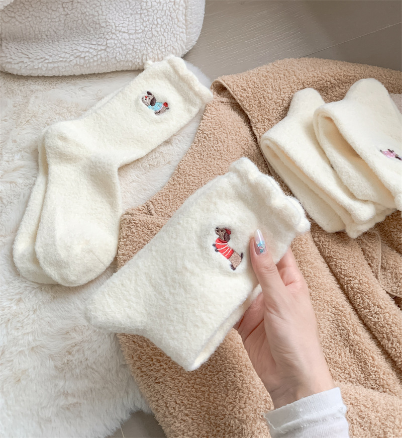 可爱俏皮袜子女中筒袜秋冬加绒加厚保暖袜日系卡通毛绒腊肠狗长袜