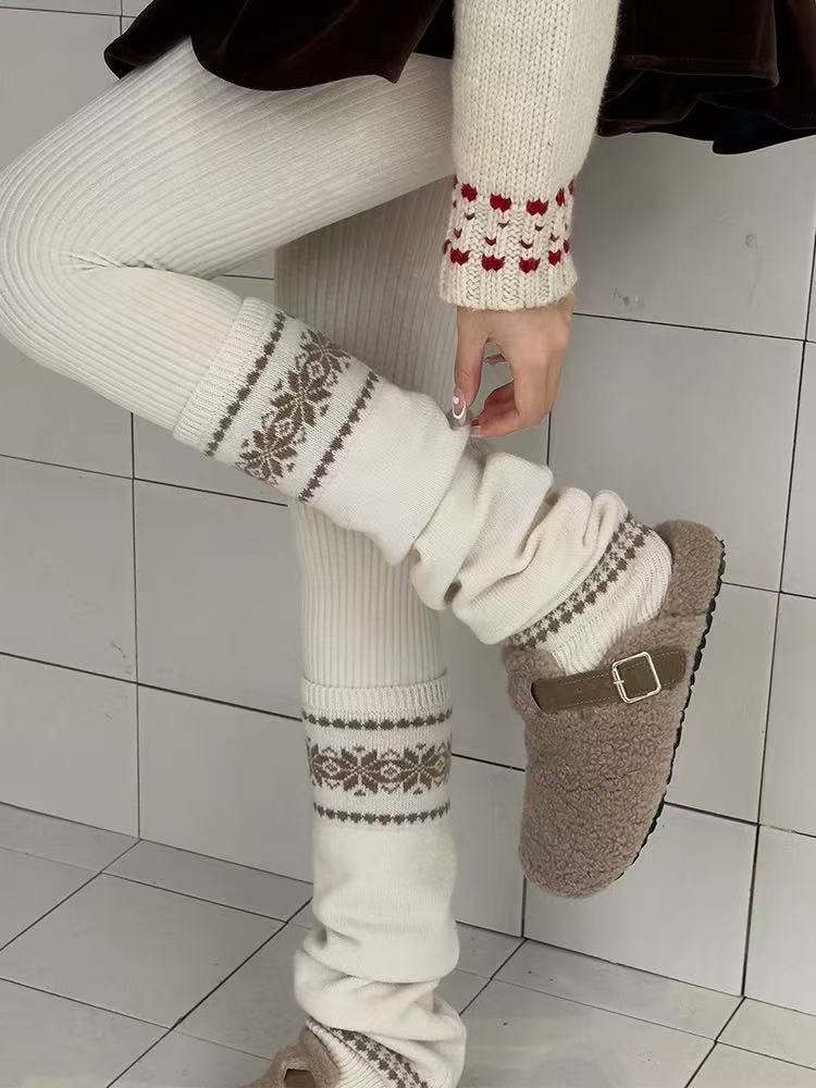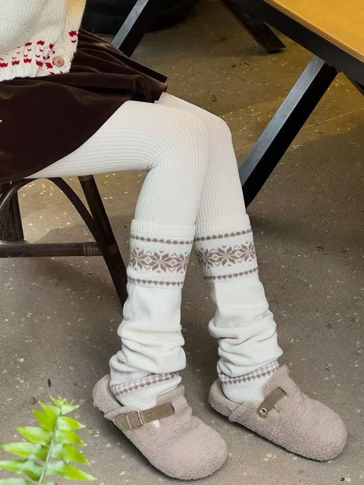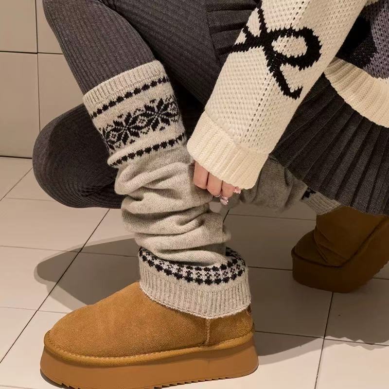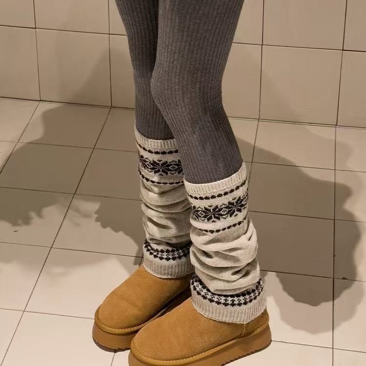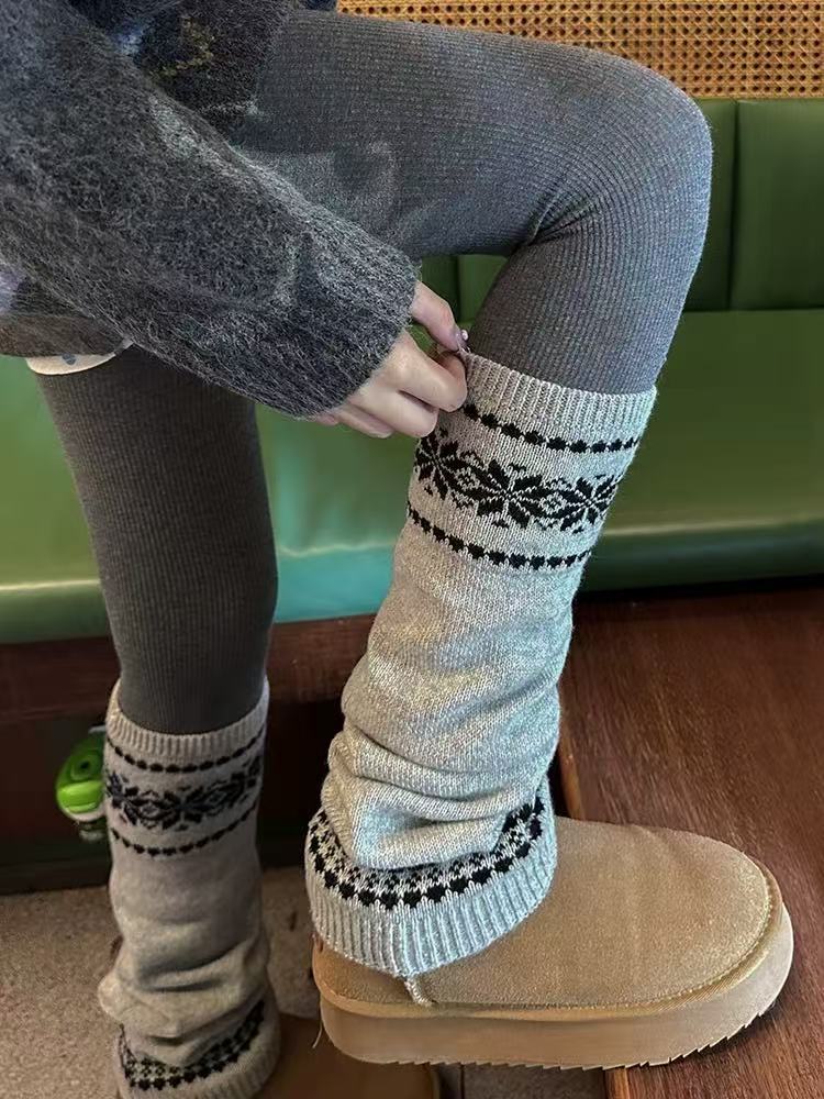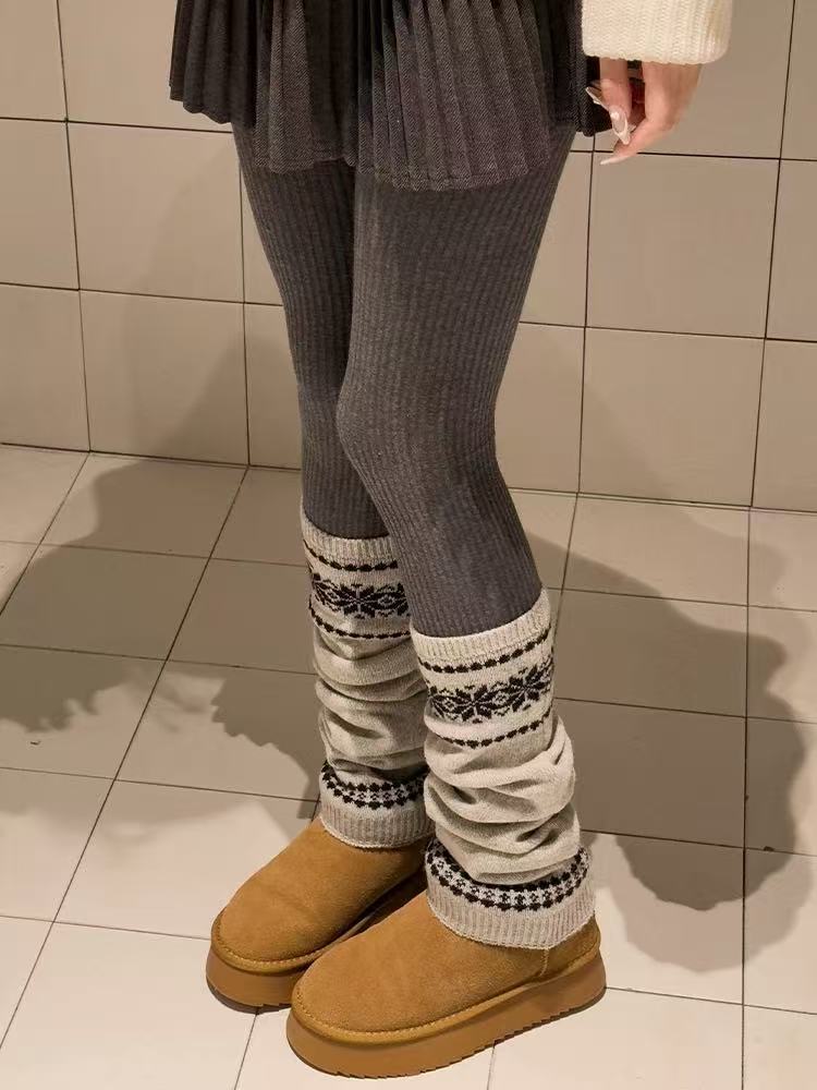 韩系费尔岛女款袜子秋冬堆堆袜套粗线针织雪花显瘦保暖灰色小腿套