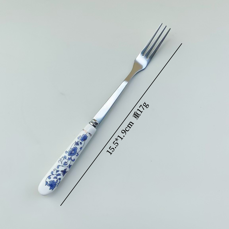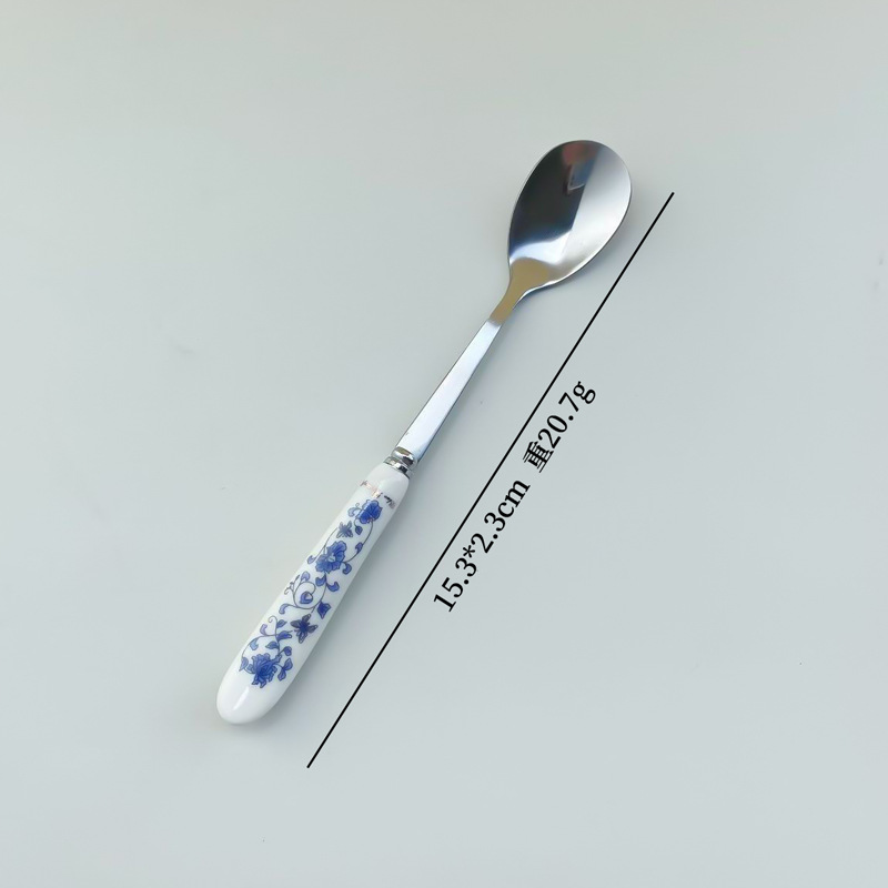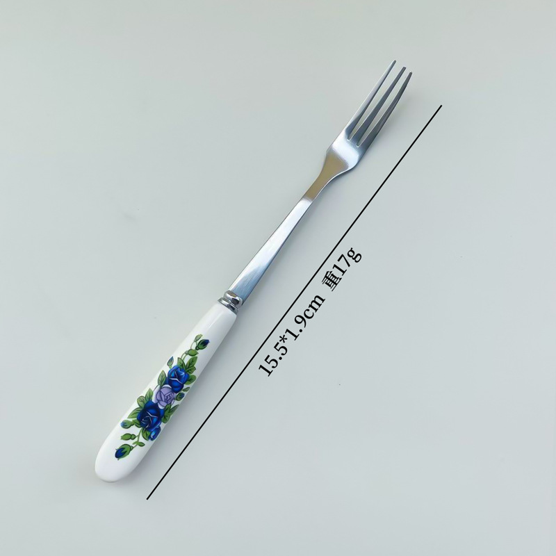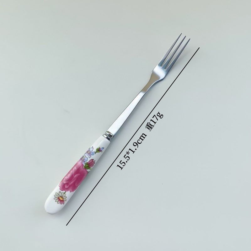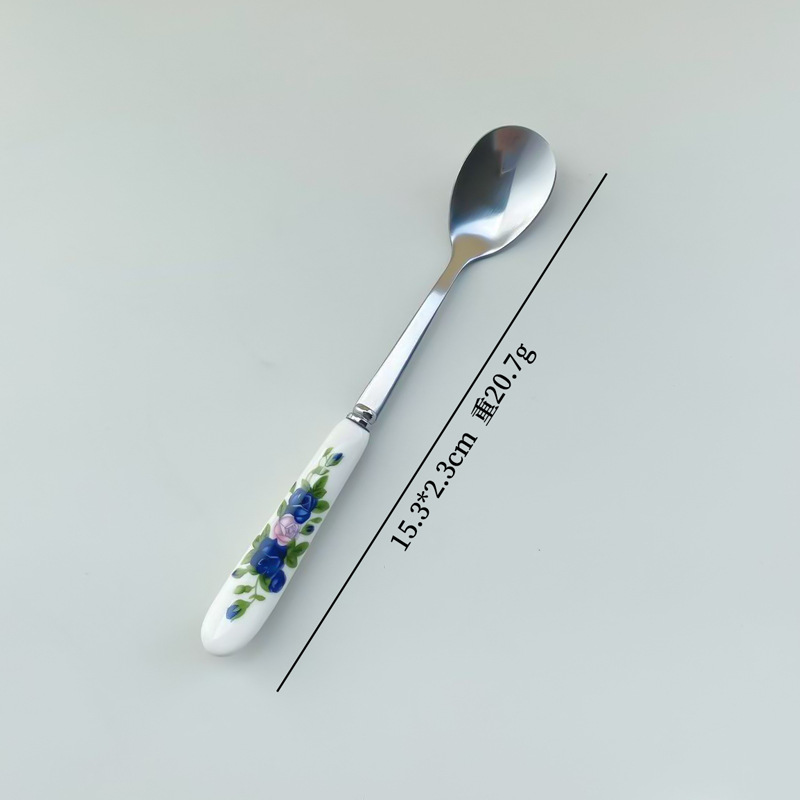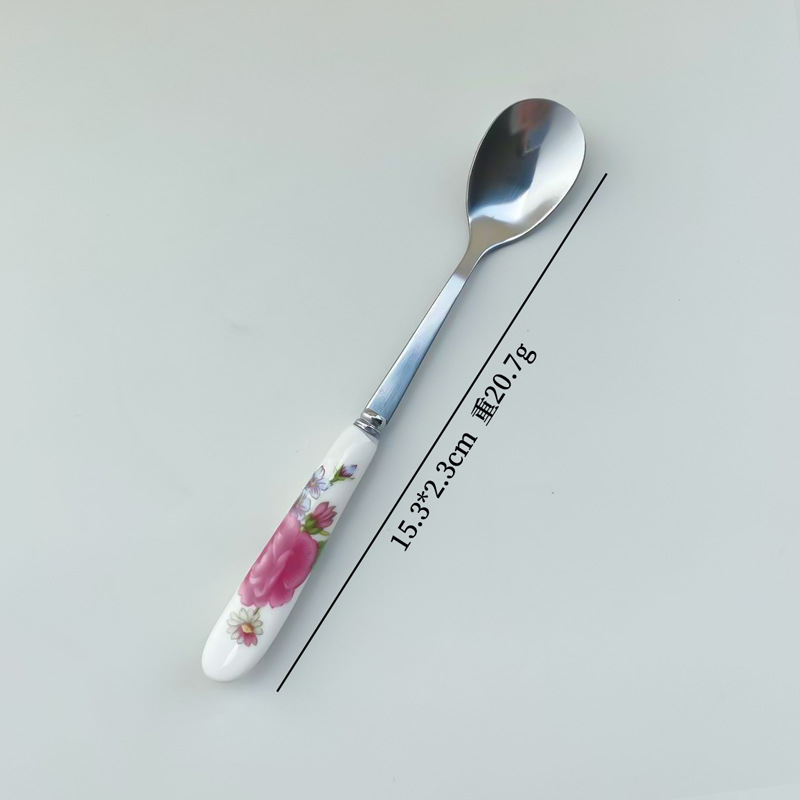 陶瓷柄不锈钢勺子韩式贴花咖啡勺长柄搅拌勺小号冰叉水果叉甜品勺