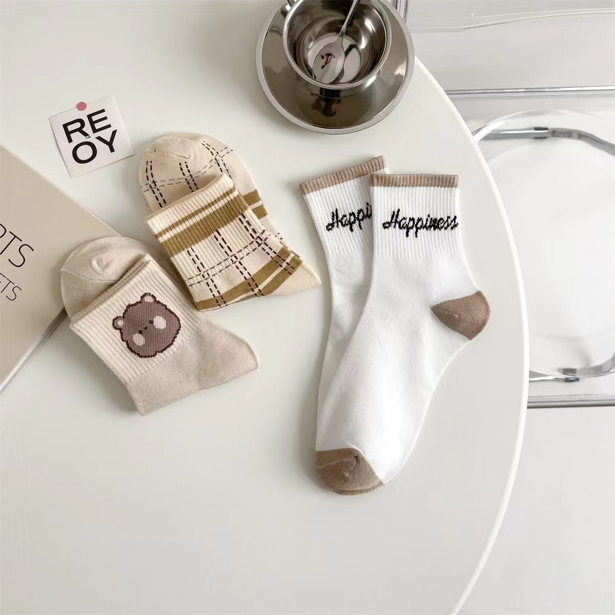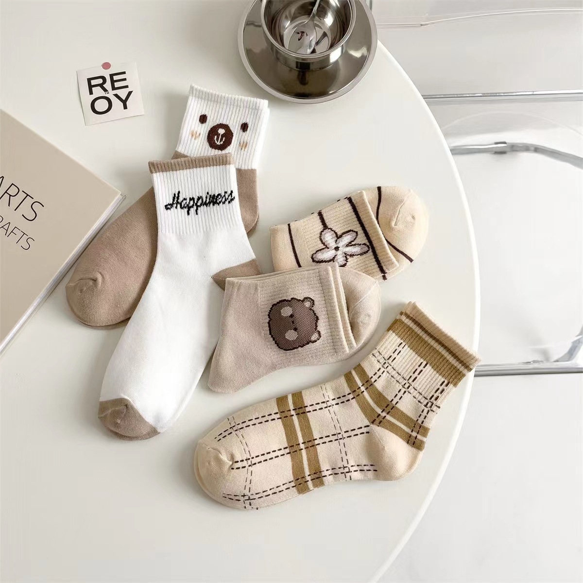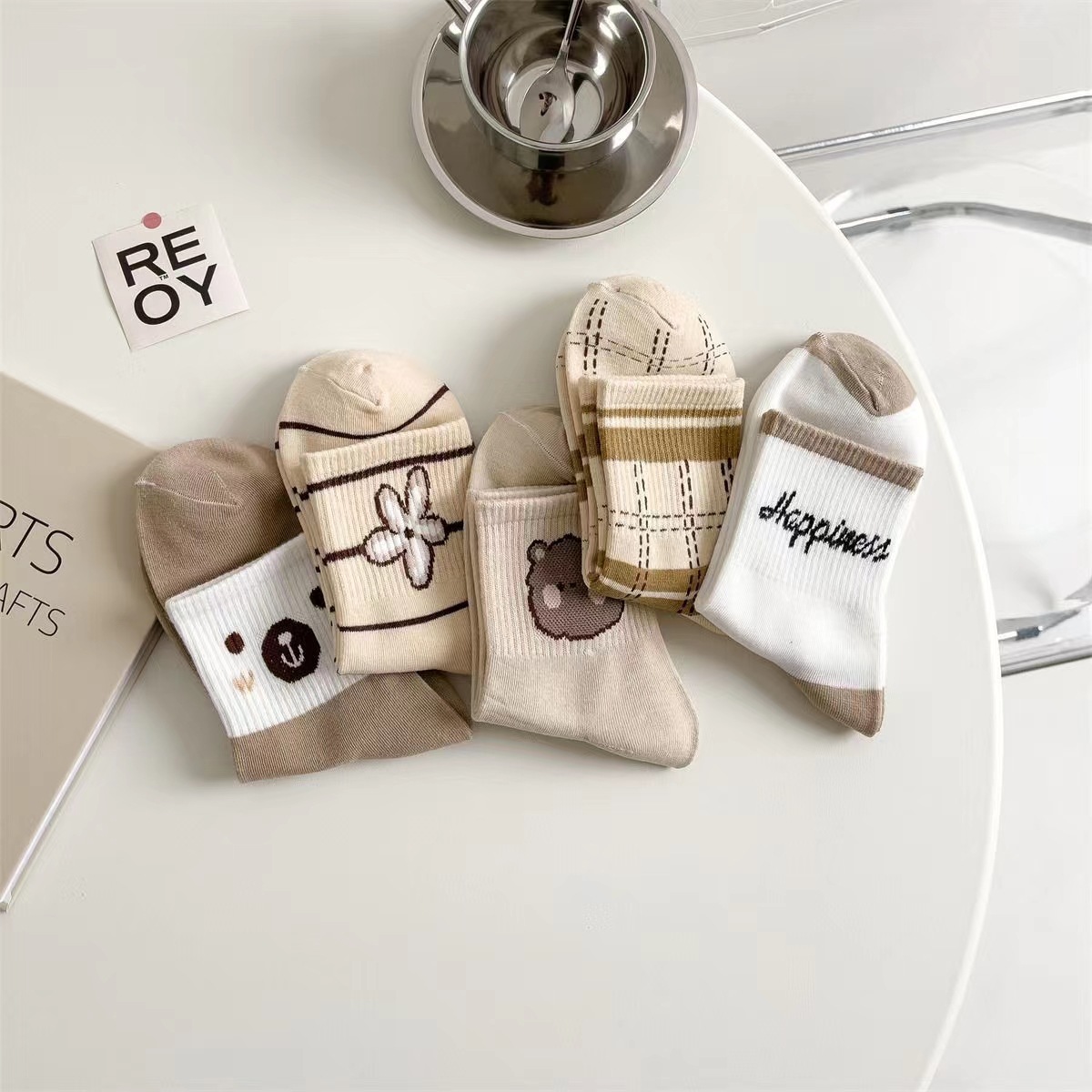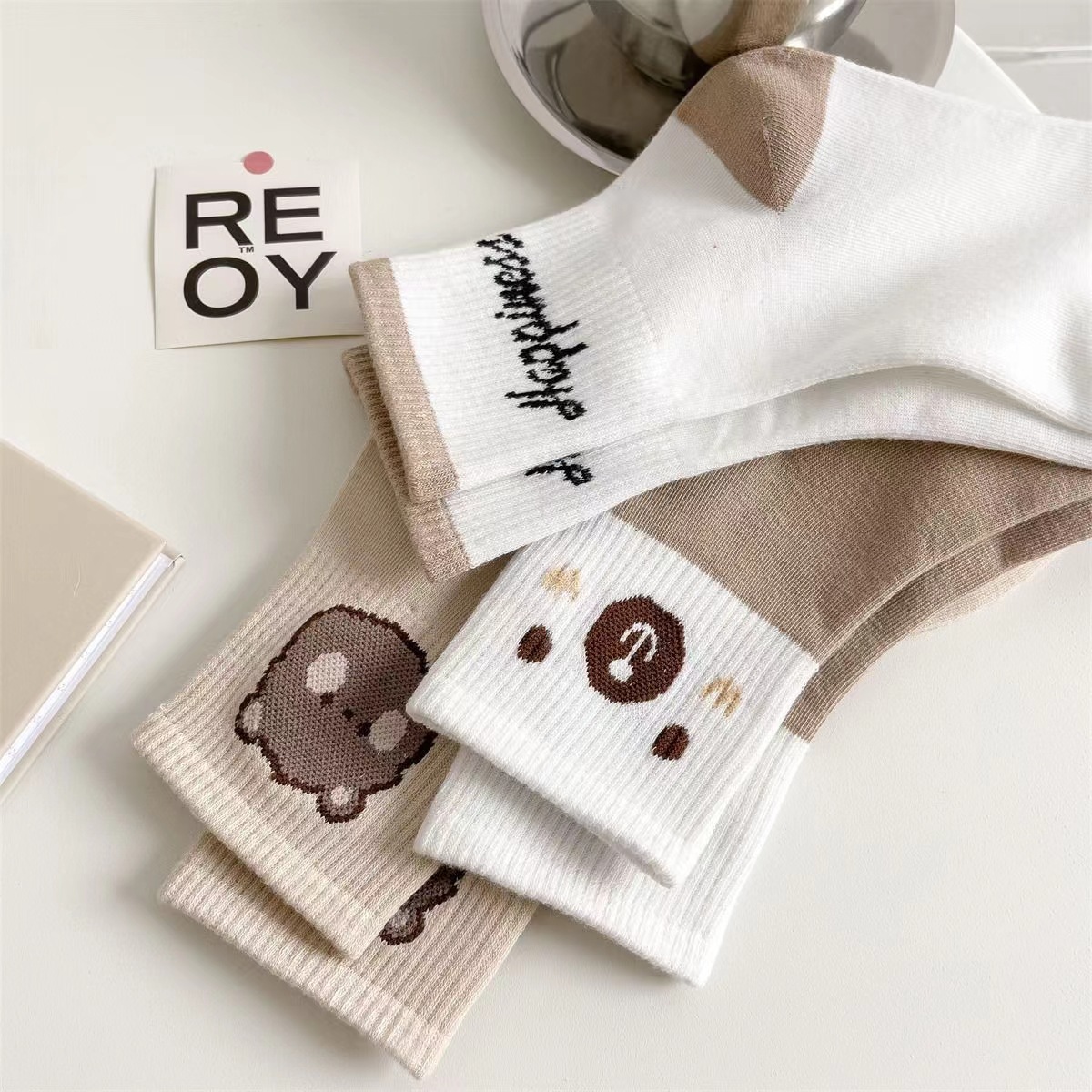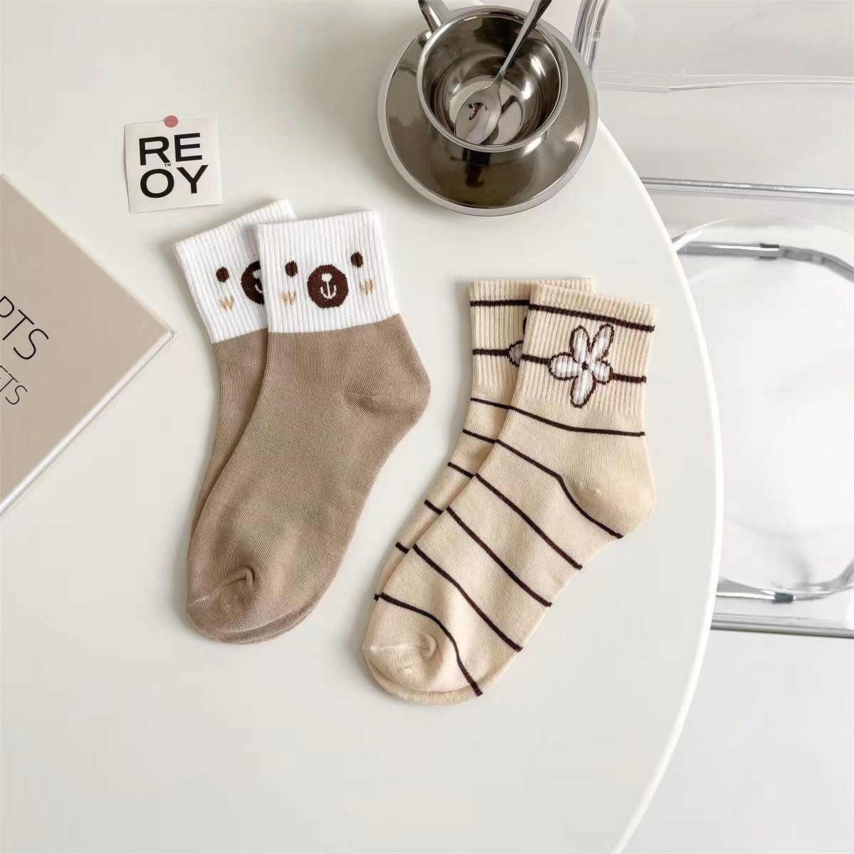袜子女春秋新款中筒袜咖色小熊ins潮流百搭秋冬棉袜厂家批发