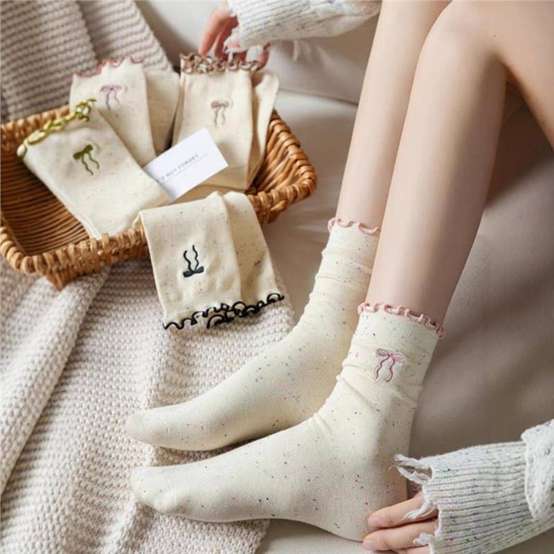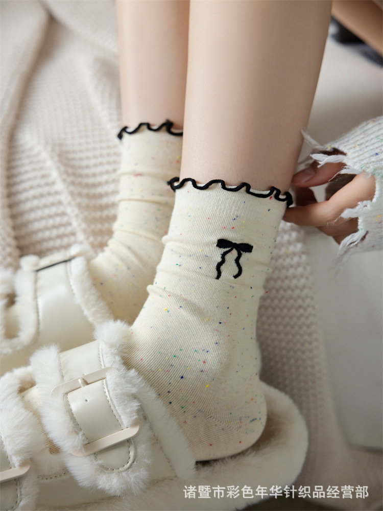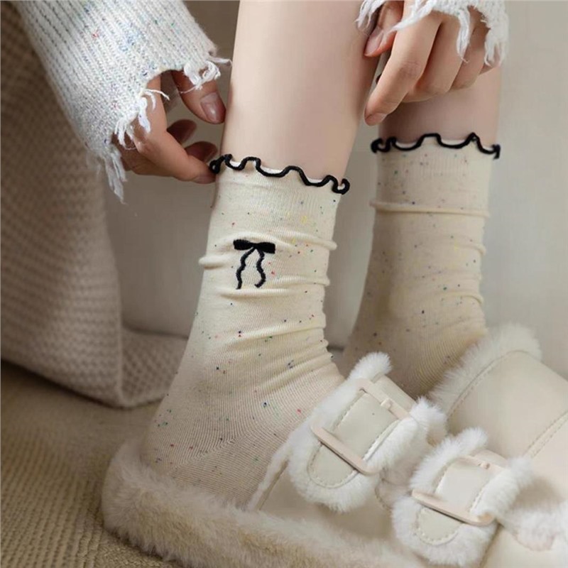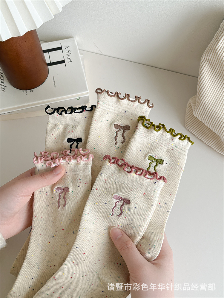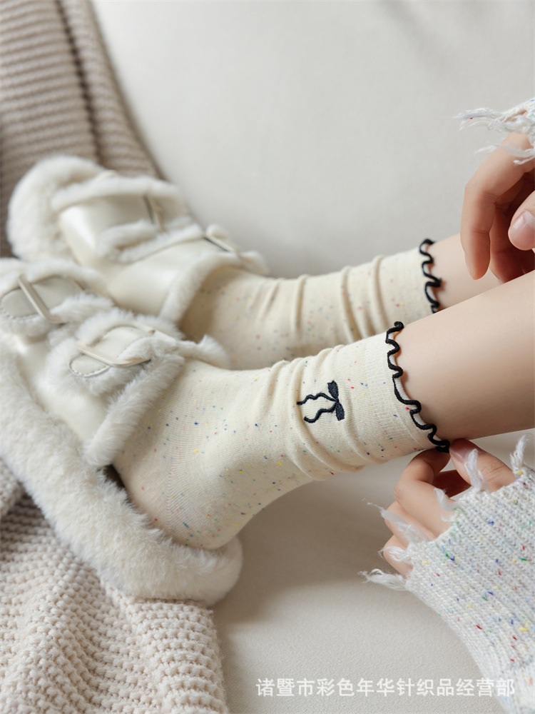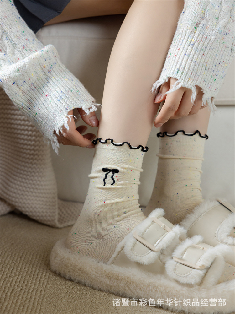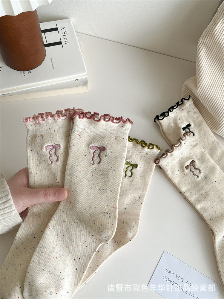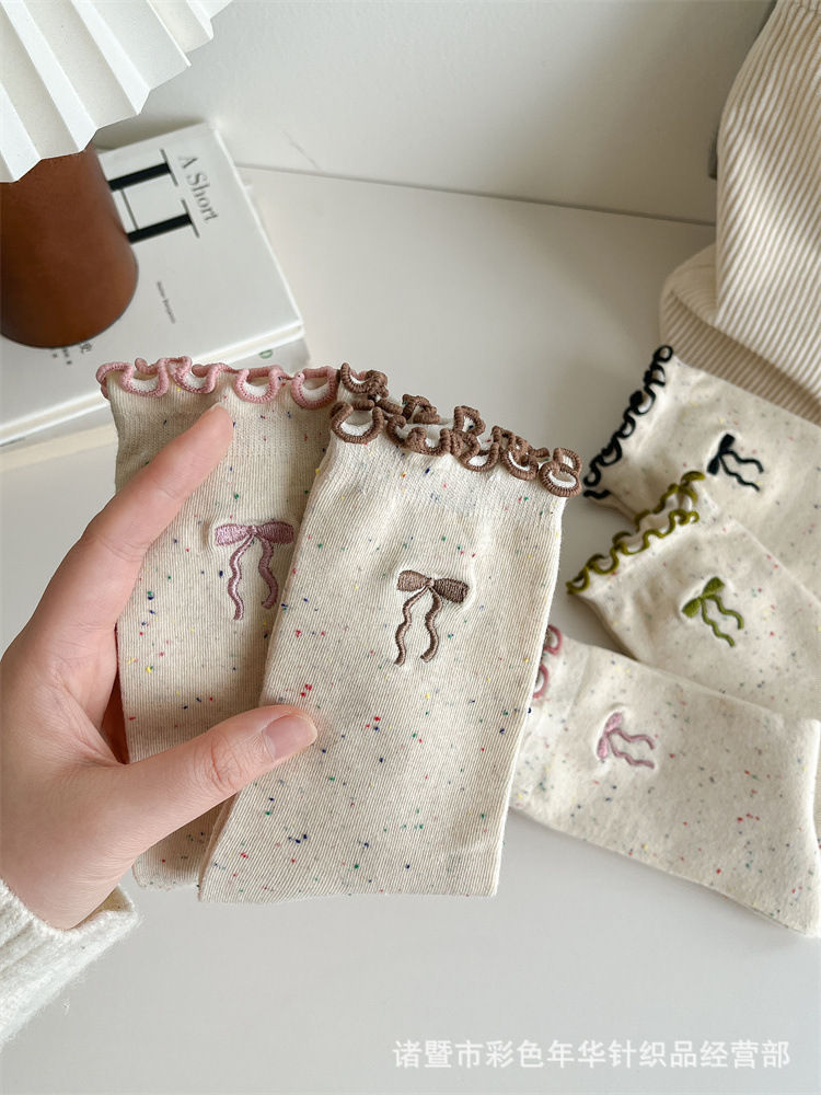 24秋季新款袜子韩版奶油色刺绣蝴蝶结女中筒袜时尚木耳边堆堆袜