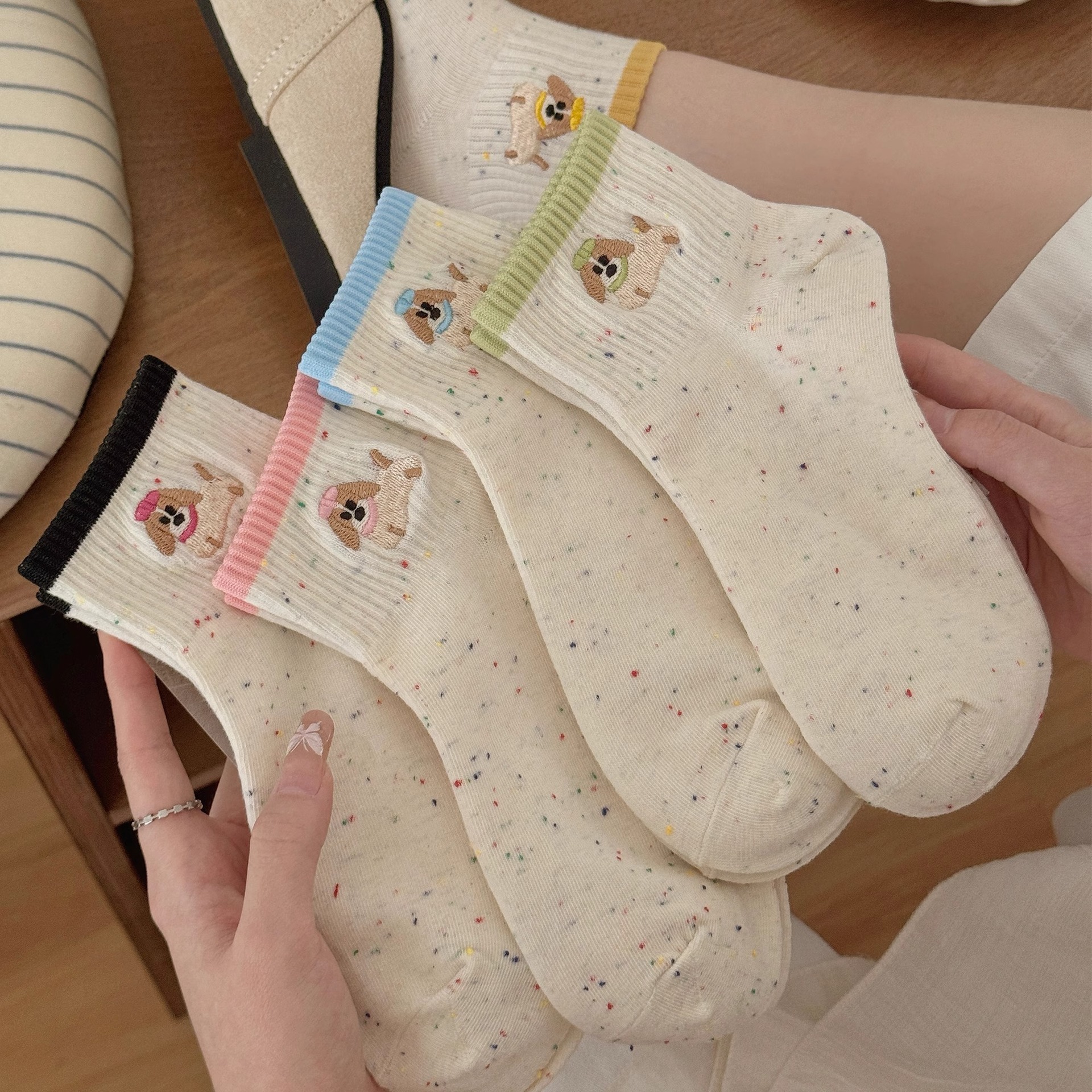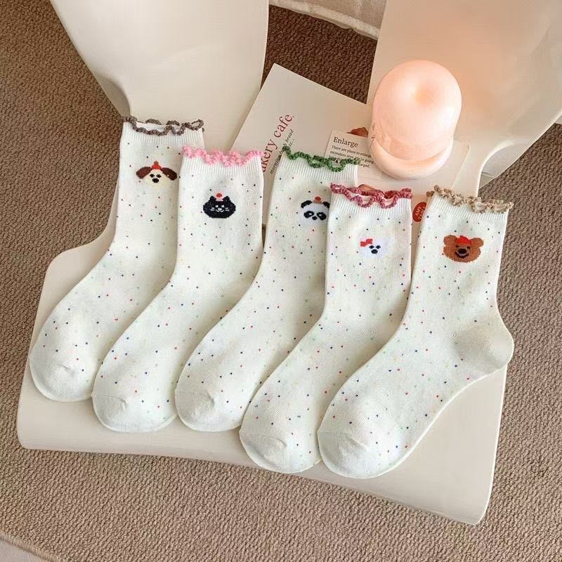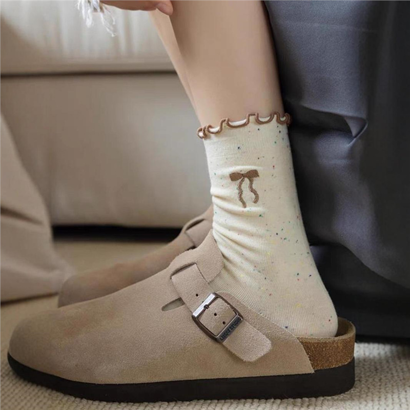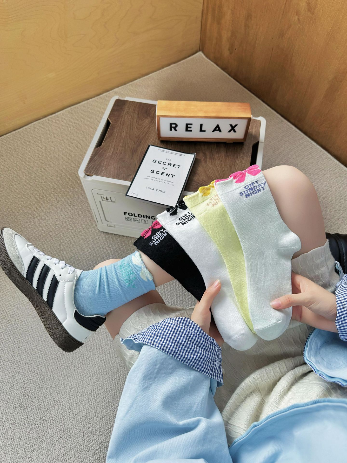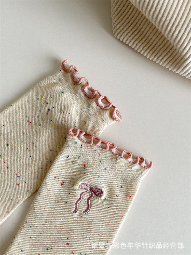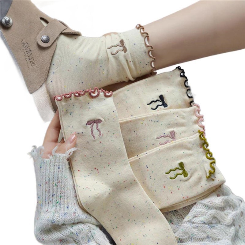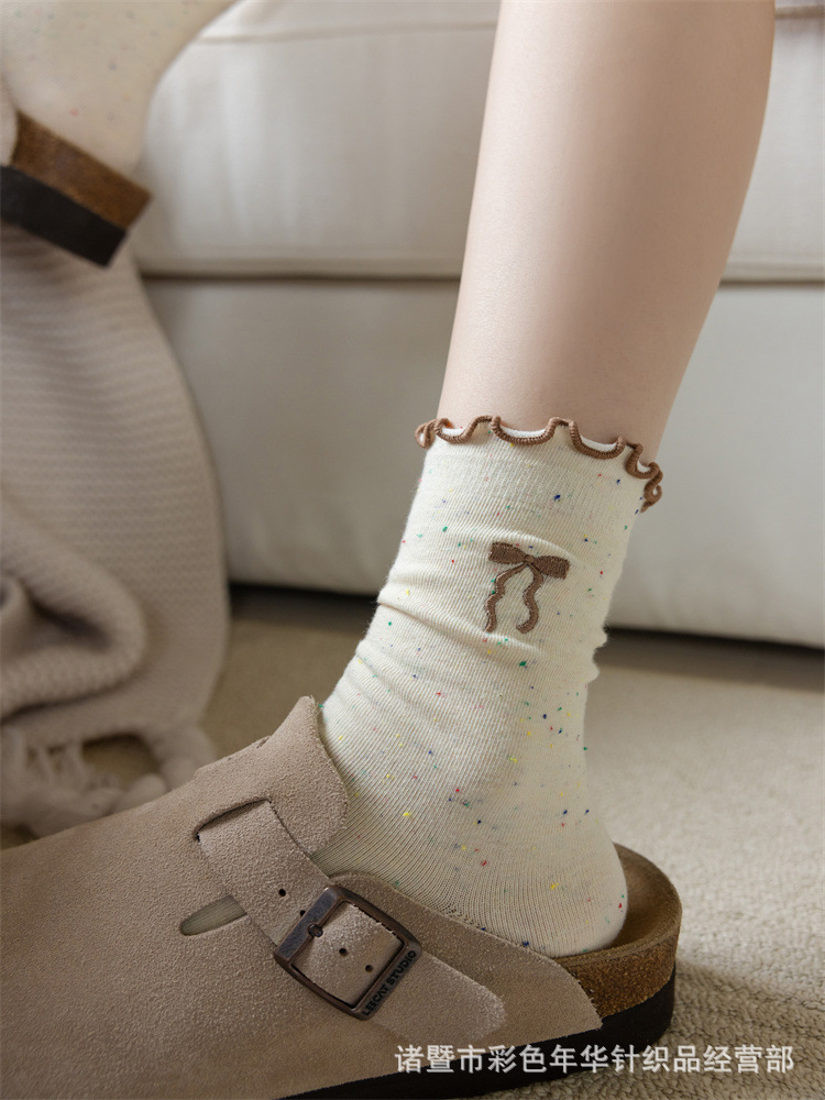 24秋季新款袜子韩版奶油色刺绣蝴蝶结女中筒袜时尚木耳边堆堆袜