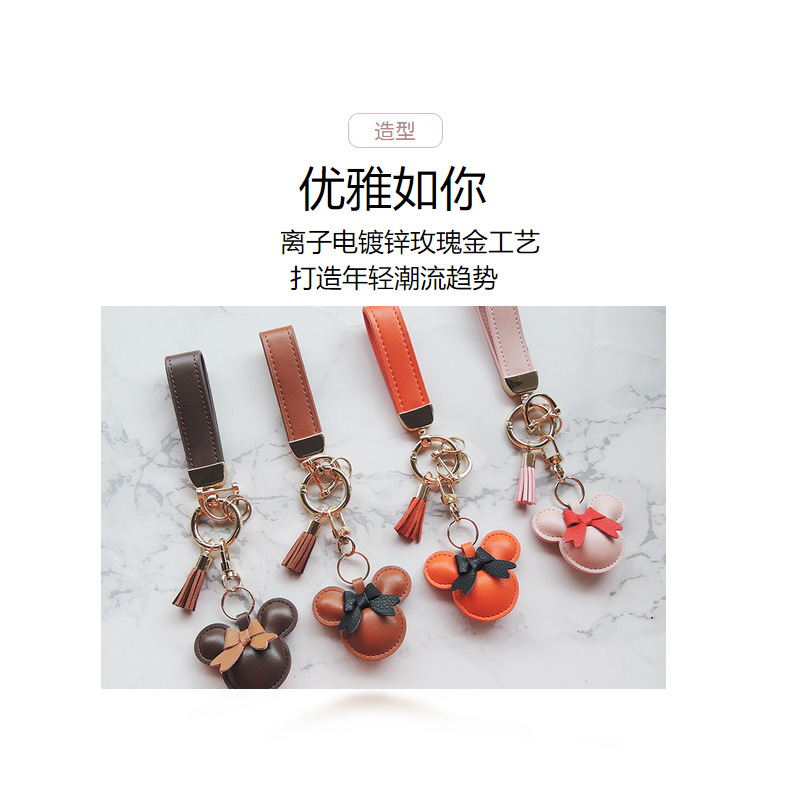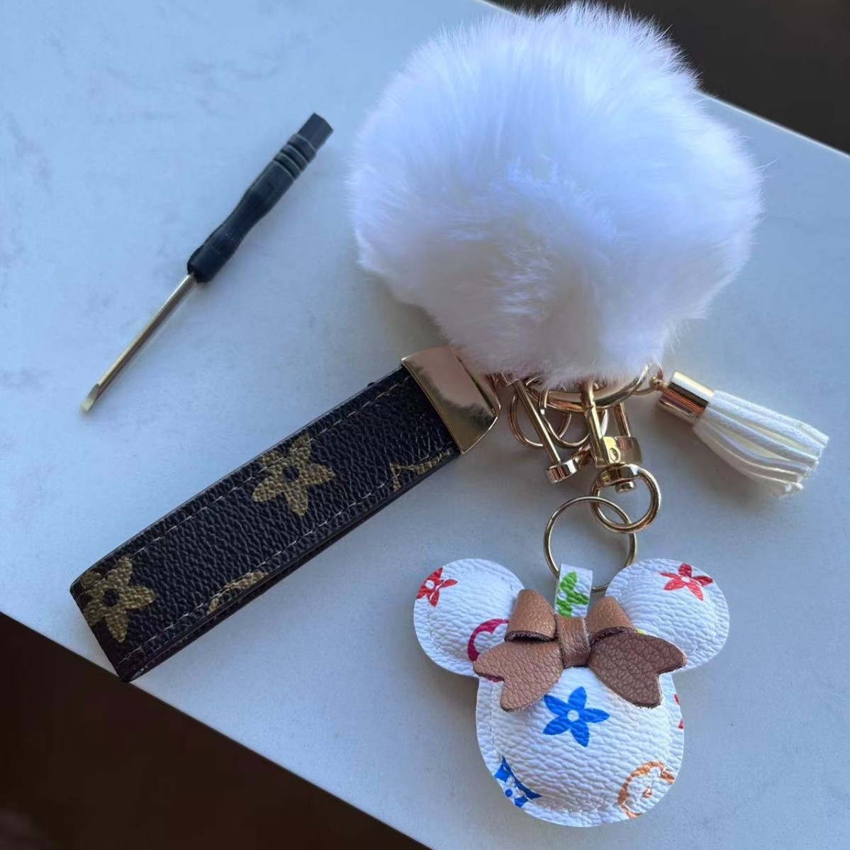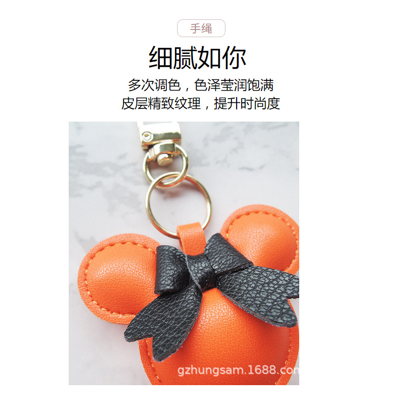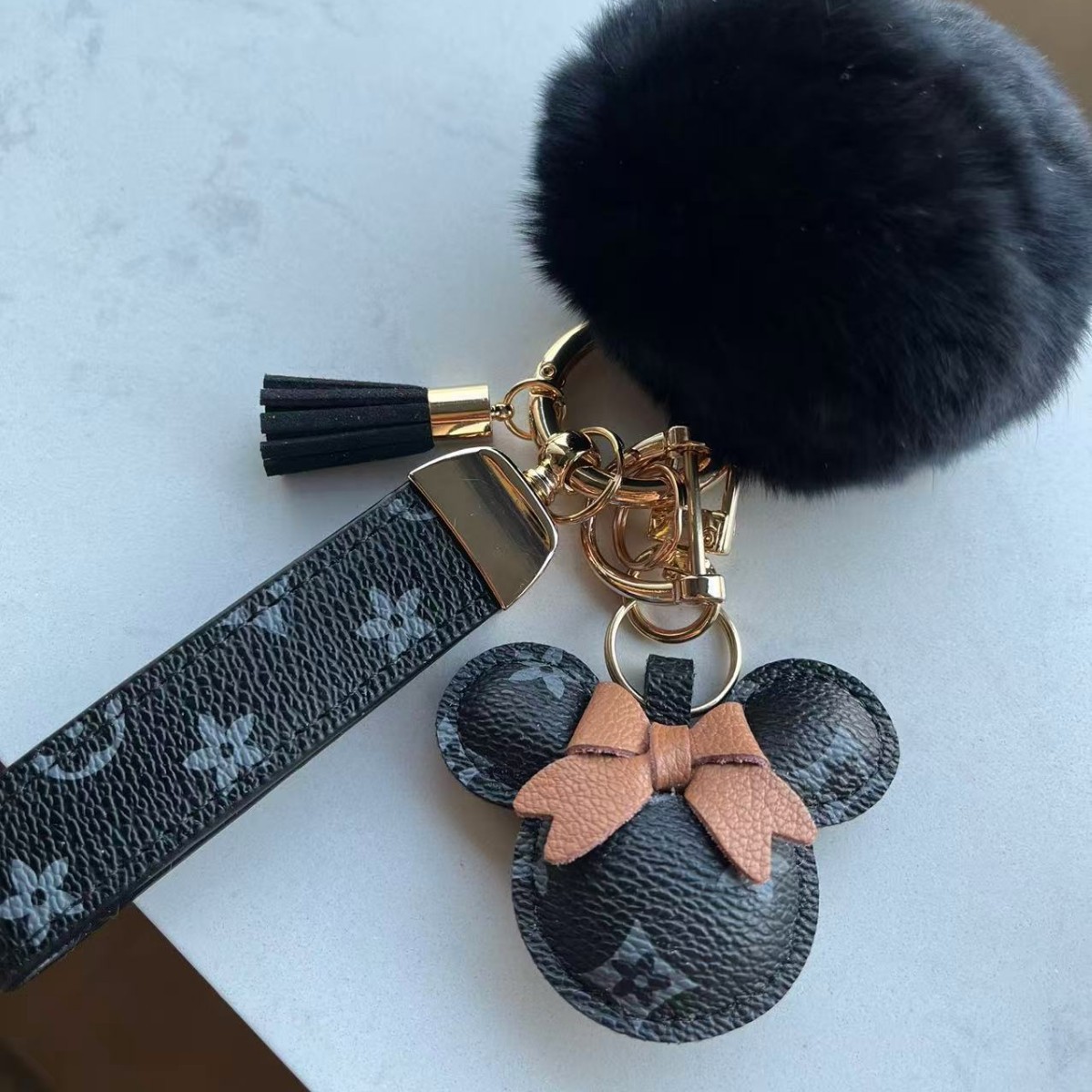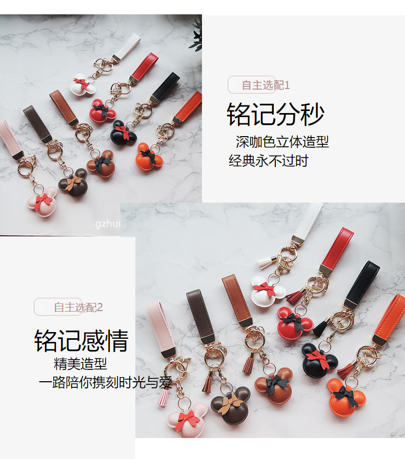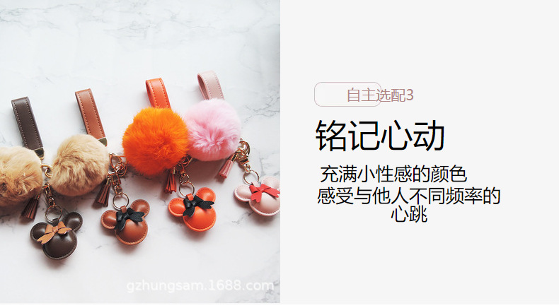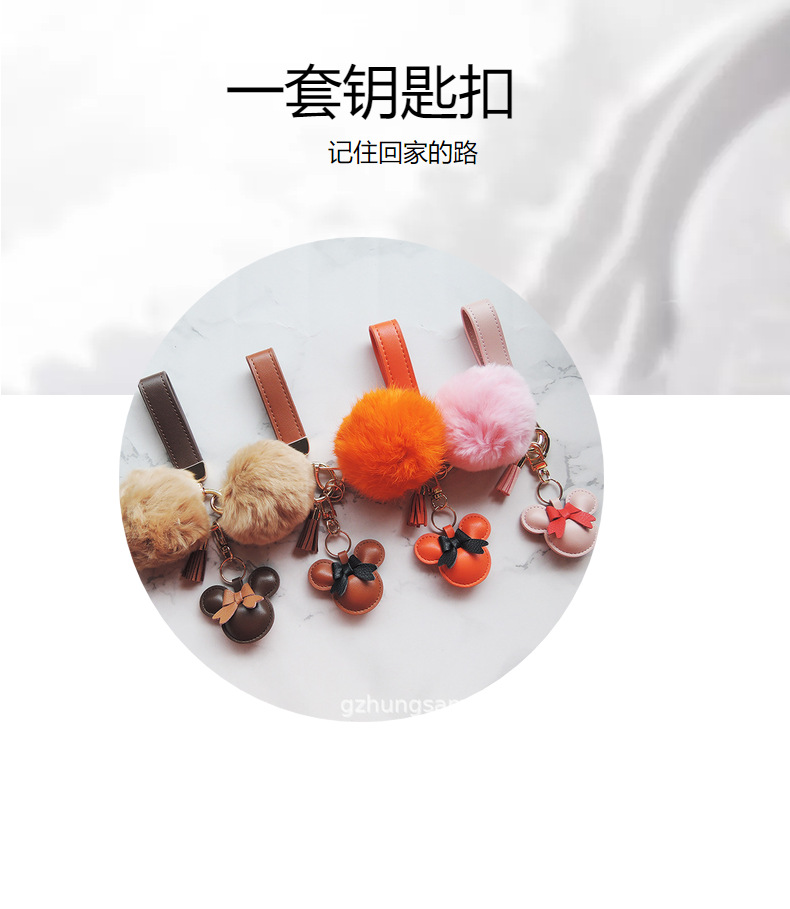 跨境爆款多色环保皮革米奇米妮汽车钥匙扣配天然獭兔毛球手绳挂饰