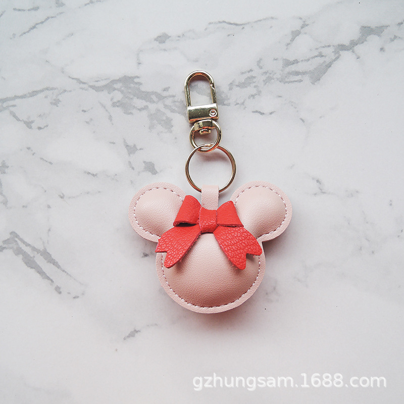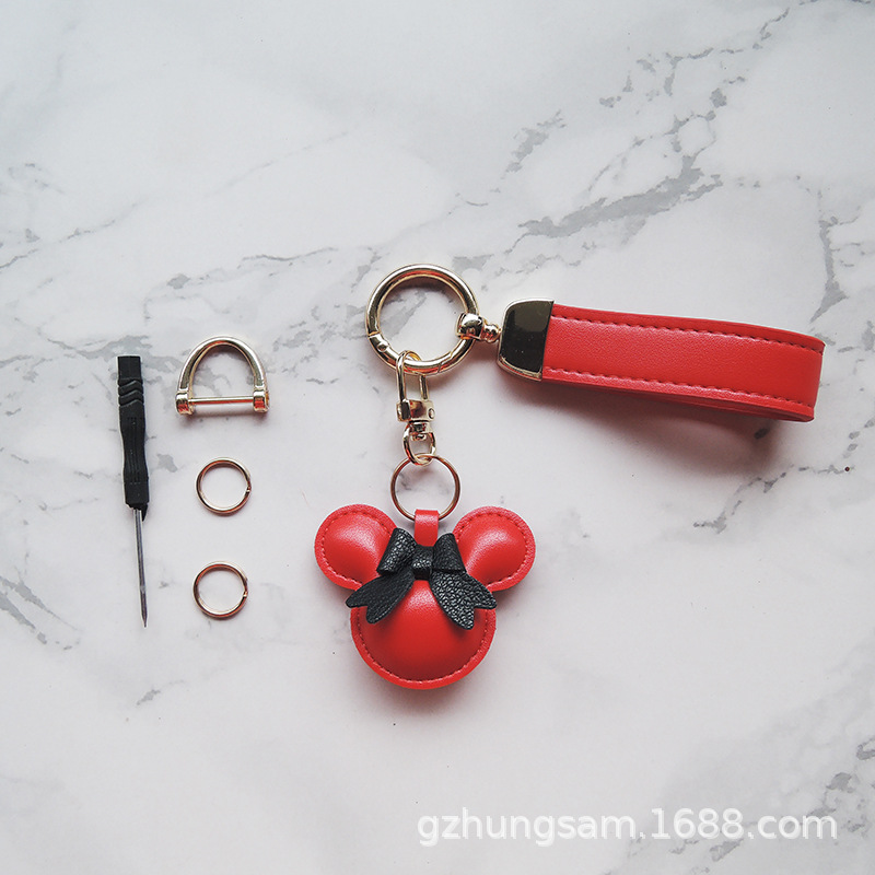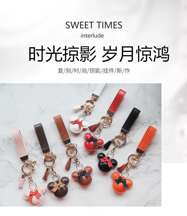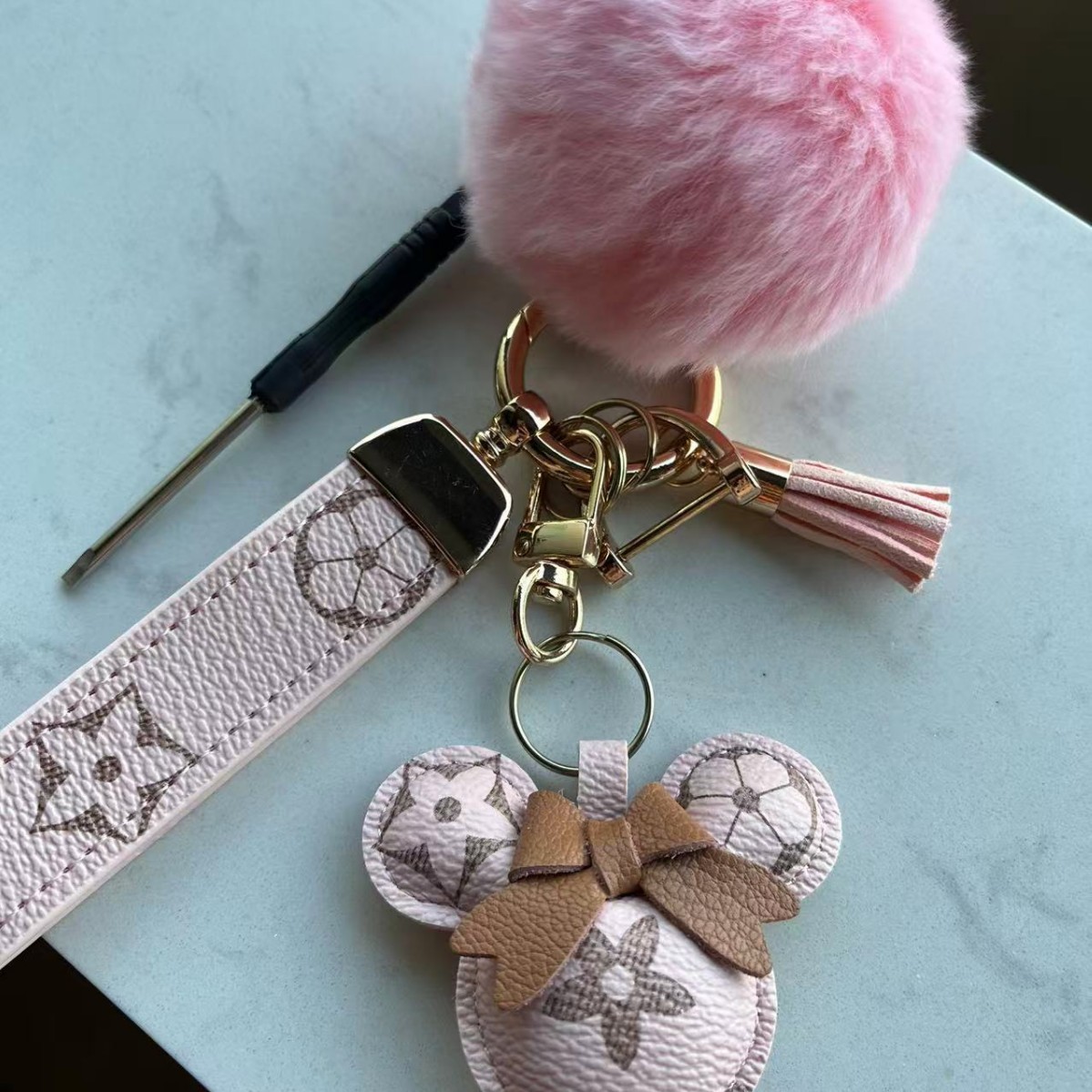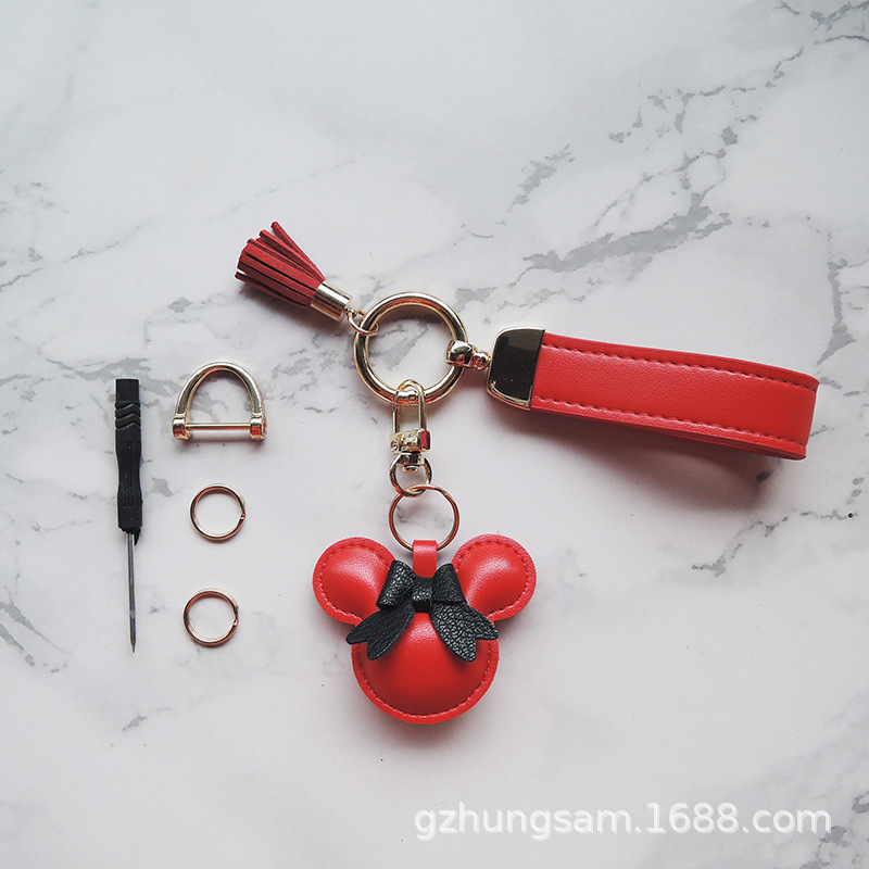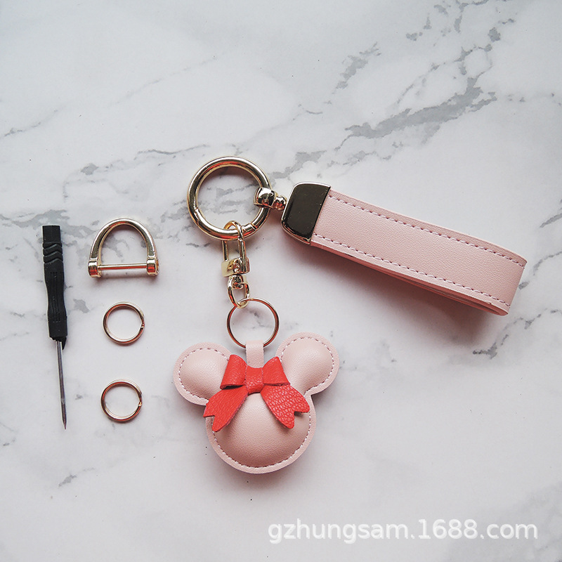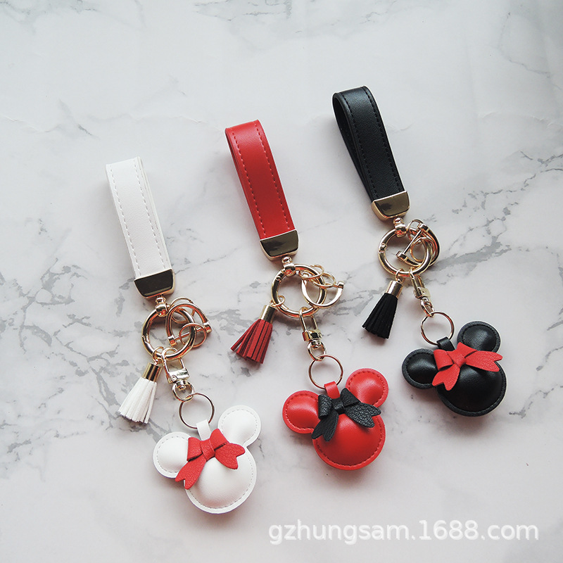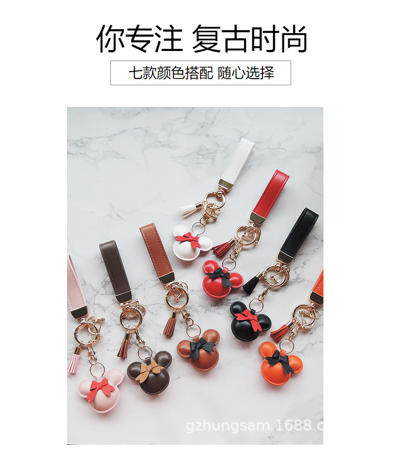 跨境爆款多色环保皮革米奇米妮汽车钥匙扣配天然獭兔毛球手绳挂饰