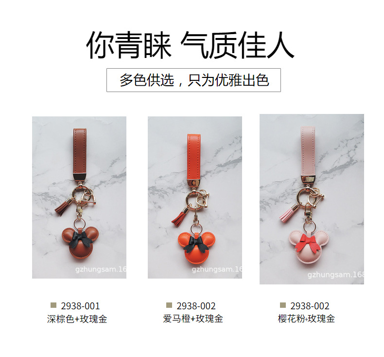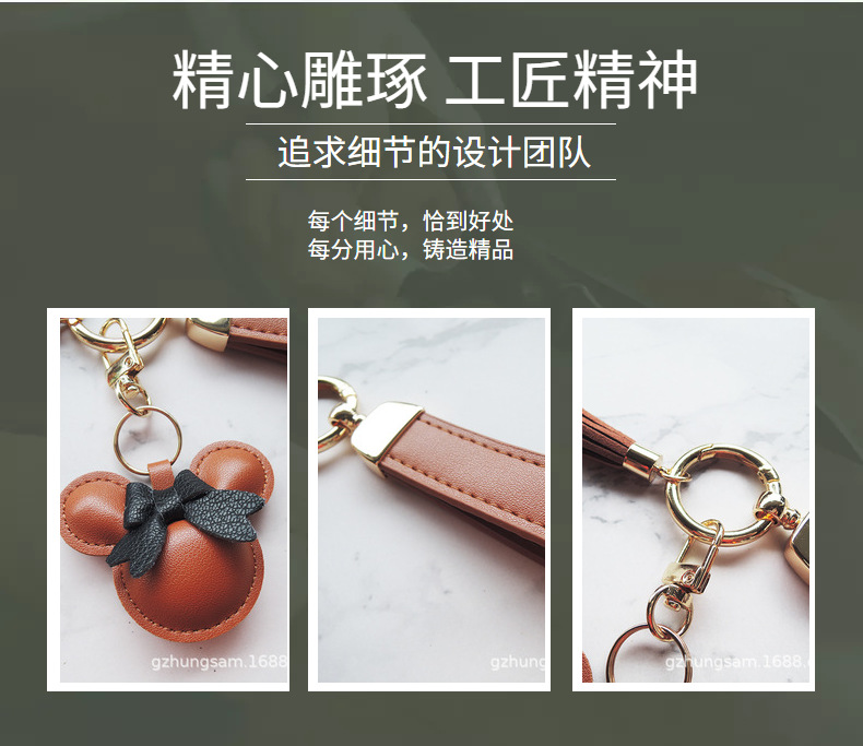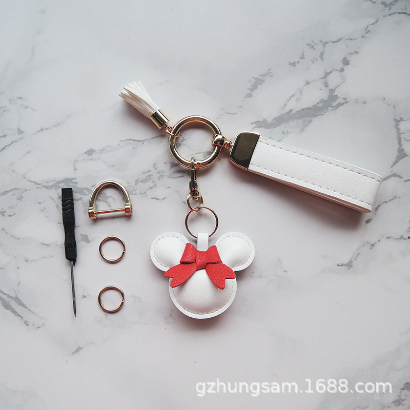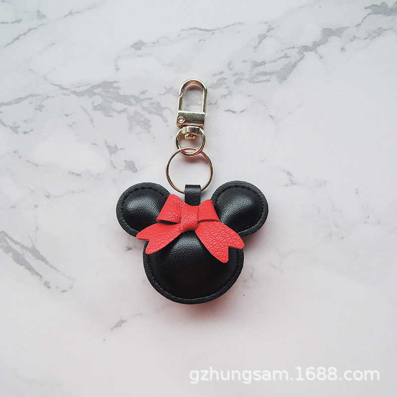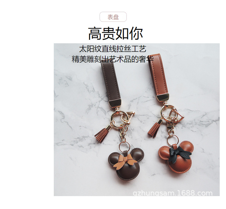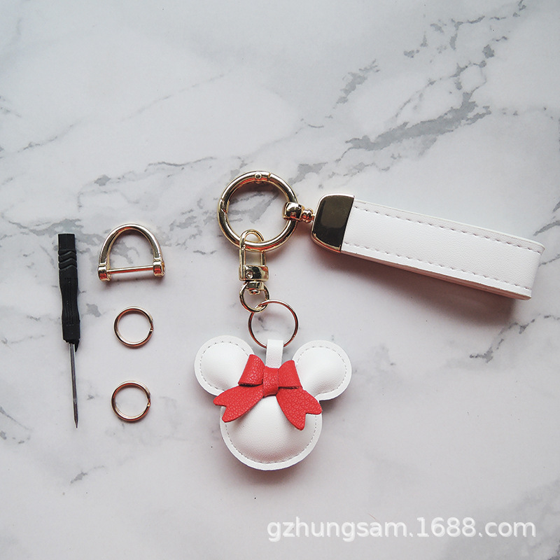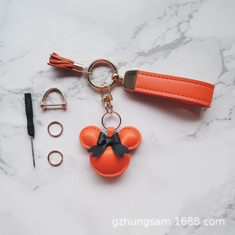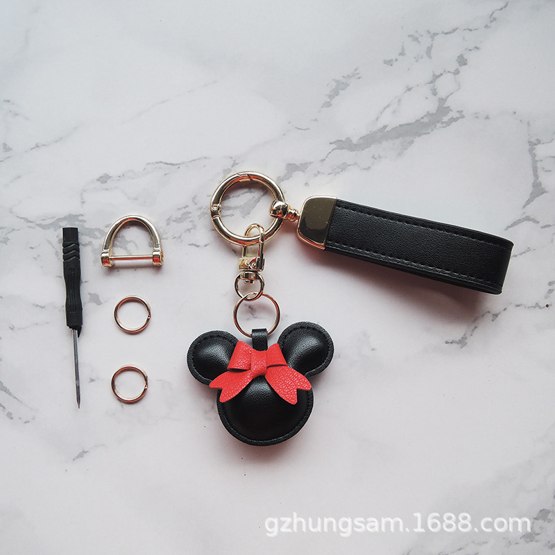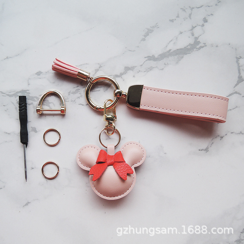 跨境爆款多色环保皮革米奇米妮汽车钥匙扣配天然獭兔毛球手绳挂饰