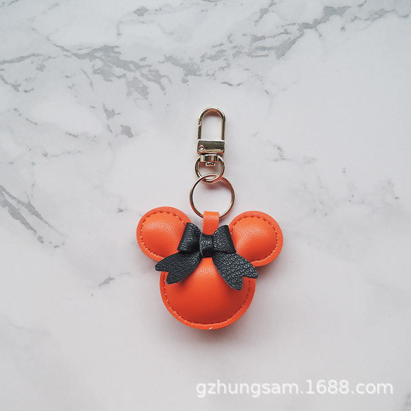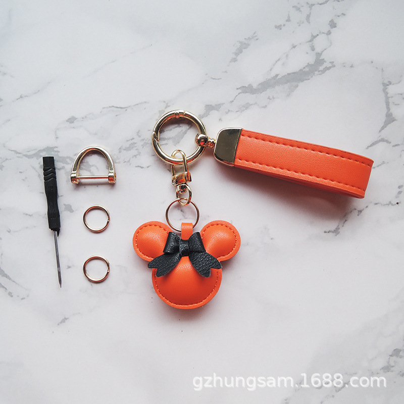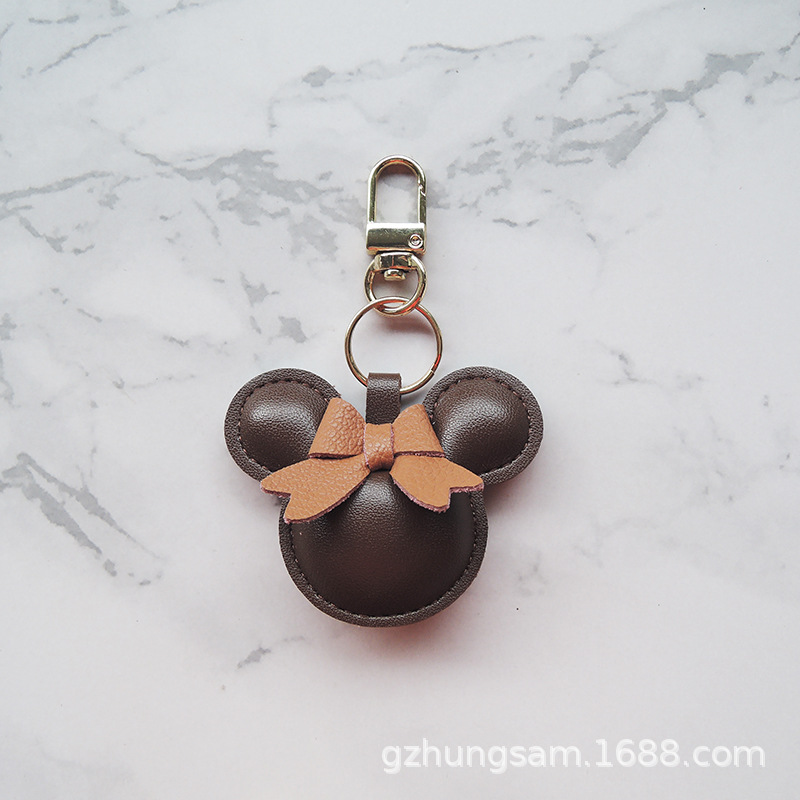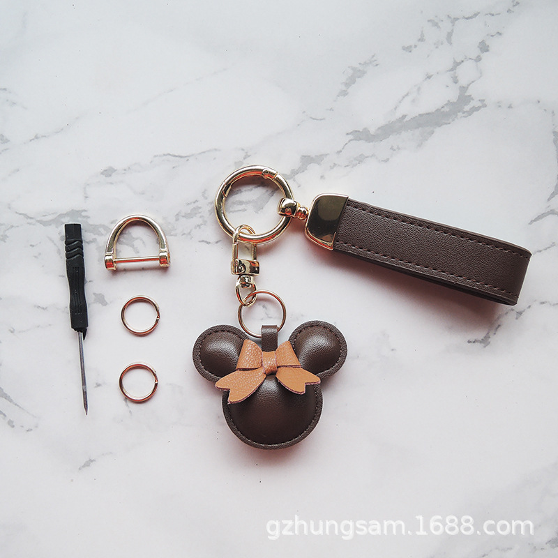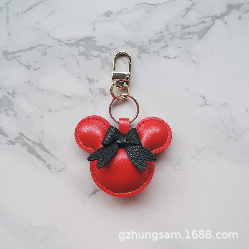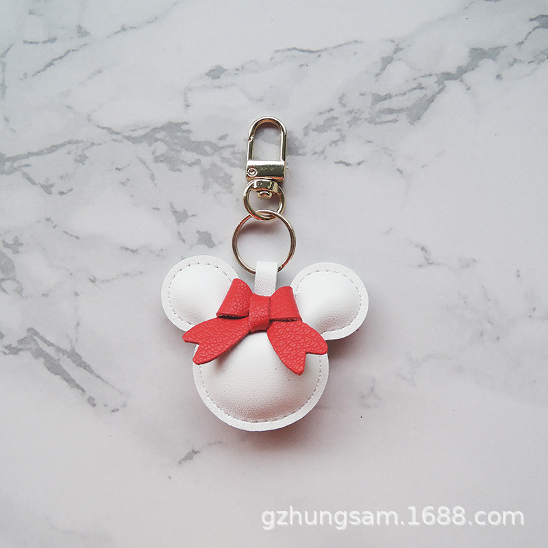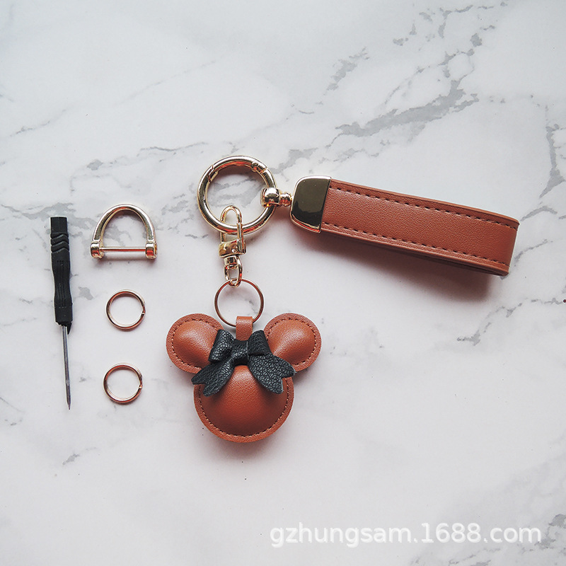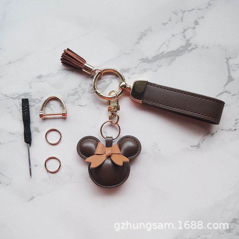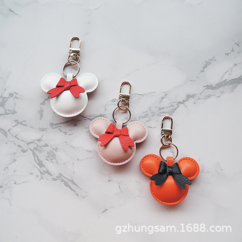 跨境爆款多色环保皮革米奇米妮汽车钥匙扣配天然獭兔毛球手绳挂饰