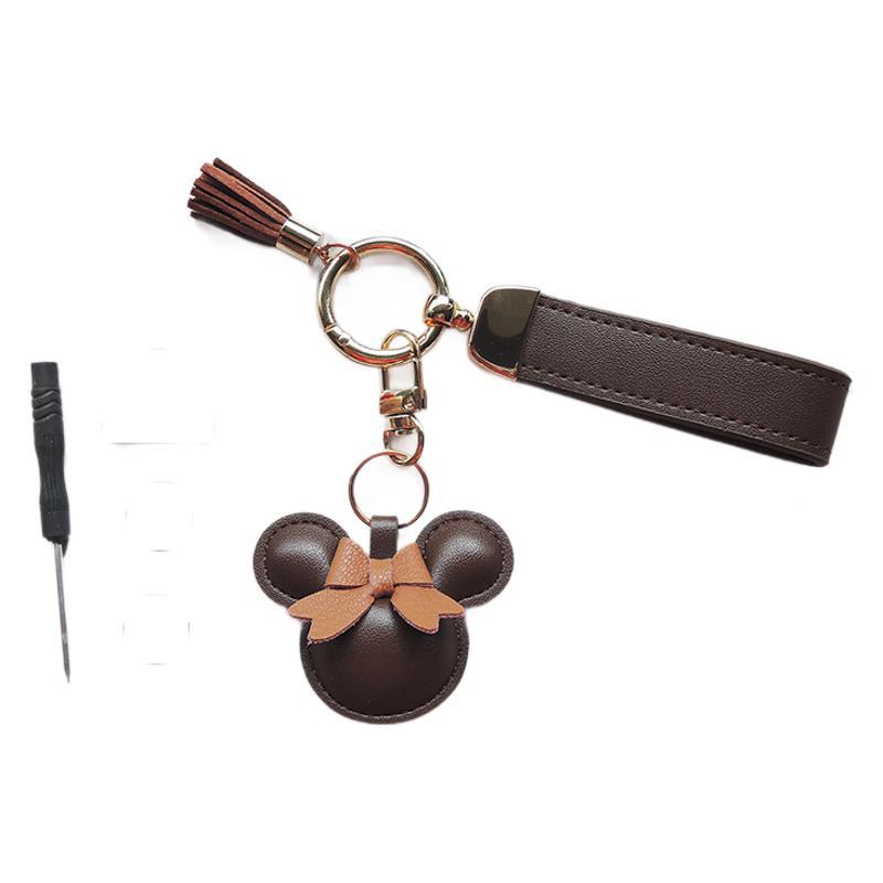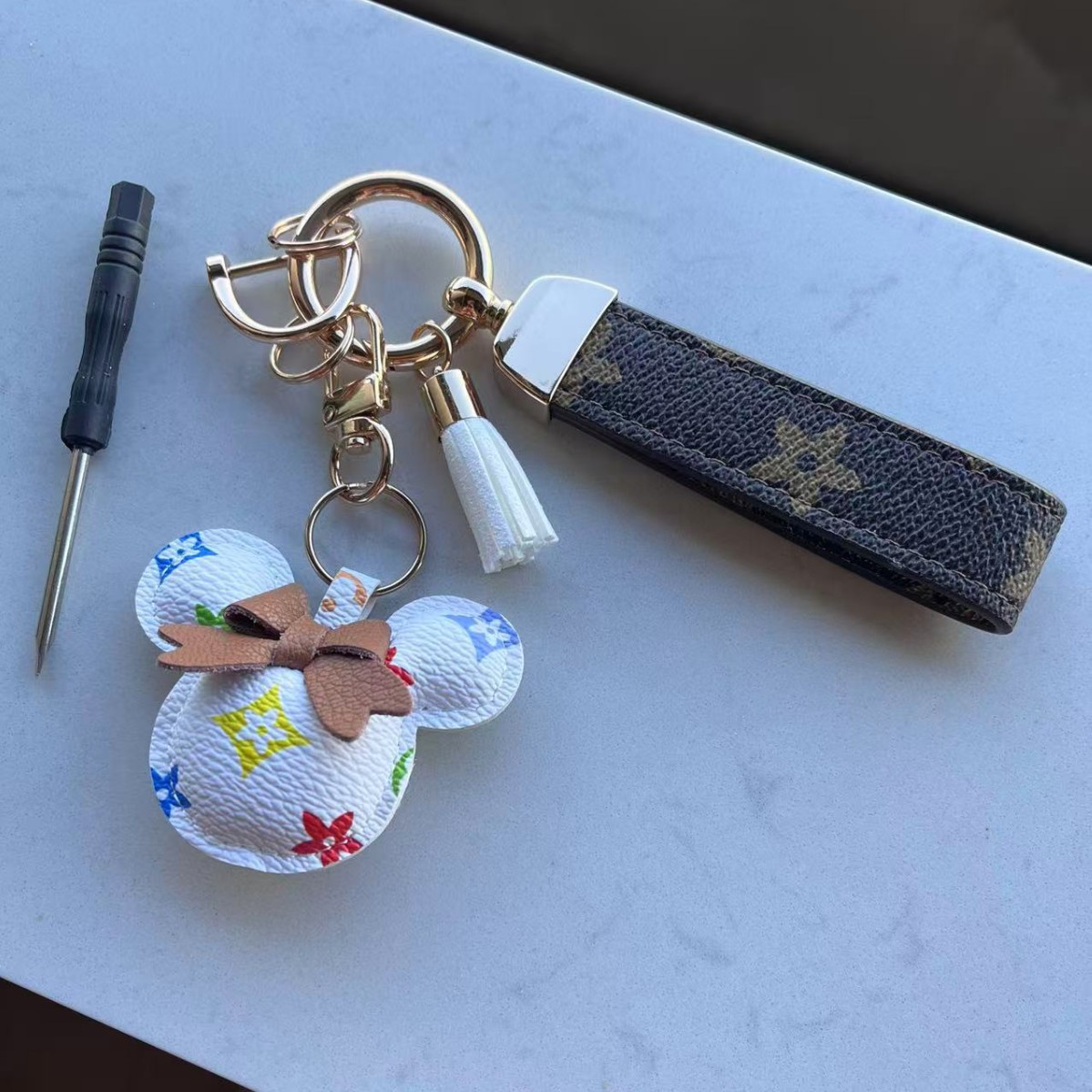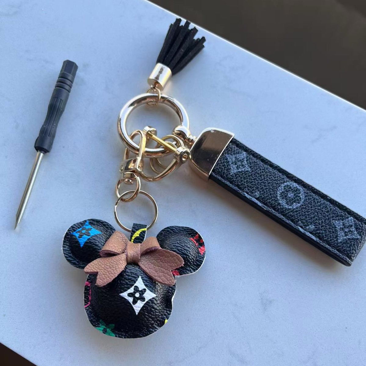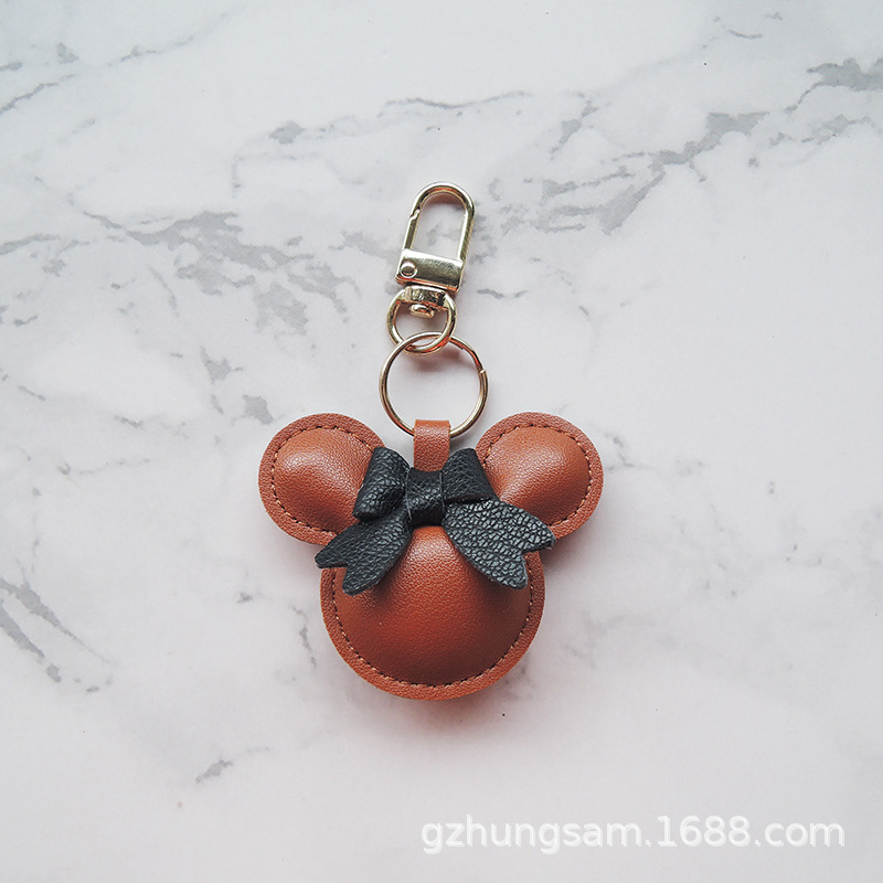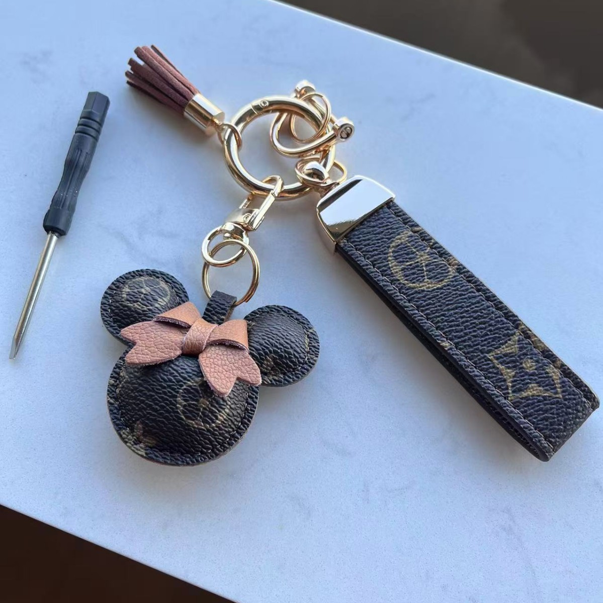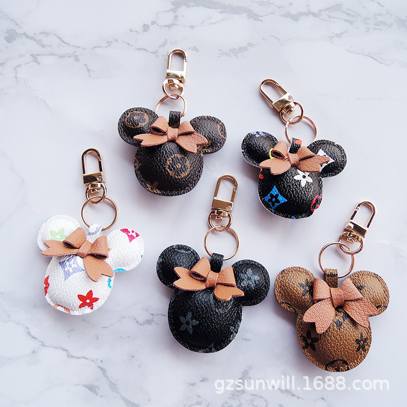 跨境爆款多色环保皮革米奇米妮汽车钥匙扣配天然獭兔毛球手绳挂饰