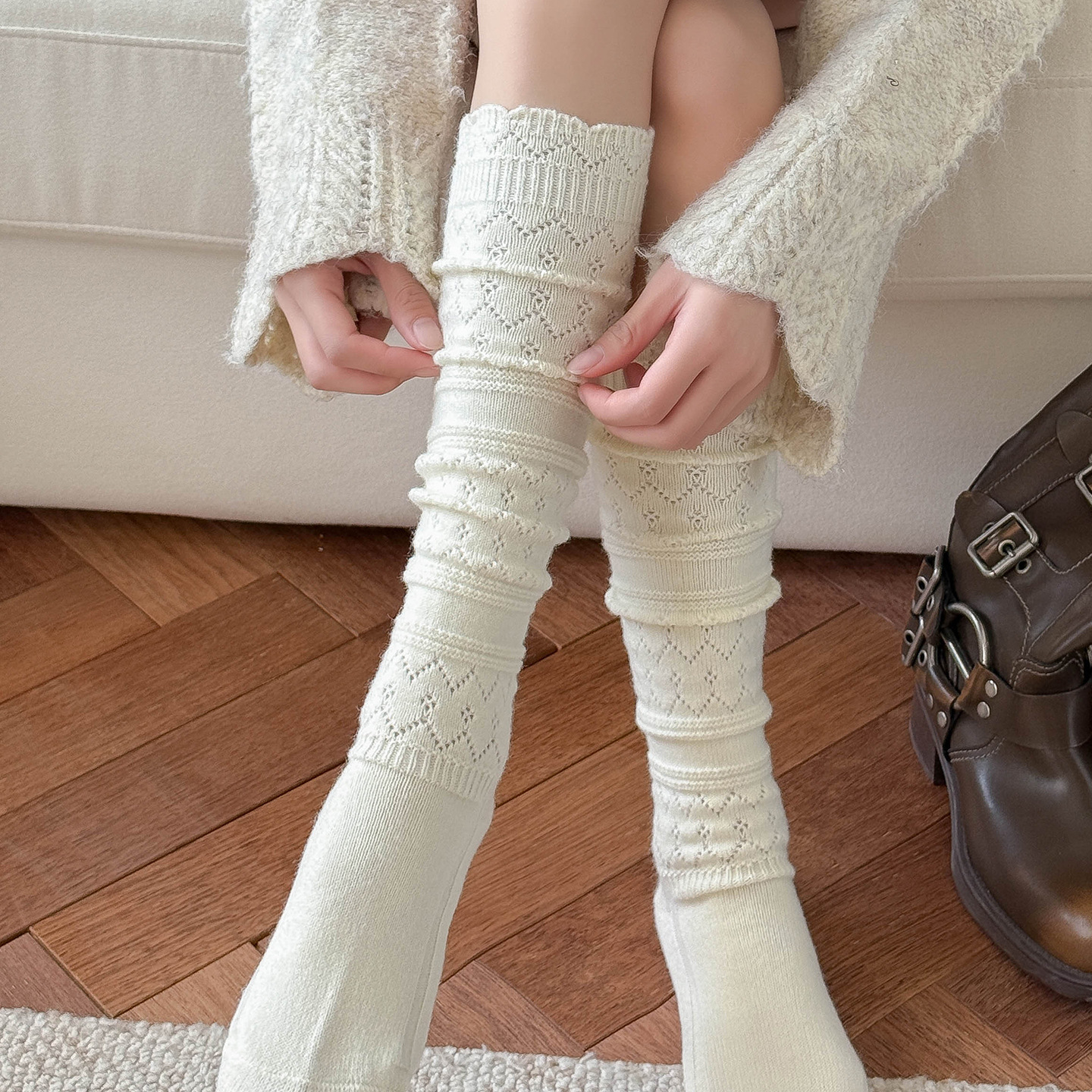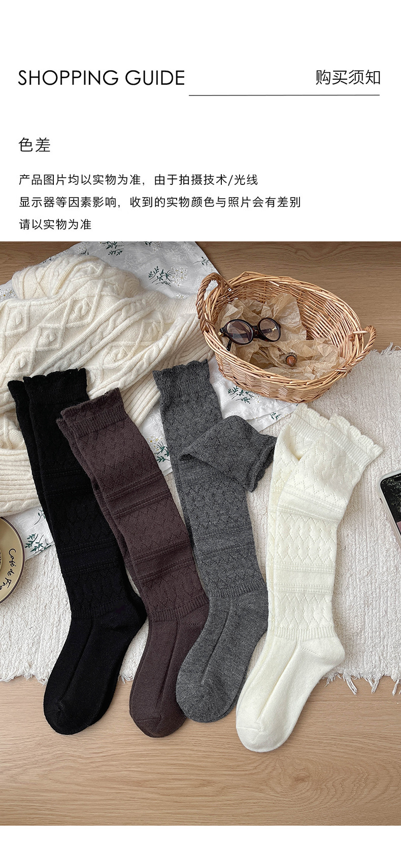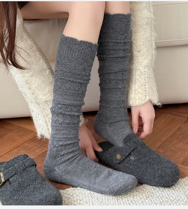 日系复古镂空羊毛小腿袜子女中筒堆堆袜秋冬保暖配靴子长筒袜靴袜