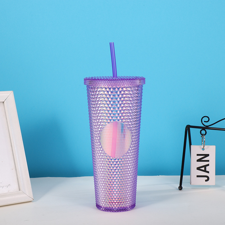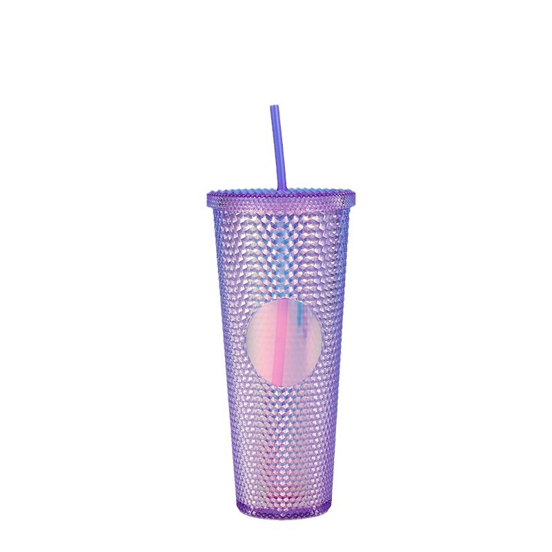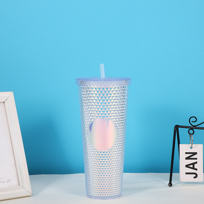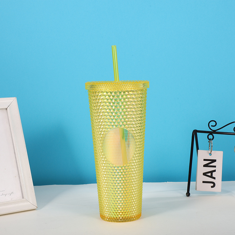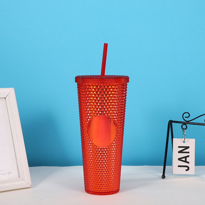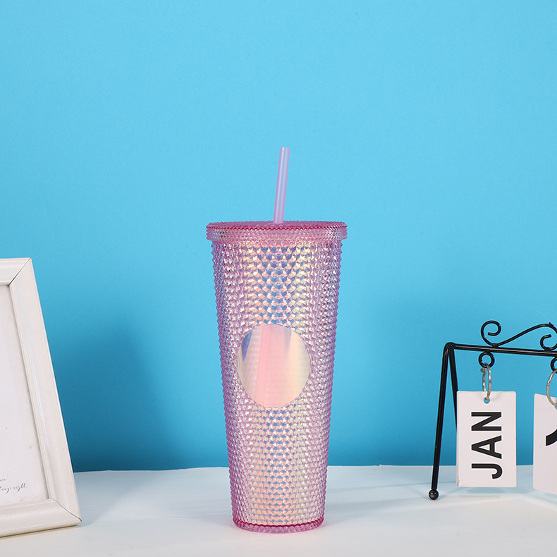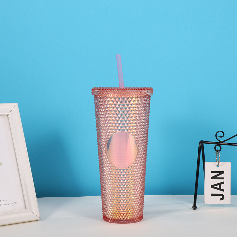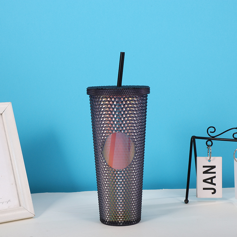 跨境高颜值塑料杯大容量钻石双层简约创意吸管杯便携扎手榴莲杯