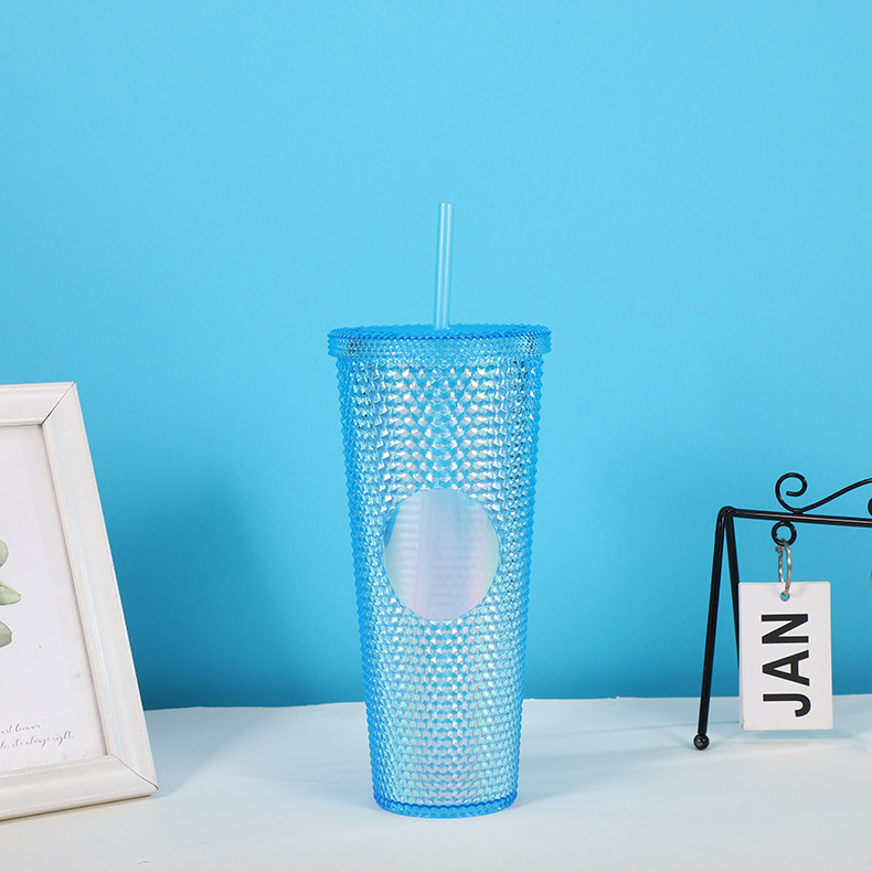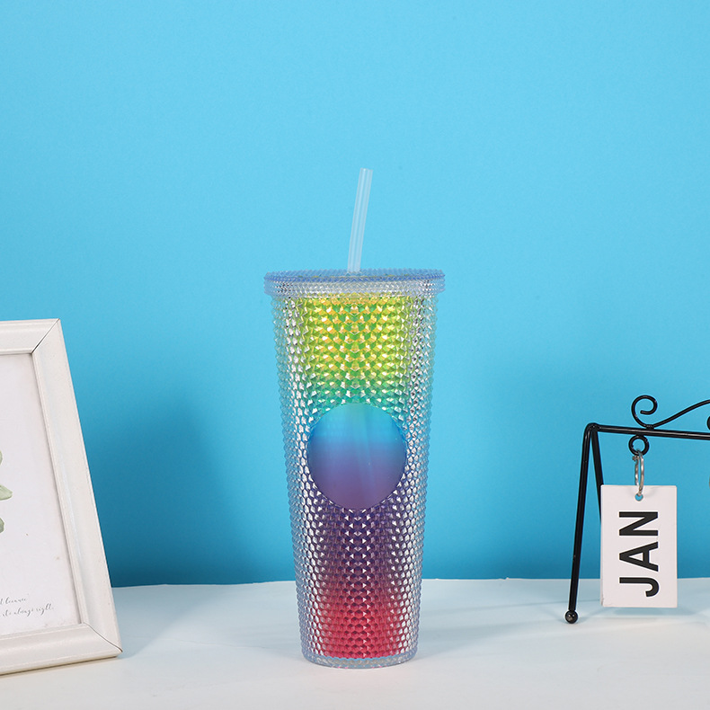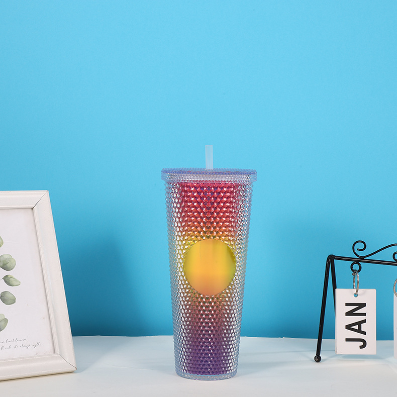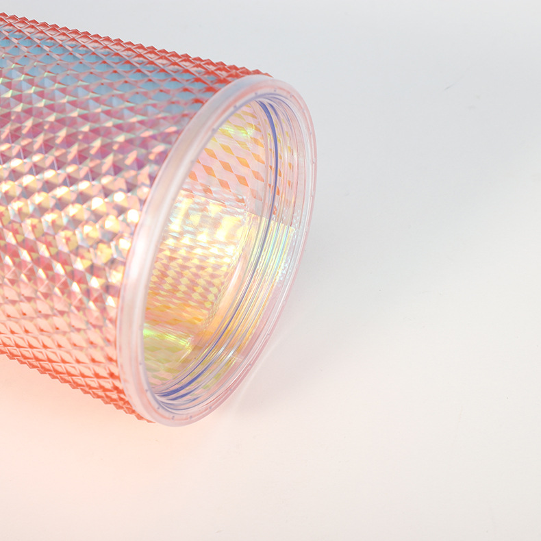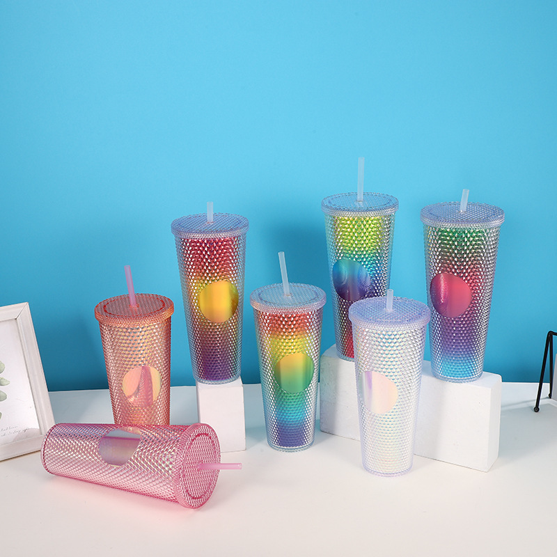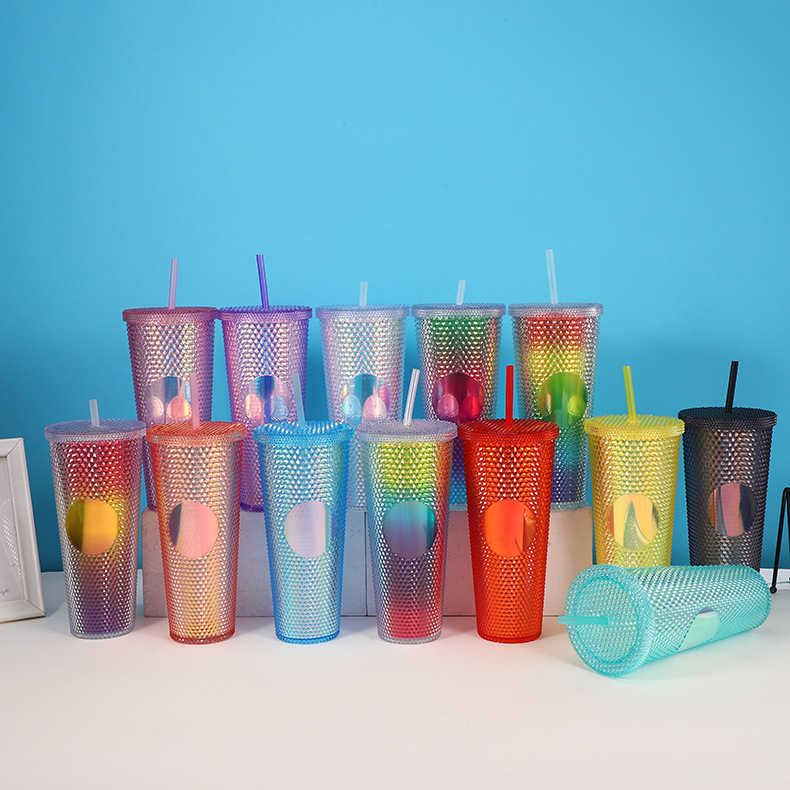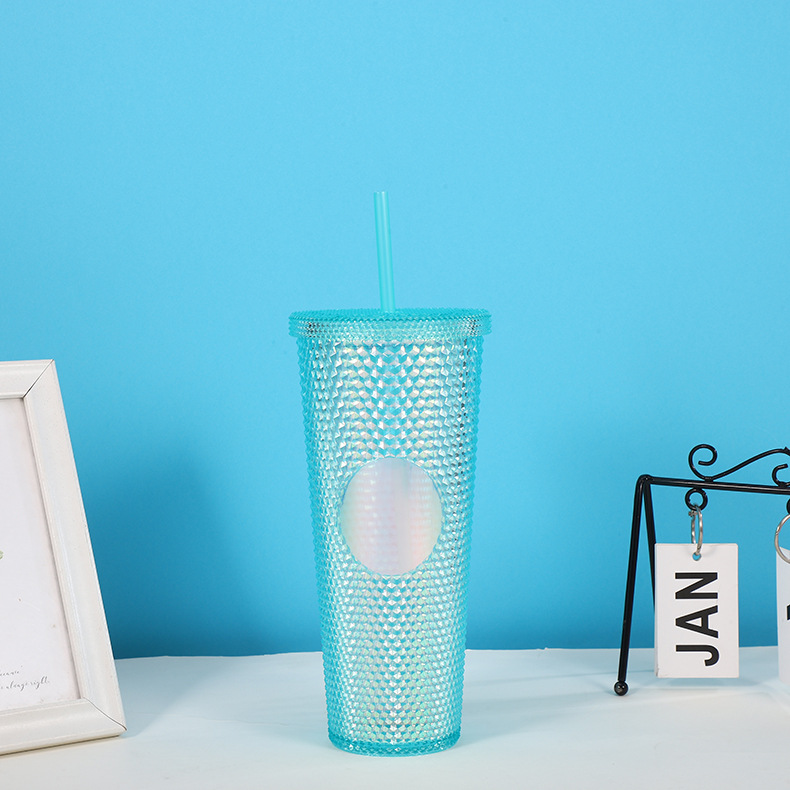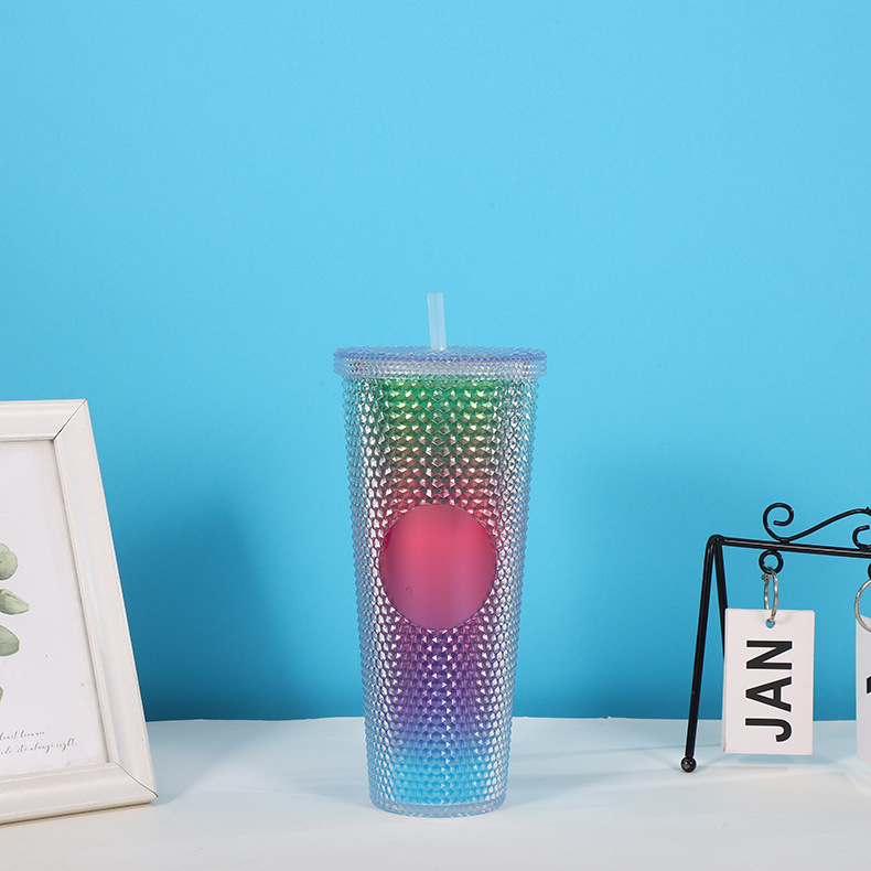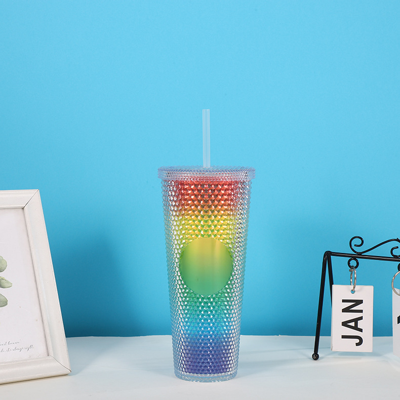 跨境高颜值塑料杯大容量钻石双层简约创意吸管杯便携扎手榴莲杯
