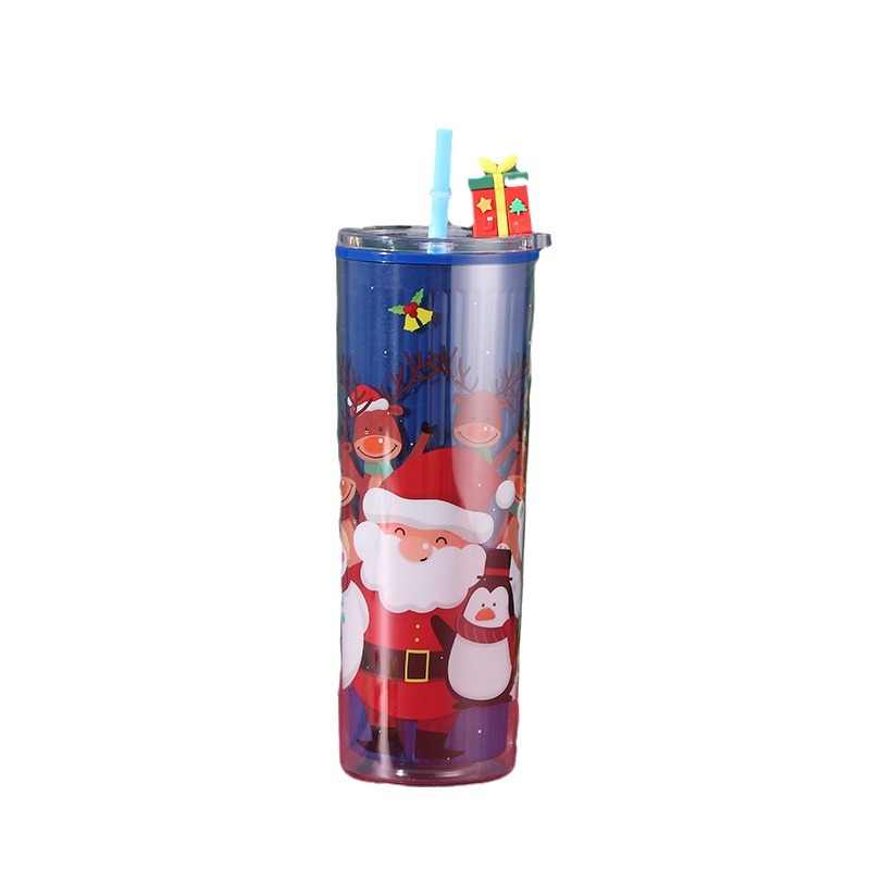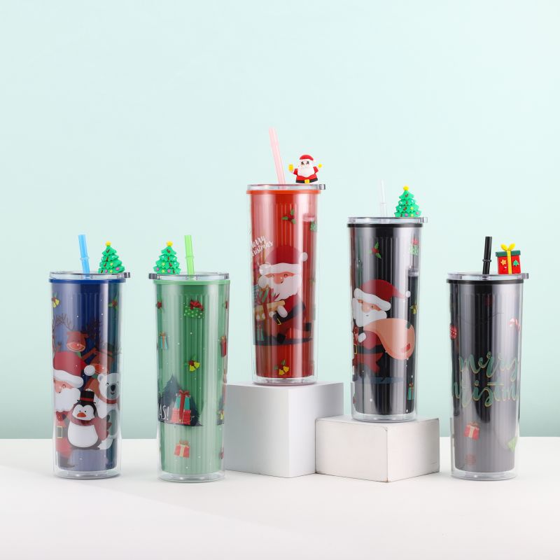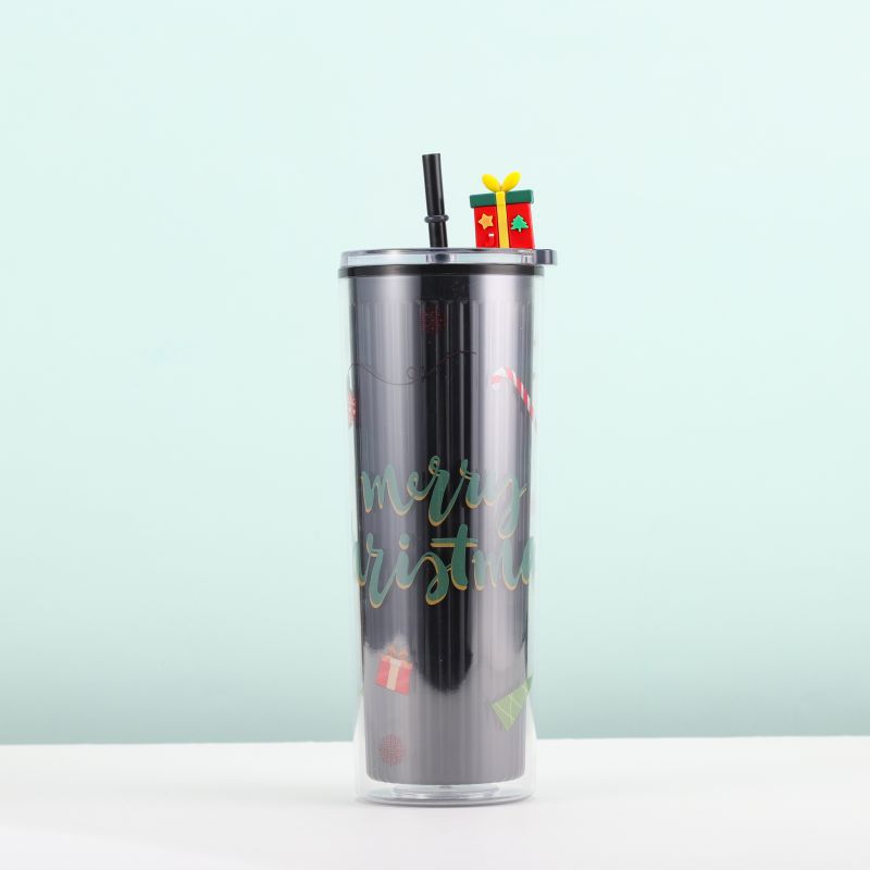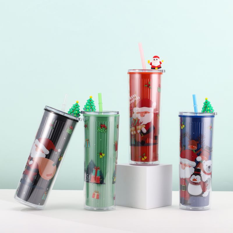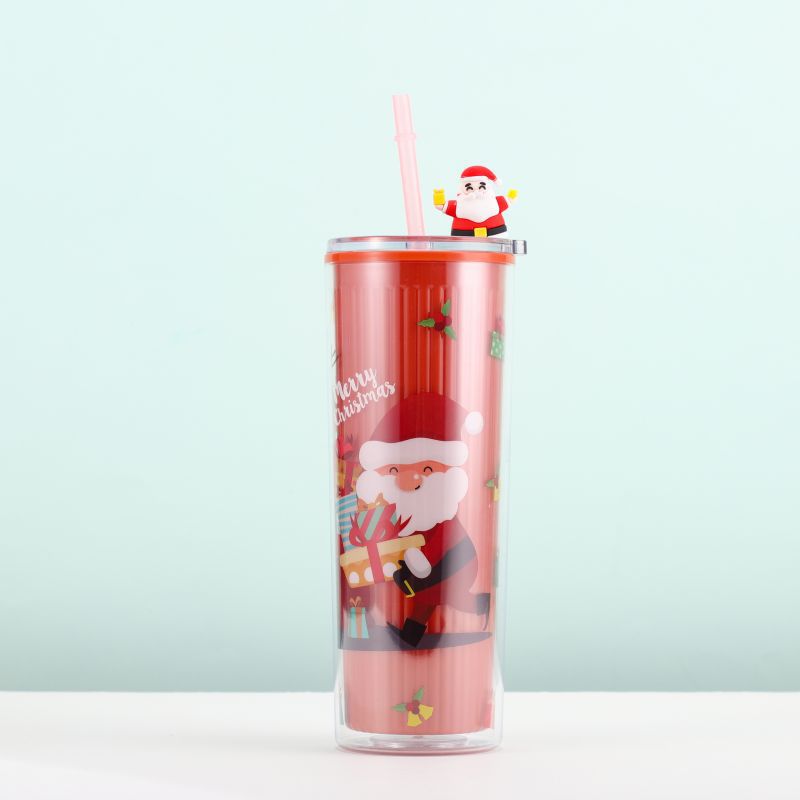跨境爆款双层塑料吸管杯创意圣诞夏日冰杯学生便携情侣圣诞礼品杯
