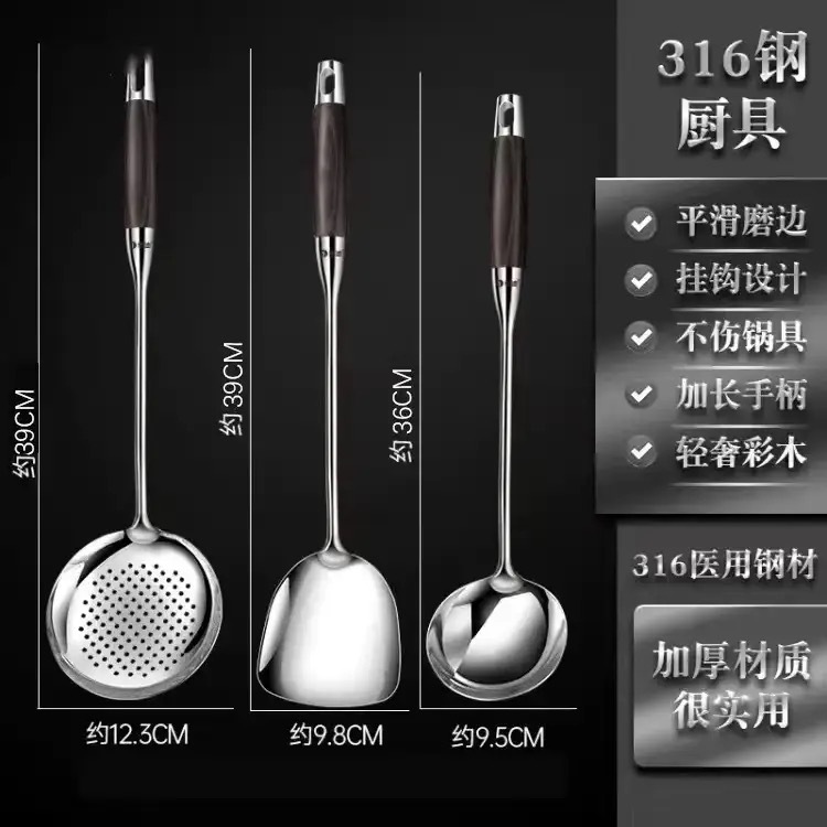 316不锈钢锅铲套装炒菜铲子厨具家用炒菜勺木柄汤勺漏勺加厚煎铲