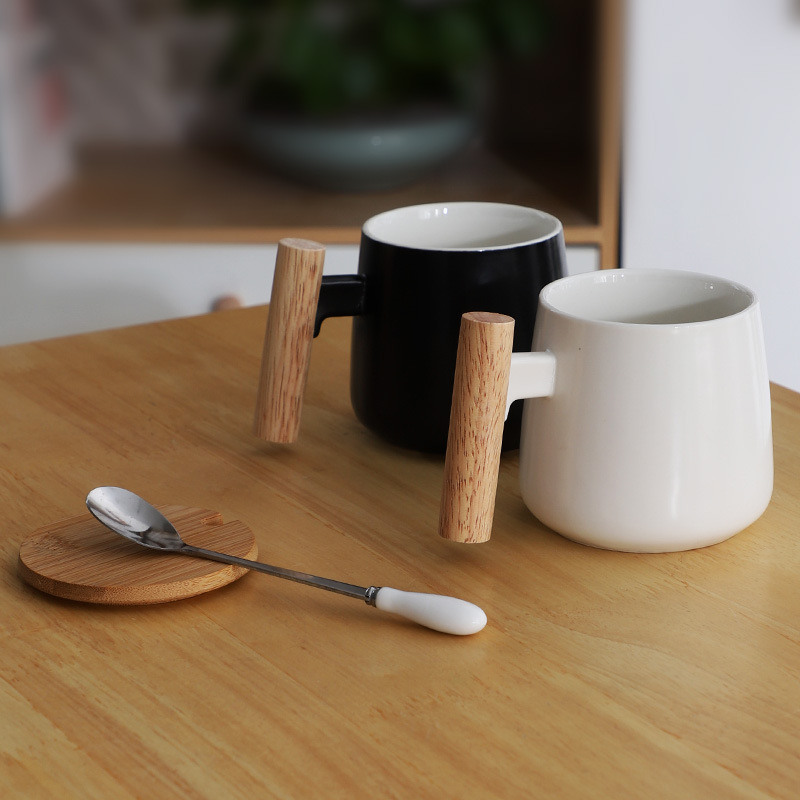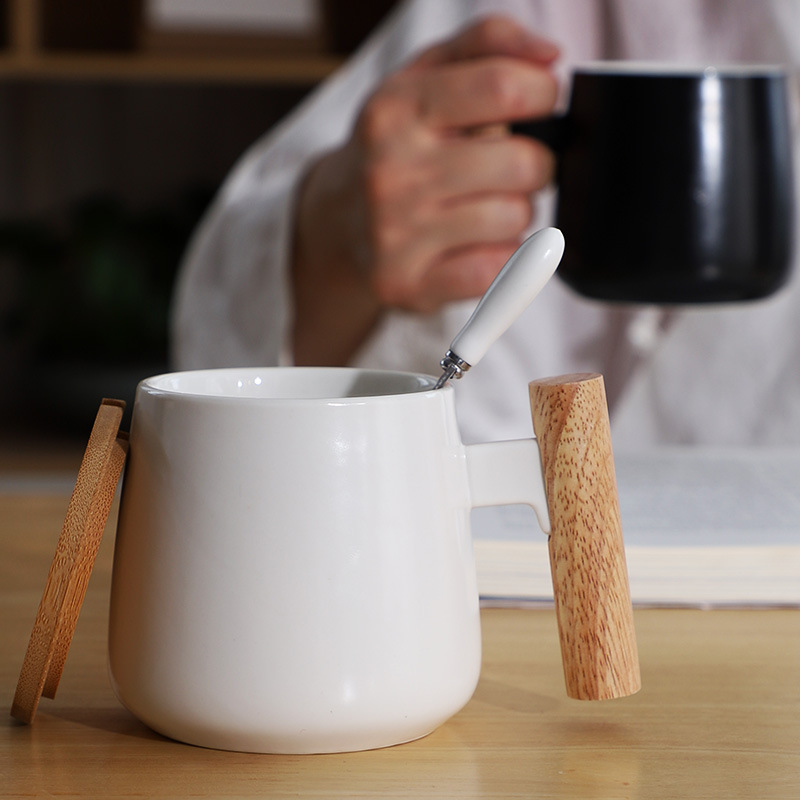 陶瓷咖啡马克杯带盖勺简约北欧木柄办公室情侣水杯雕刻logo定 制
