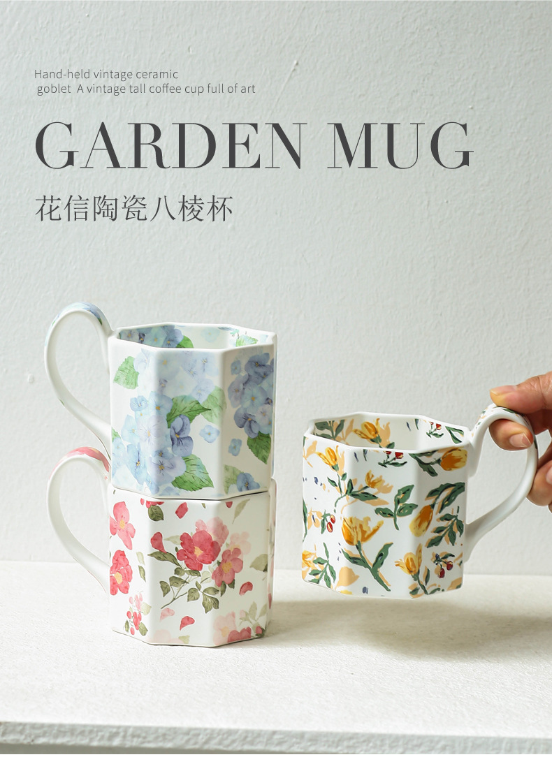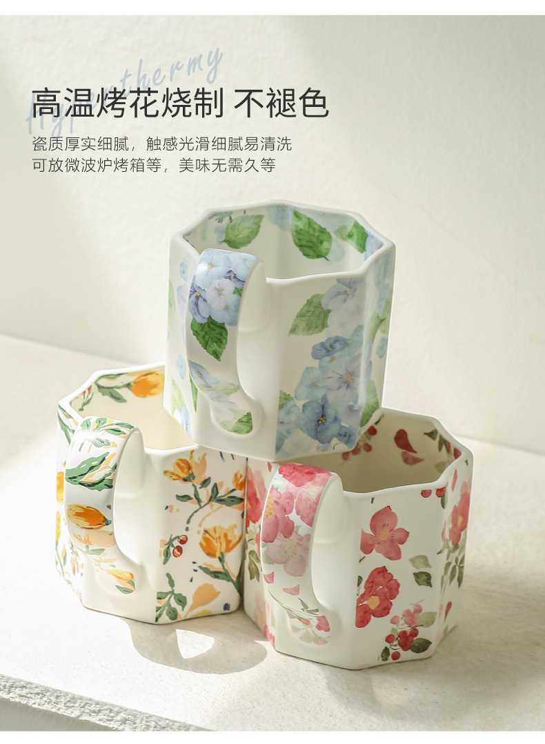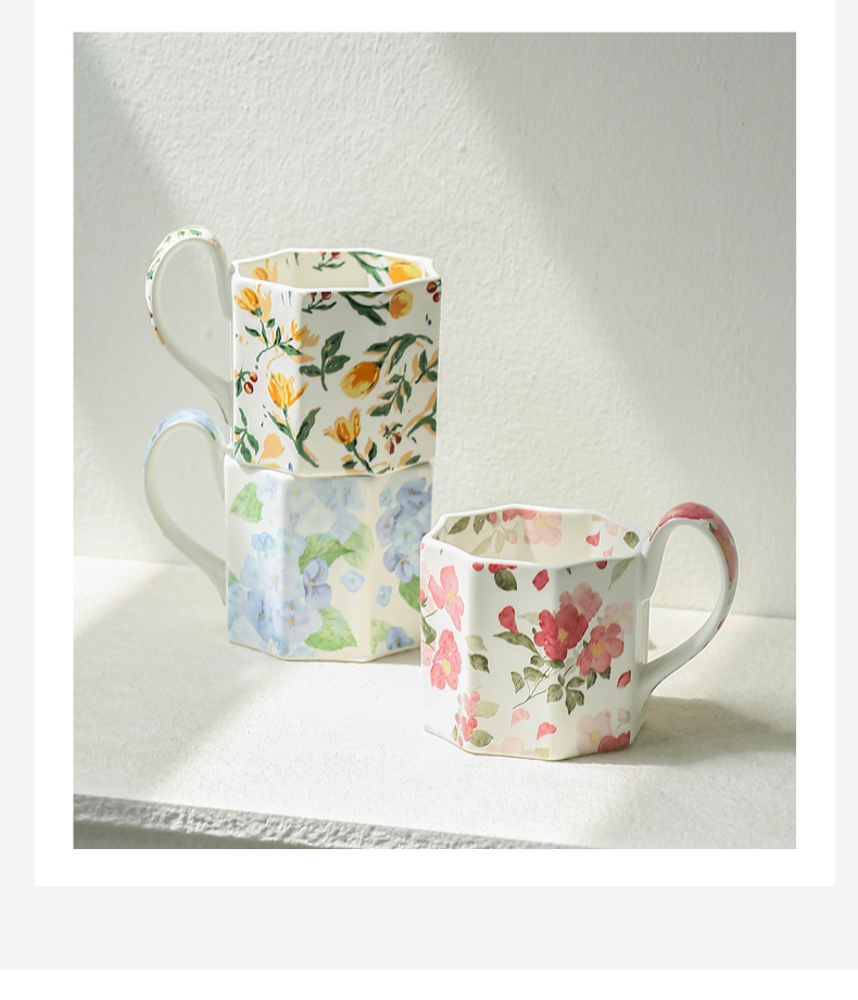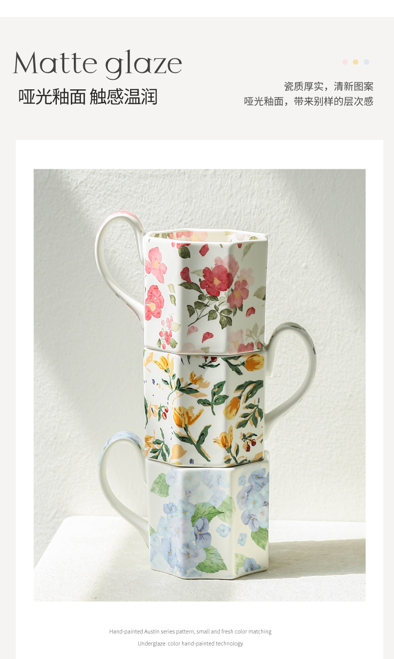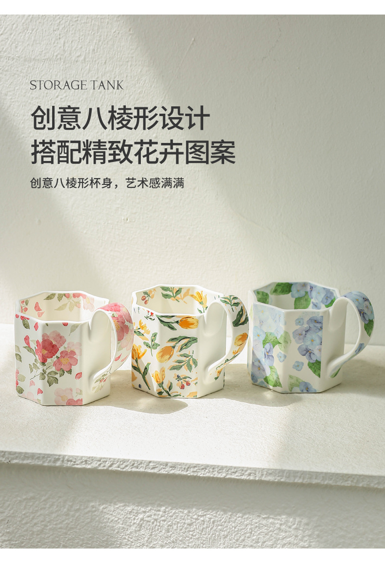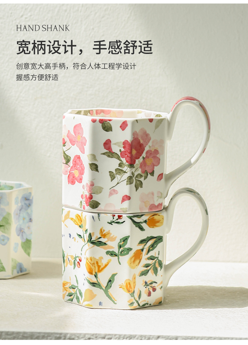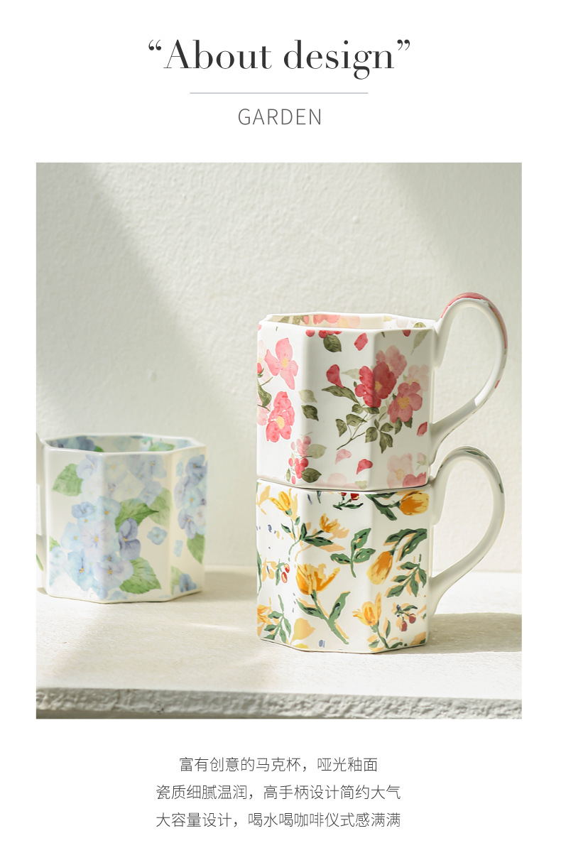 花信八棱杯 新款创意哑光大容量花卉陶瓷马克杯 办公室家居喝水杯