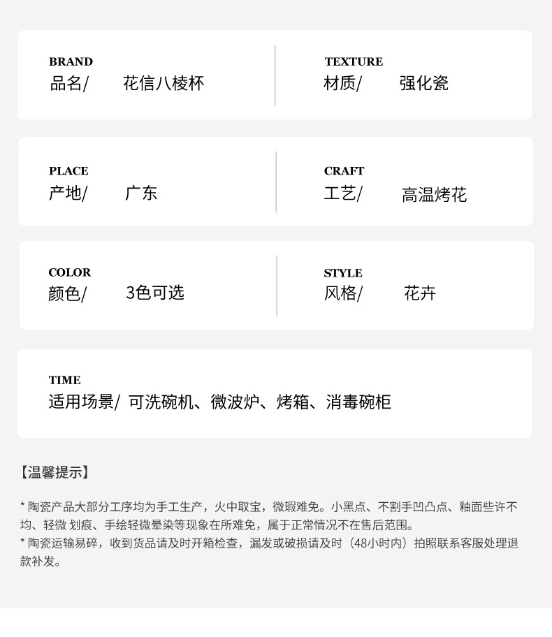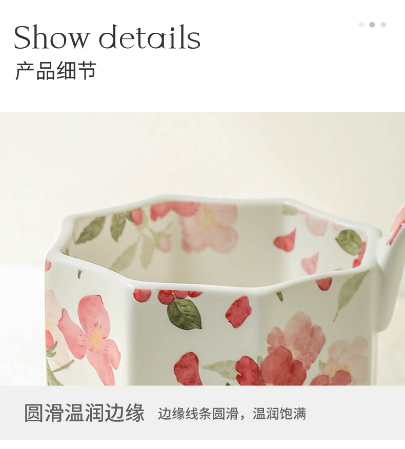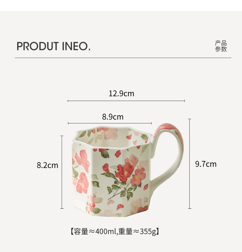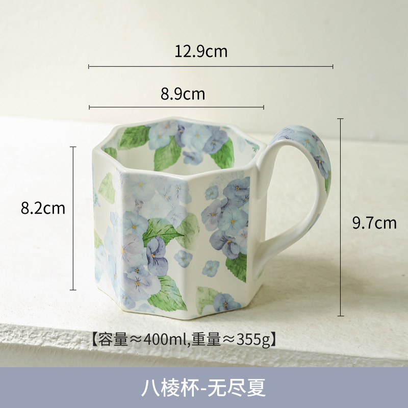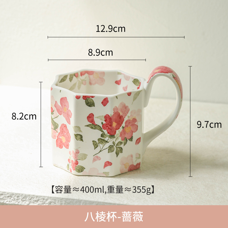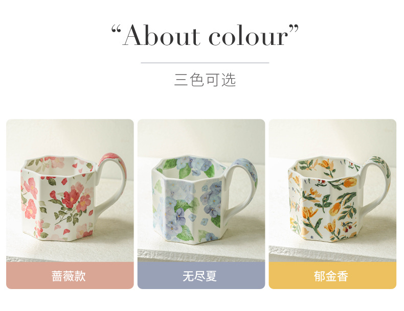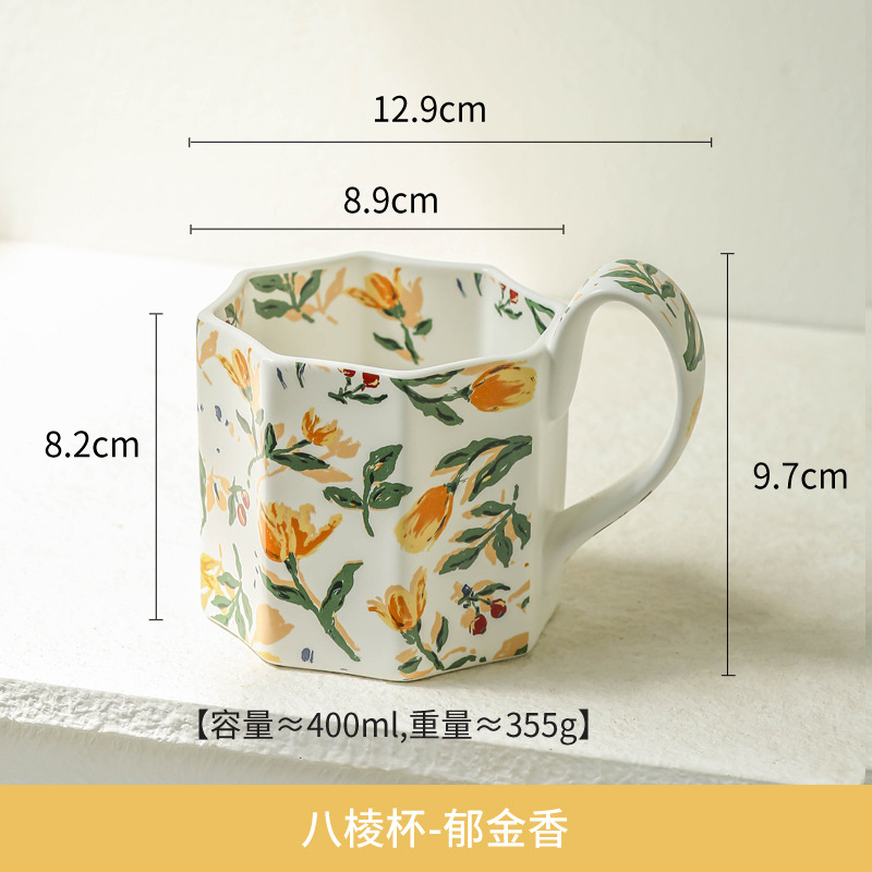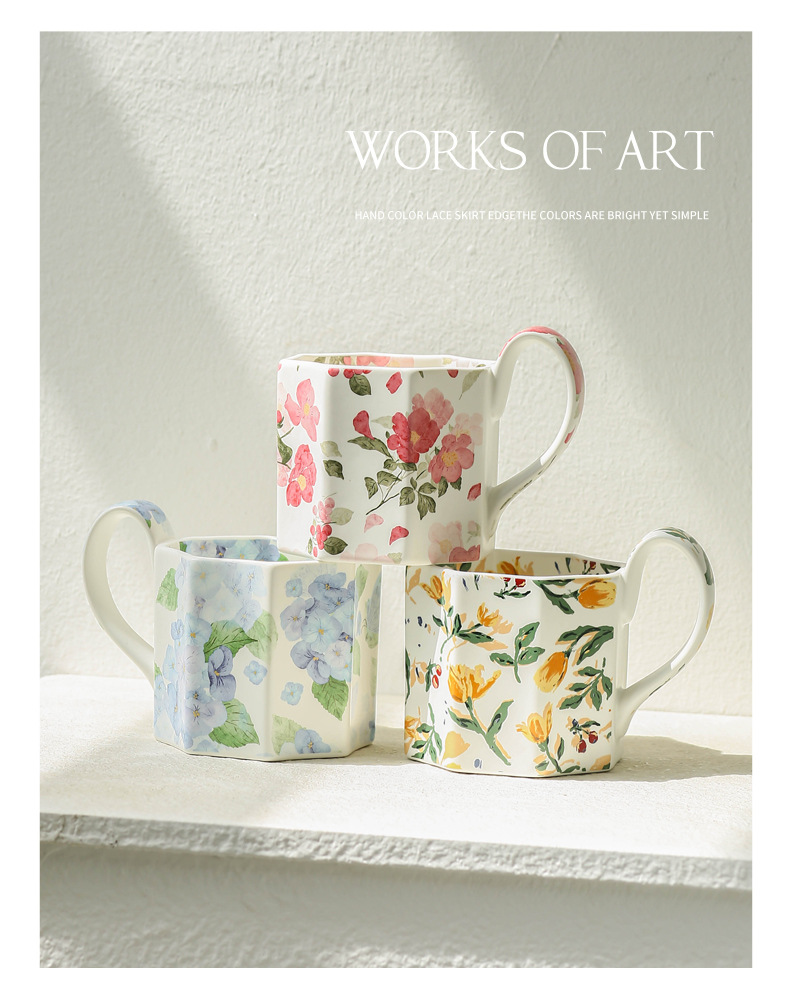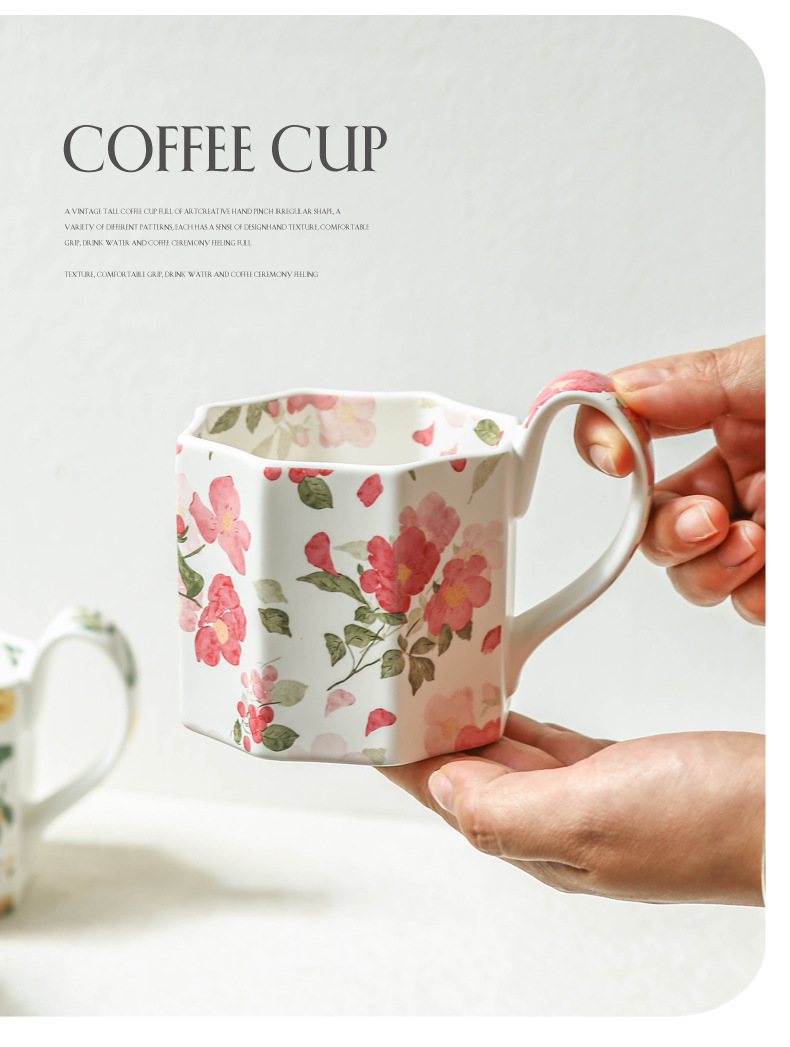花信八棱杯 新款创意哑光大容量花卉陶瓷马克杯 办公室家居喝水杯