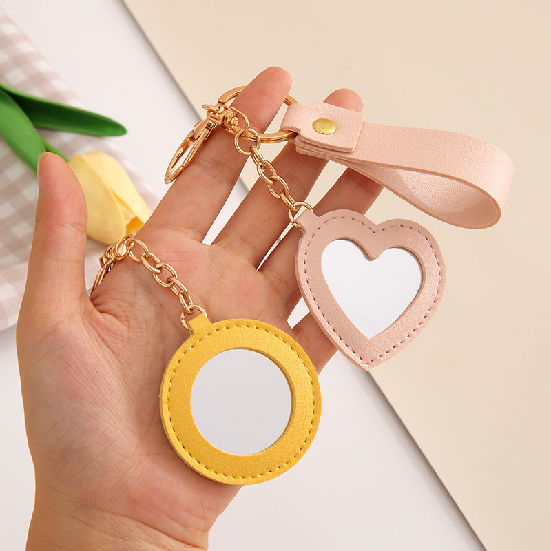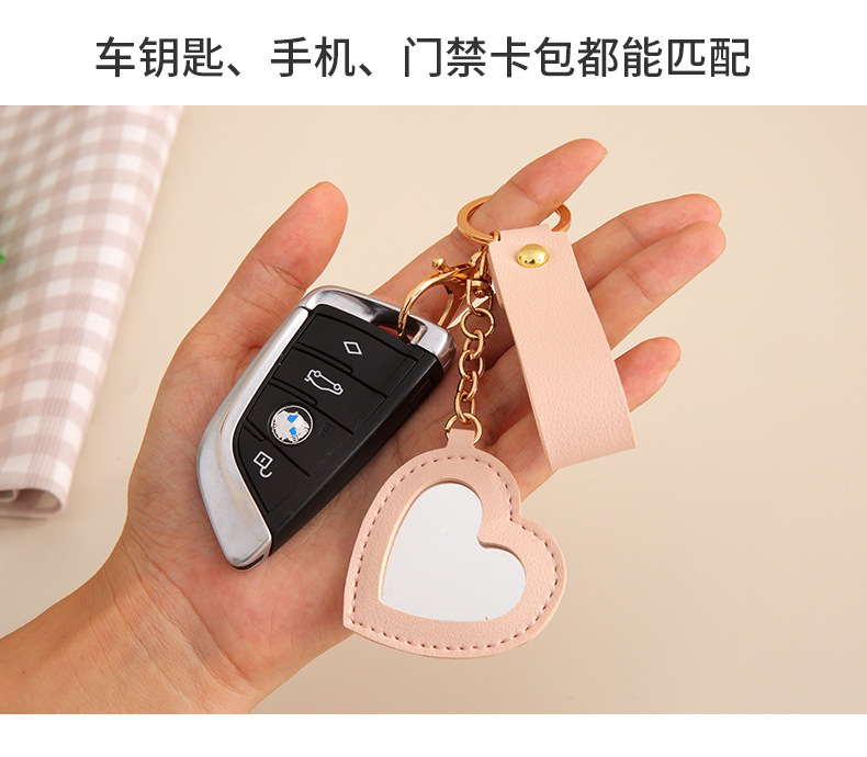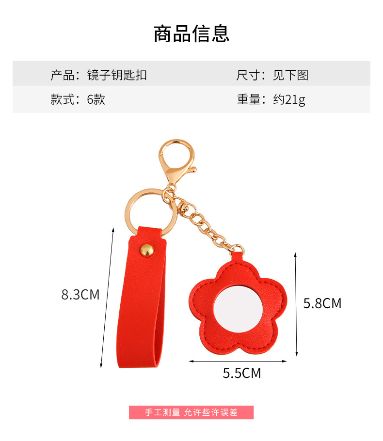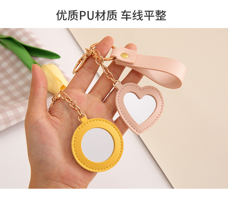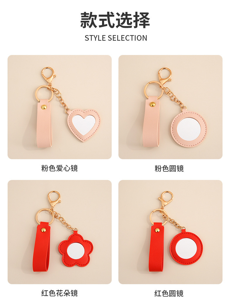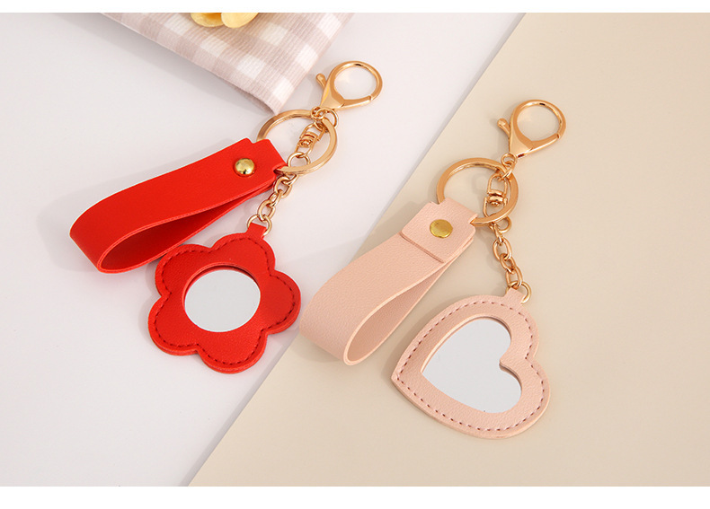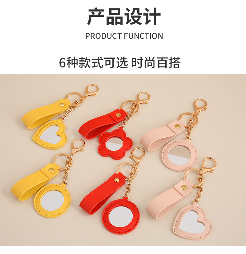 创意简约爱心镜子钥匙扣包包饰品钥匙绳PU皮质花朵圆镜防丢钥匙扣