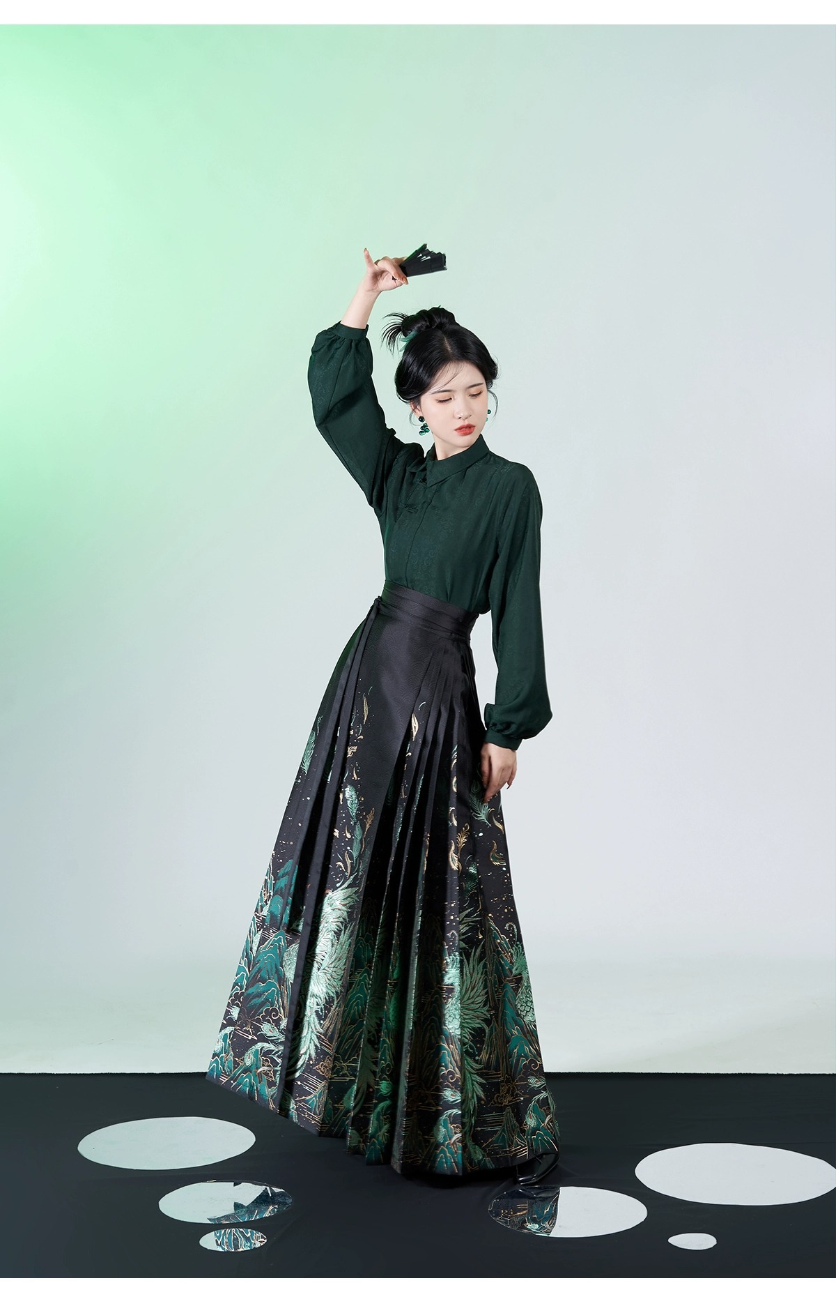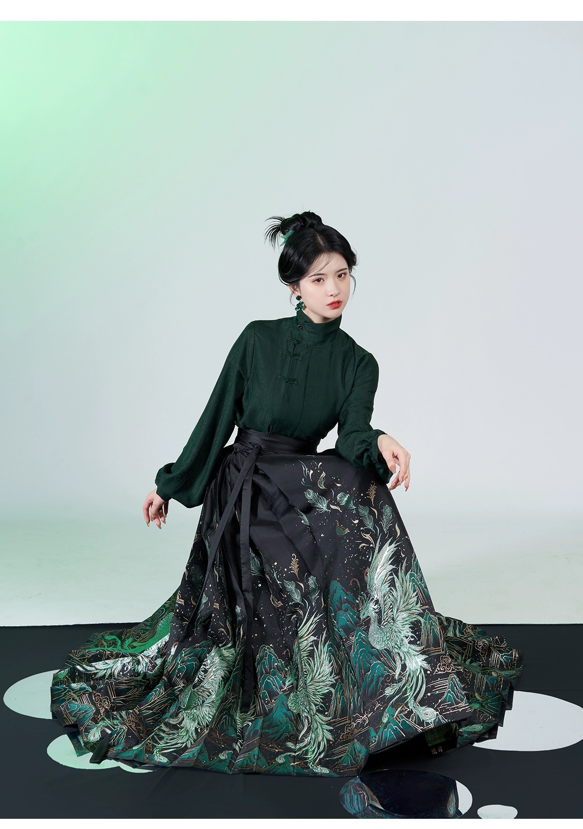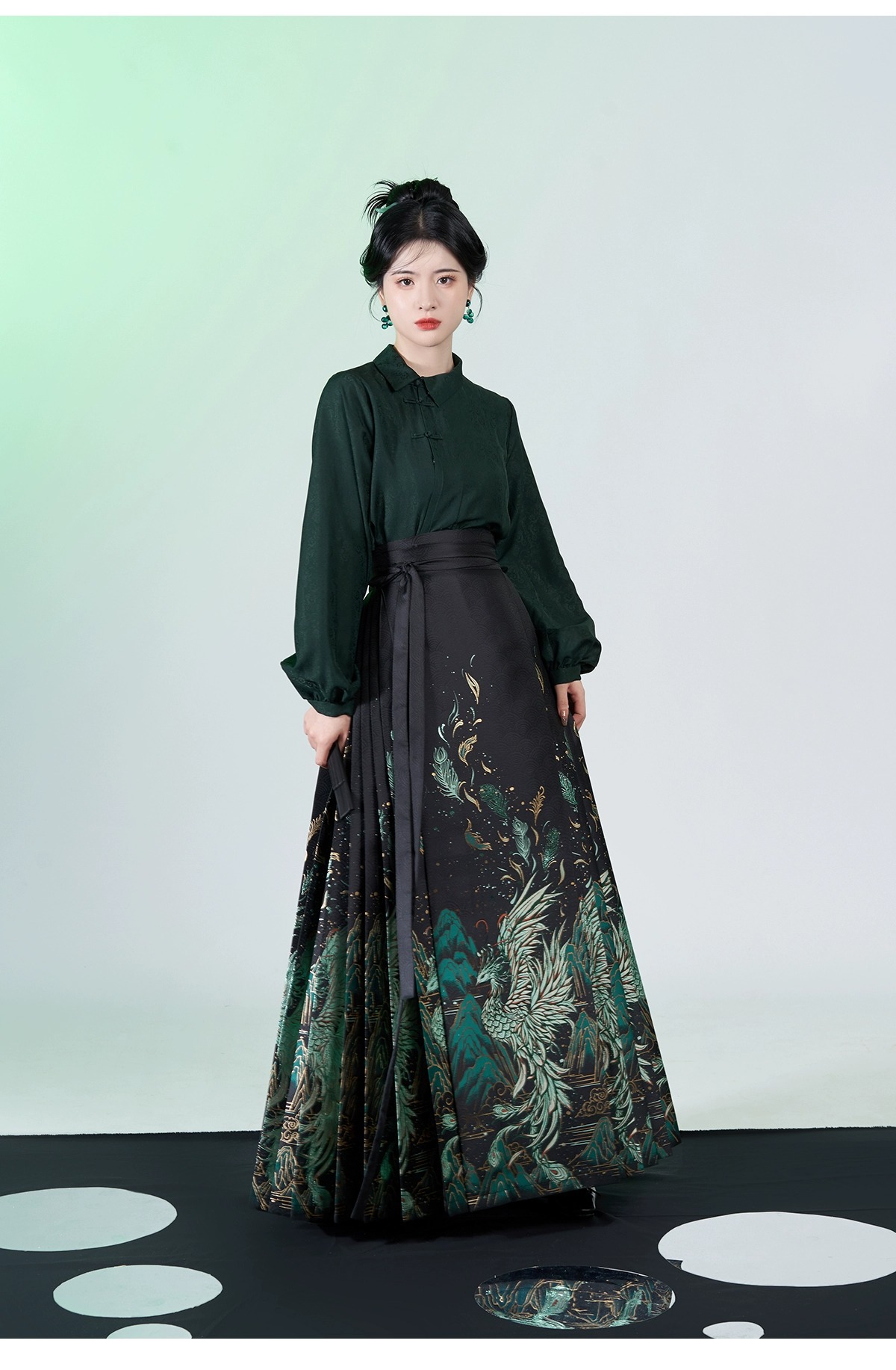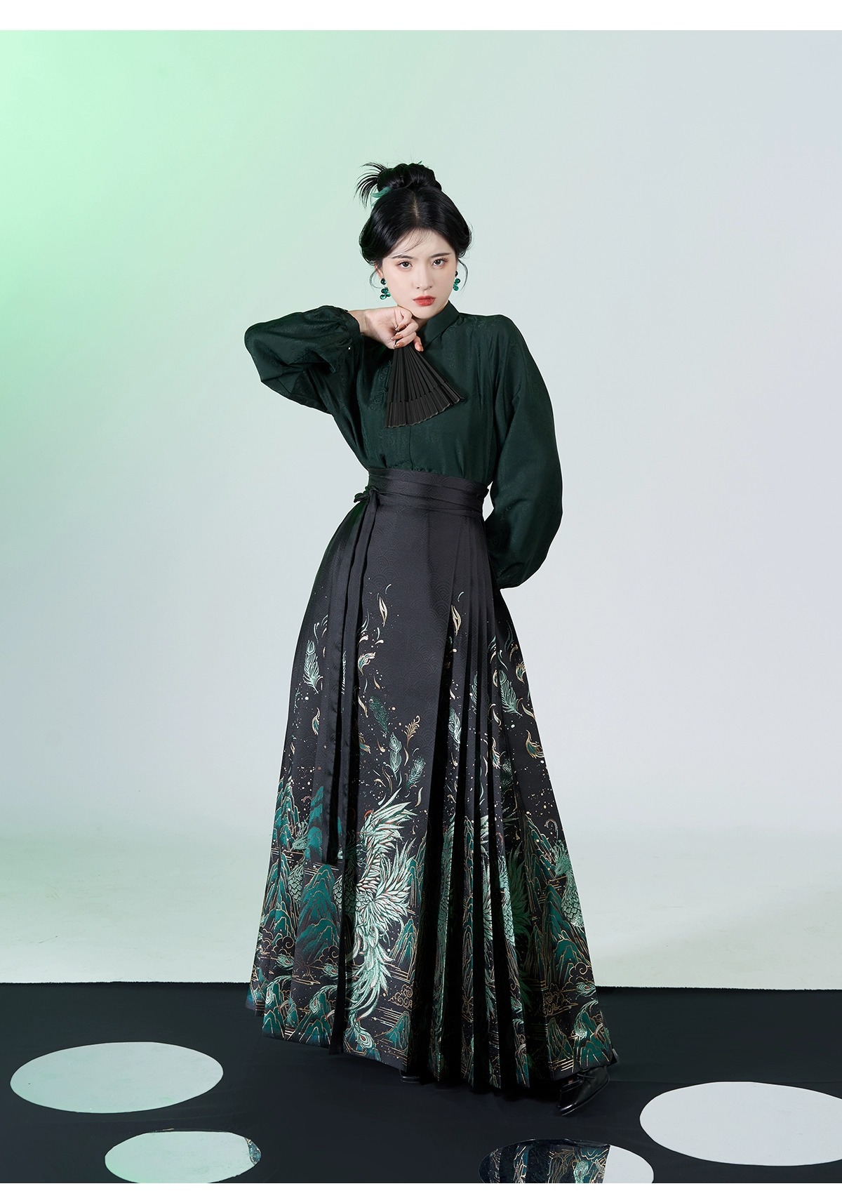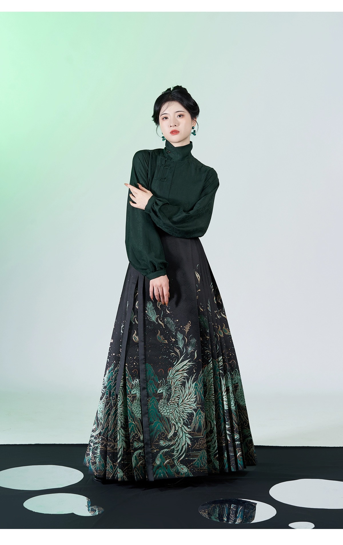 明制汉服半高领衬衫上衣仿妆花马面裙套装羽裳墨绿青羽马面裙