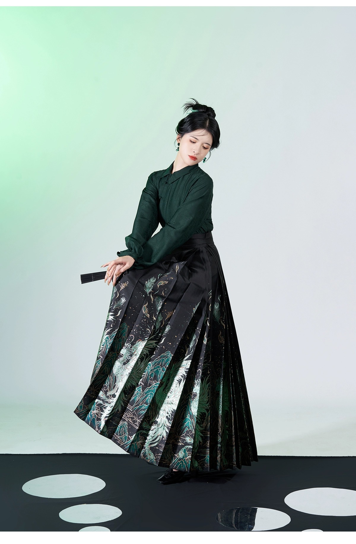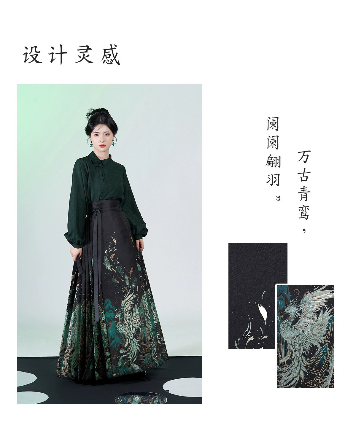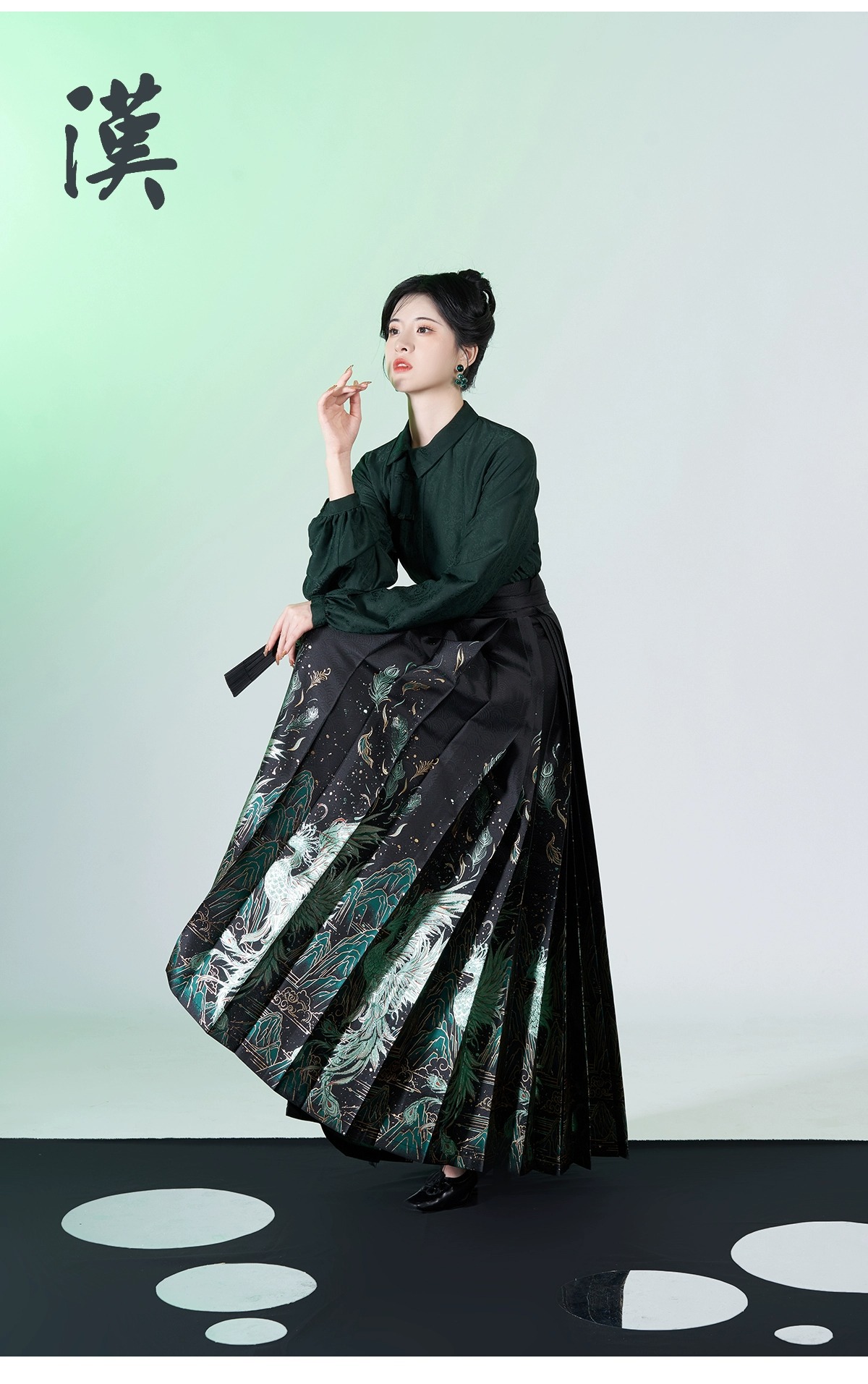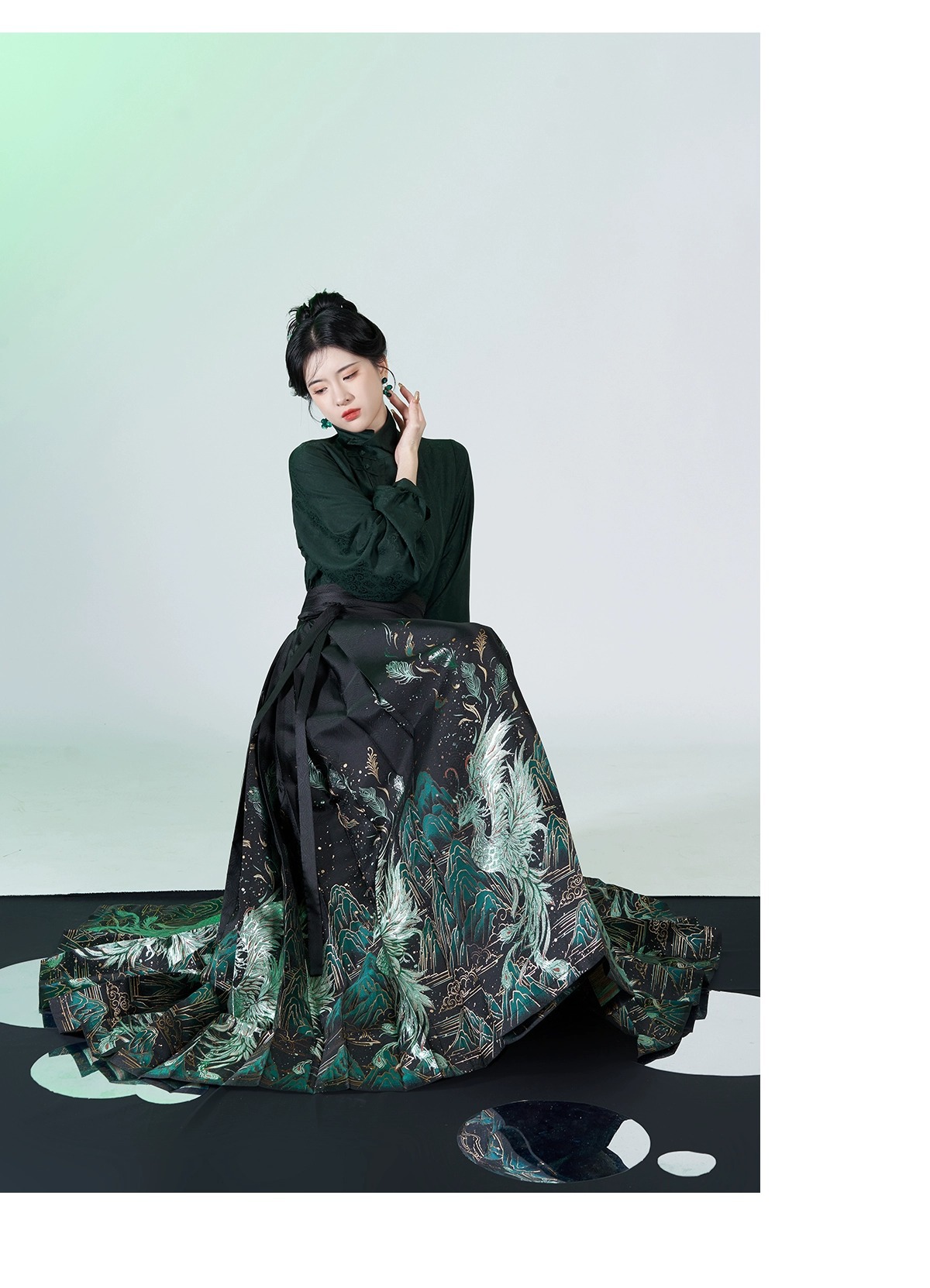 明制汉服半高领衬衫上衣仿妆花马面裙套装羽裳墨绿青羽马面裙