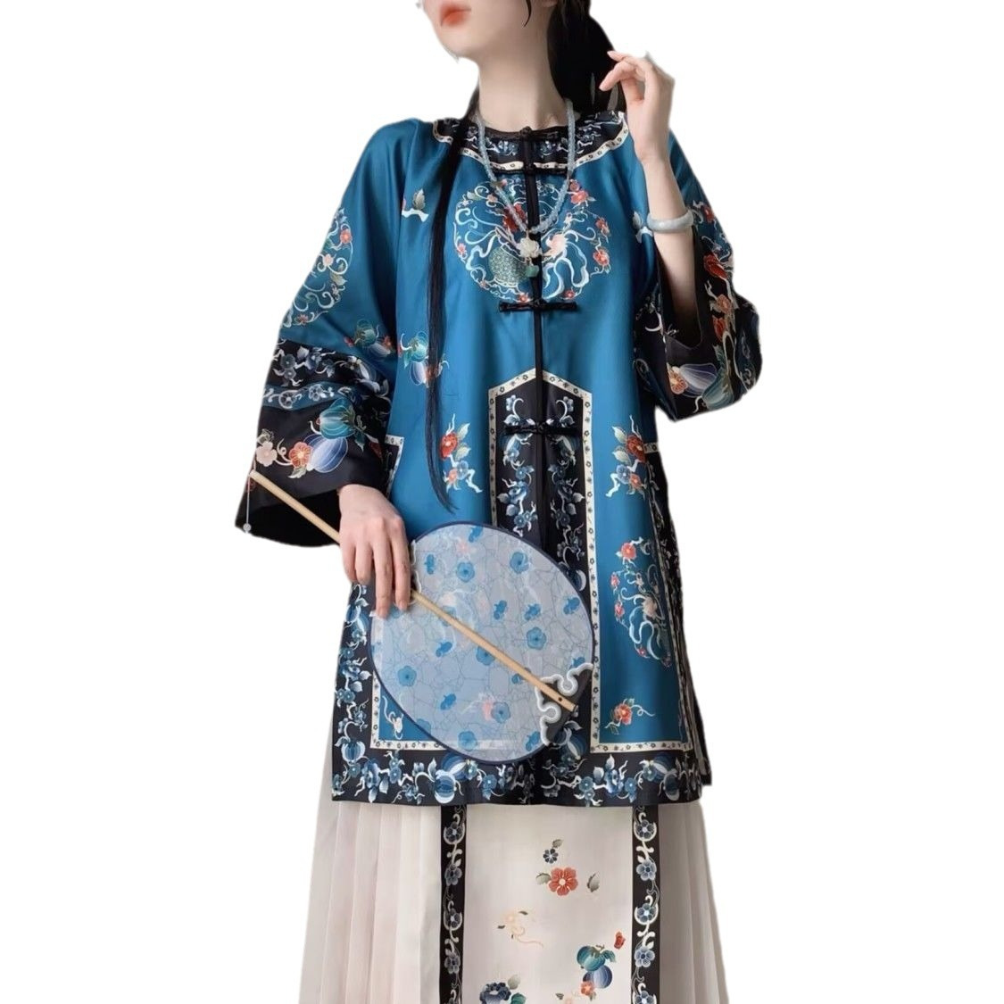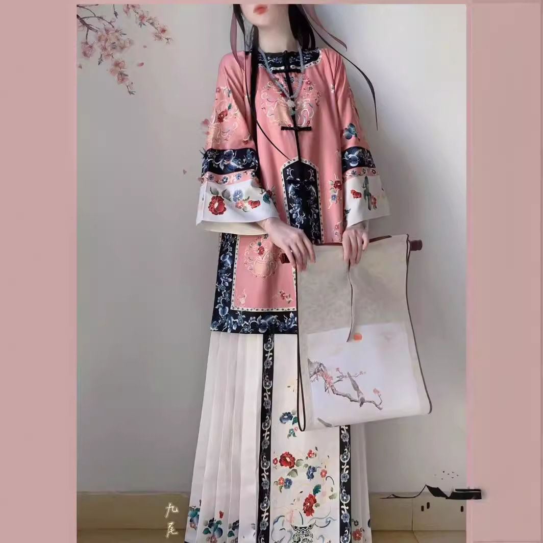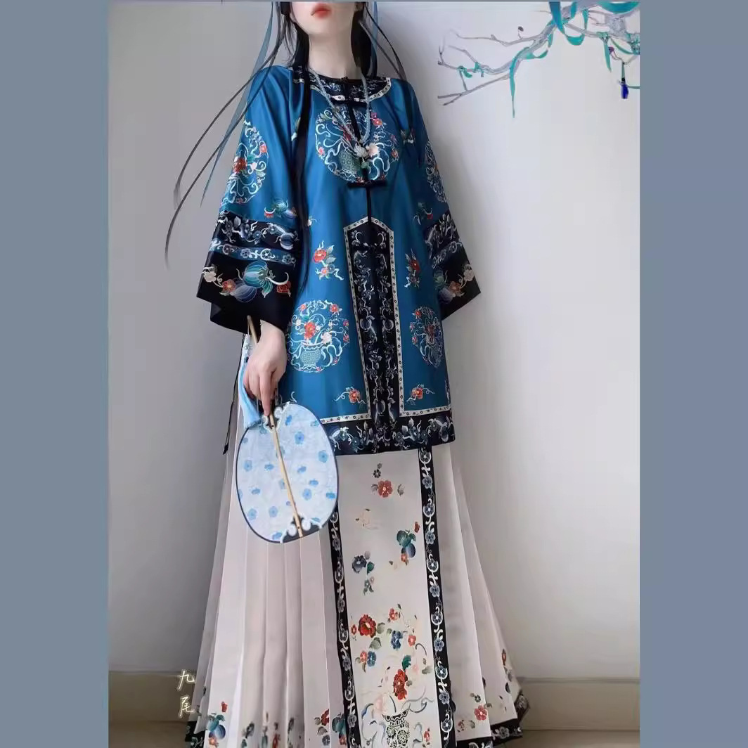 成人马面裙清制马面套装对襟圆领古董民族服装重工印花裙国风